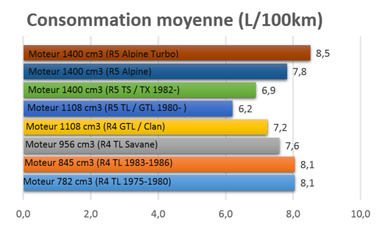 Les moteurs Cléon de 4L (956cm3 et 1108cm3) sont réputés pour être relativement sobre en carburant. Néanmoins, certains moteurs de R5, mieux optimisés, peuvent se révéler moins gourmand et pourtant plus puissant (surtout lorsqu’ils sont montés avec une boîte longue).