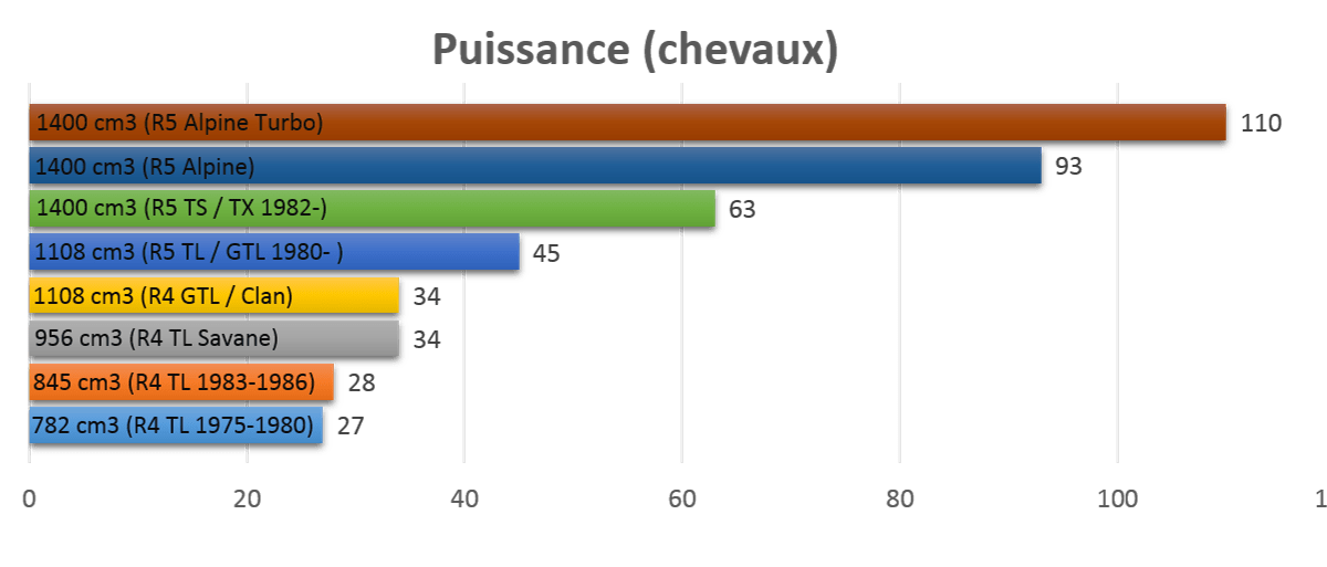 Si l’on compare les performances d’une 4L avec un moteur Cléon 34CV, et les performances de la même 4L montée avec un moteur de R5 TL/ GTL 45CV (boîte 4 vitesses de R5 TL), voici ce que l’on obtient en théorie :