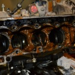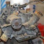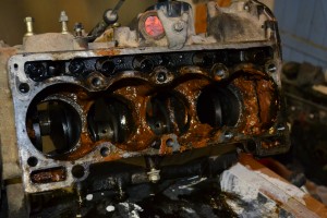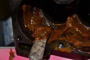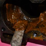 Avec les années, le circuit de liquide de refroidissement du moteur s’encrasse, d’autant plus si le moteur a chauffé ou qu’un mauvais liquide de refroidissement a été utilisé. Il se forme alors une boue dans le moteur (mélange de rouille, de saleté et de liquide de refroidissement) qui peut venir boucher le radiateur, les durites ou la pompe à eau, ce qui empêche le liquide de refroidissement de bien circuler et ainsi de jouer son rôle de régulateur thermique. Sur la 4L, la zone autour du 4e cylindre est également très souvent bouchée par de la boue et le cylindre se retrouve ainsi très mal refroidit. Pour preuve, voici en photo l’état dans lequel se trouvait la chambre de refroidissement des cylindres de mon moteur avant la restauration :