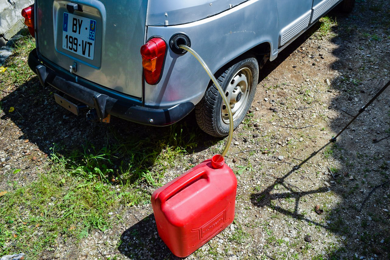 Puis remplissage avec un peu d’essence neuve, histoire de pouvoir aller faire le plein à la station ensuite !