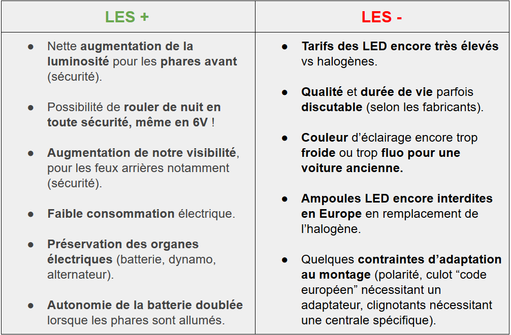 Voilà un petit tableau récapitulatif des principaux avantages et inconvénients des ampoules LED pour nos voitures anciennes :