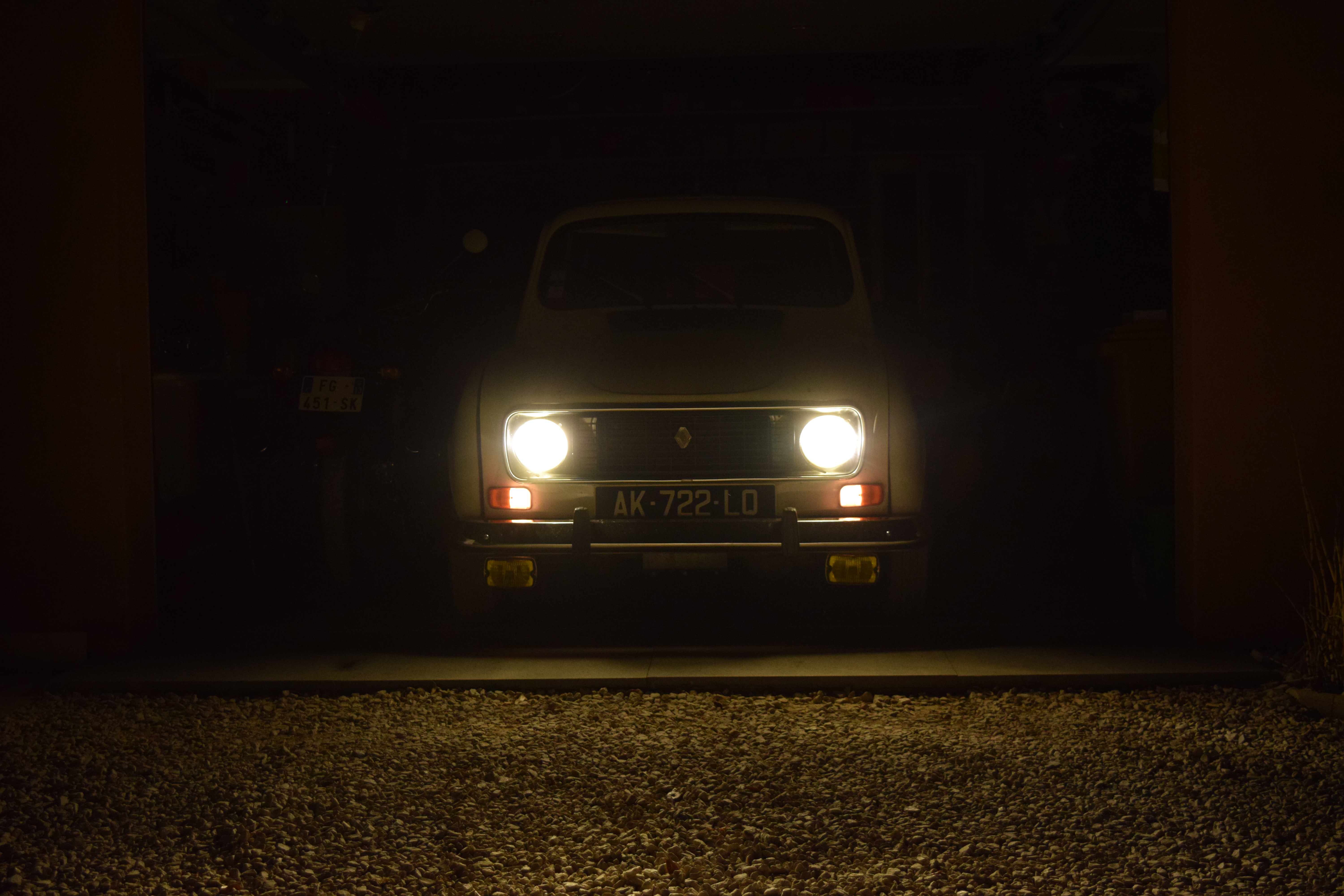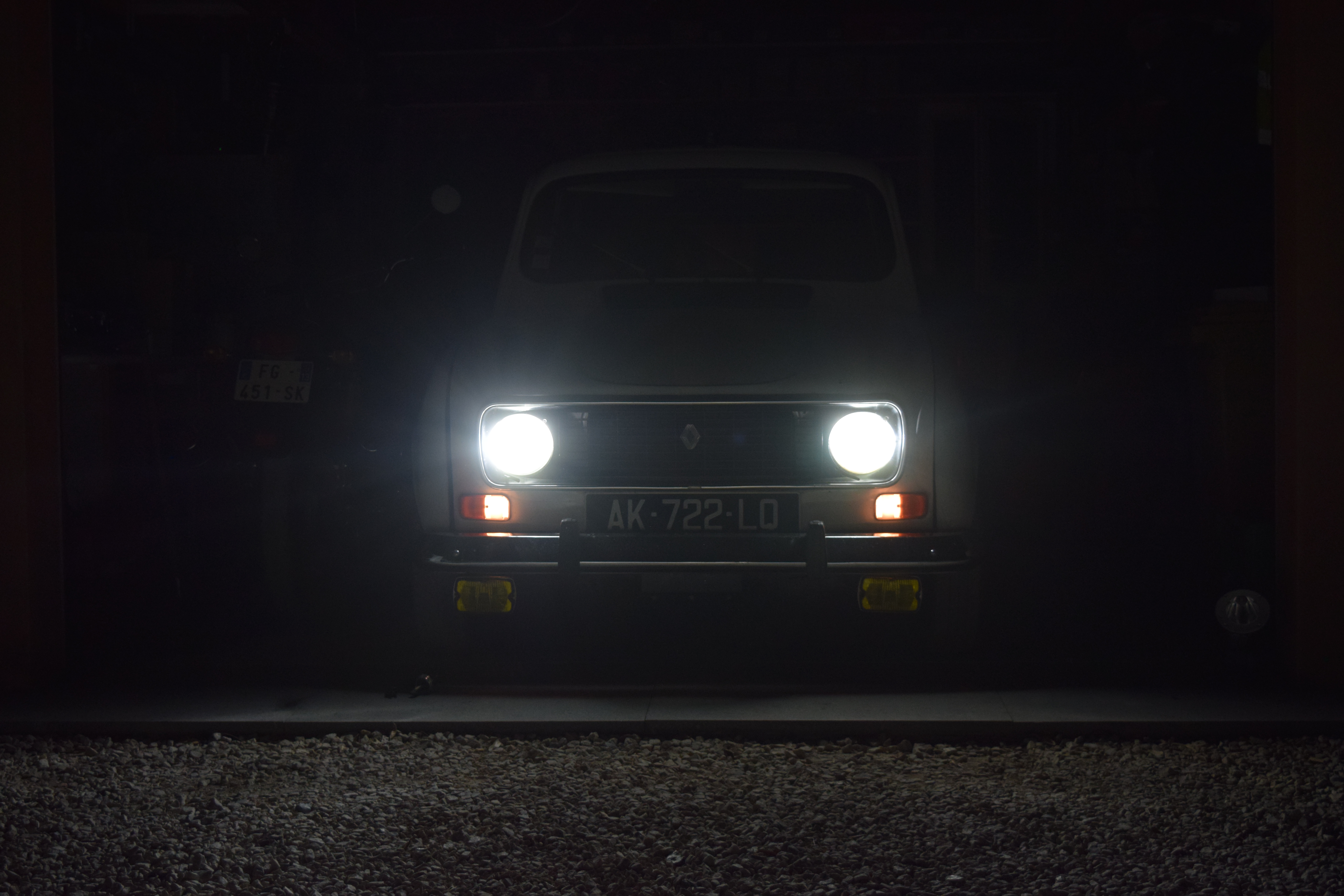 Pour ma part, j’ai choisi des ampoules blanc chaud (4300K) pour mes phares avant. Cela reste bien plus froid que l’halogène mais ça n’est pas trop flagrant et ça ne dénote pas trop avec la 4L. Je vous mets quelques photos pour que vous puissiez comparer les différentes couleurs des différentes ampoules :