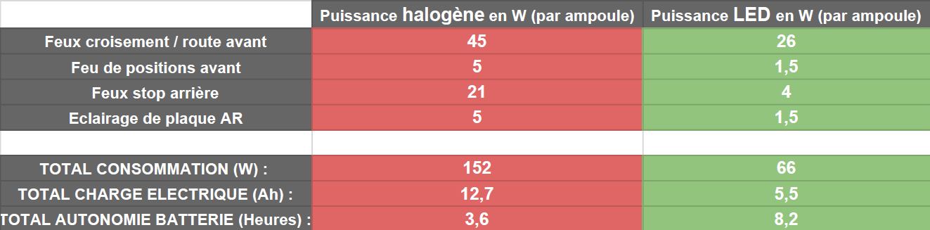 Après la sécurité à bord de nos anciennes, c’est le deuxième atout des ampoules LED : à côté des halogènes, elles ne consomment presque rien !
