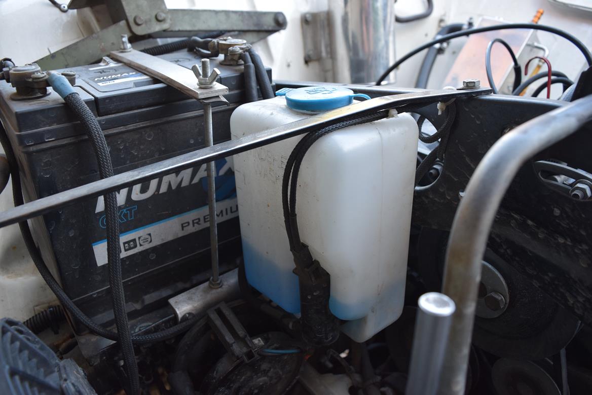 J’ai ici remplacé le bocal de lave-glace d’origine par un bocal avec pompe électrique intégré. Il est positionné exactement au même emplacement que celui d’origine, ça ne se voit donc absolument pas (photo de gauche). J’ai branché la pompe électrique à un interrupteur d’origine qui n’était pas utilisé sur le tableau de bord (photo de droite).
