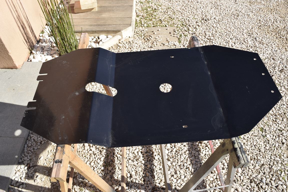 Vous l’aurez donc compris, il va falloir protéger tout ça. Comment ? On utilise pour protéger soit une plaque d’aluminium d’au moins 5 mm soit une plaque d’acier (ou d’inox) d’environ 2 ou 3 mm. Pour la plaque de protection du moteur, l’idéal est qu’elle soit en deux parties (cela facilite grandement le montage et le démontage) et qu’elle protège également la barre anti-roulis qui est très exposé et qui peut se tordre facilement.