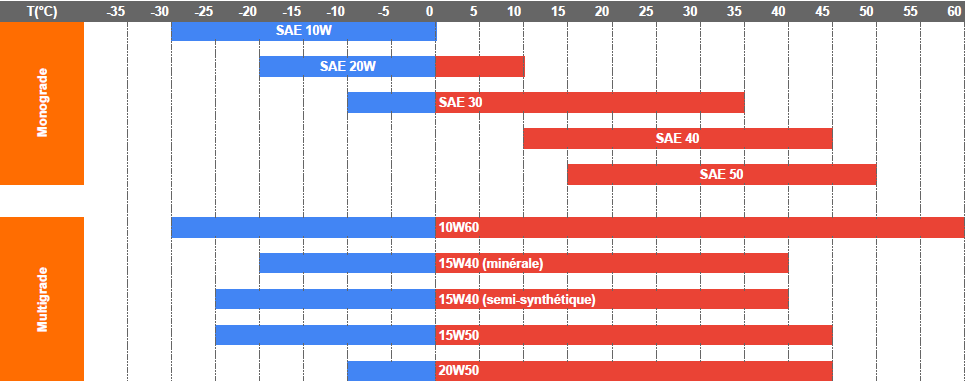 Le tableau ci-dessous vous donne les plages d’utilisation (selon la température ambiante) des différentes huiles monogrades et multigrades.