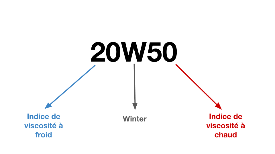 - 20W50 (par exemple) : Huile multigrade, indice de viscosité à froid de 20, indice de viscosité à chaud de 50.