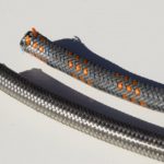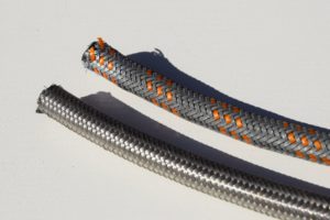 Constatez l’écart de qualité entre une durite tressée simple (avec liseré orange) dont nos venons de parler et une durite de qualité avec tresse inox (durite du bas sur la photo). Sur cette dernière, la tresse est bien plus dense et plus resserrée, gage d’une meilleure isolation et meilleure tenue dans le temps.