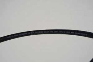 Sur la photo, un bon exemple d’un marquage complet sur la durite : marque, fabricant, diamètre interne et externe, normes respectées, températures de travail et pression de travail, date de fabrication.