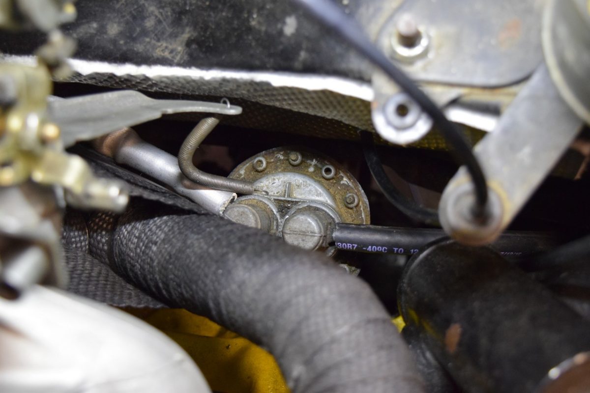 On peut le voir ici, la durite d’essence gainée passe très (trop) proche du collecteur d’échappement.