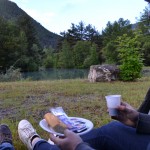 Réveil au lever du soleil autour du lac. Nous avions fait un petit campement de tentes avec d’autres équipages. Le cadre du bivouac est vraiment superbe, d’autant plus avec le soleil qui pointe son nez, après une journée du samedi très pluvieuse. On a donc décidé de prendre notre petit déjeuner dans la tente avec vu sur le lac. Sympa non ?