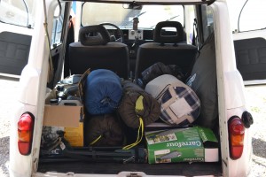 Une fois toute propre, on charge le coffre avec toutes les affaires nécessaires pour ces 2 jours : tente, matelas, duvets (on nous avait prévenu qu’il ferait très froid là-haut), tables et chaises de camping, pièces de rechange et surtout, on n’oublie pas les drapeaux… Cocorico !