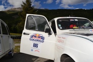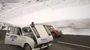 Départ pour cette 2ème journée du Red Bull Cocorico ! Avant de prendre la route, nous devons d’abord passer une épreuve de franchissement (facultative), une simple formalité pour la 4L Sortie de Grange ! On prend ensuite la direction du col de la Bonnette (plus haut col d’Europe à 2850 mètres) où nous attendent de magnifiques paysages enneigés. Malgré des températures en chute libre (moins de 5°C en haut du Col), l’exercice est difficile pour les 4L qui ont tendance à chauffer lorsque le dénivelé est important et que l’allure est faible. Les 2CV n’ont pas ce problème ! On laisse donc refroidir notre R4 et on en profite pour faire une petite pause photo et contempler le superbe paysage.