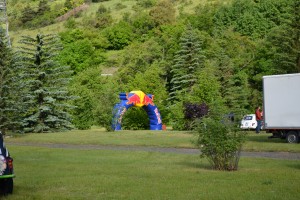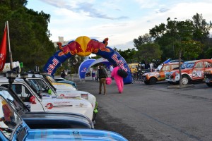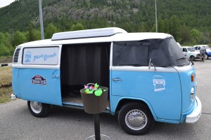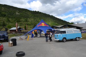 Une fois toutes les étapes obligatoires derrière nous, on profite du village départ. Evidemment, on commence par nous désaltérer avec une canette de… Red Bull, original non ? Ce fut la première d’une très longue série et d’une belle collection à la fin de la course ! Mise en ambiance tout en musique grâce au 4×4-DJ, un vrai monstre, qui nous suivra à chaque étape du Red Bull Cocorico. L’attraction de ce village départ : le Photo Combi, un Volkswagen Combi transformé en cabine photo, avec toutes sortes d’accessoires à disposition pour faire des clichés (ridicules ?) type années 80. On a certes un peu monopolisé la cabine, mais quelles réussites ces photos !