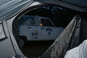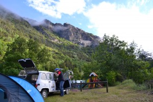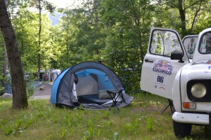 Le circuit des Glaces commence à se vider progressivement de ses concurrents. Il est temps pour nous aussi de prendre la direction du camping le plus proche où nous pourrons planter la tente cette nuit, et être en forme le lendemain pour le départ officiel. Sur la route, on en profite pour faire un tour au supermarché du coin pour le pique-nique du soir. Une 4L, une tente, de l’herbe verte, de la musique, des chips et du saucisson, que demander de plus ? So French!