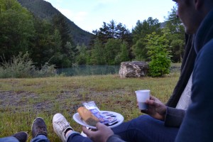 Réveil au lever du soleil autour du lac. Nous avions fait un petit campement de tentes avec d’autres équipages. Le cadre du bivouac est vraiment superbe, d’autant plus avec le soleil qui pointe son nez, après une journée du samedi très pluvieuse. On a donc décidé de prendre notre petit déjeuner dans la tente avec vu sur le lac. Sympa non ?