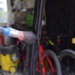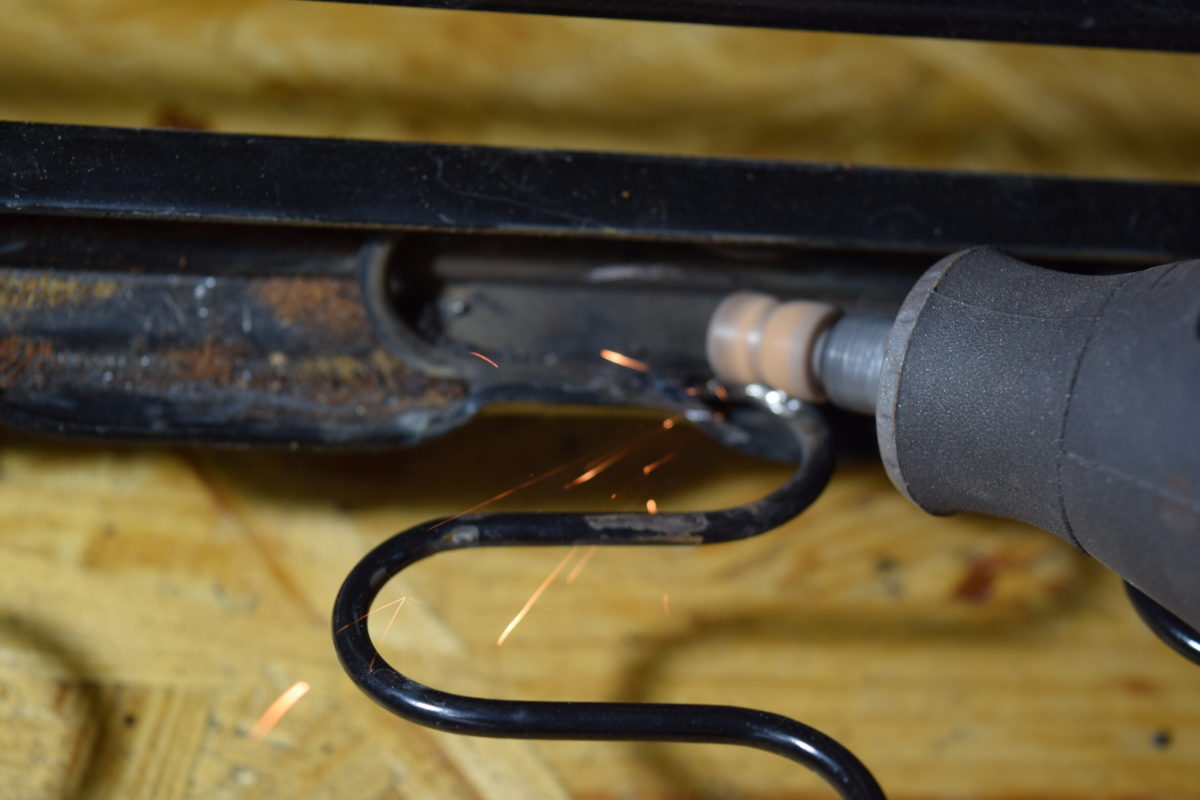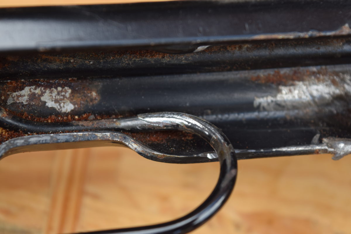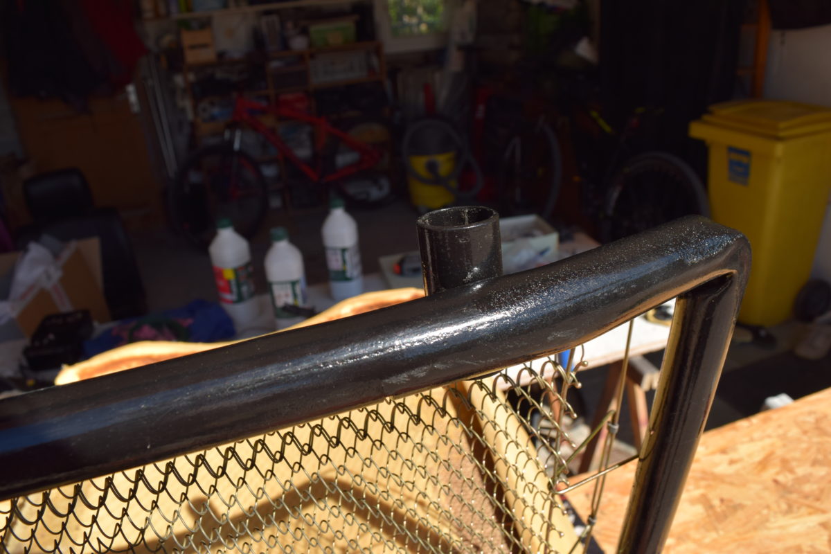 La peinture était bien défraichie et le métal attaqué à certains endroits. J’ai donc légèrement brossé les zones corrodées puis j’ai appliqué de la peinture anti-corrosion noir brillant.