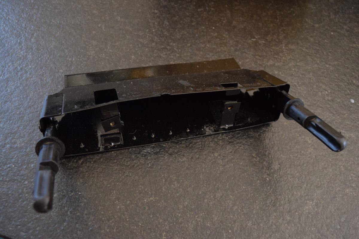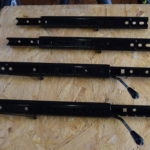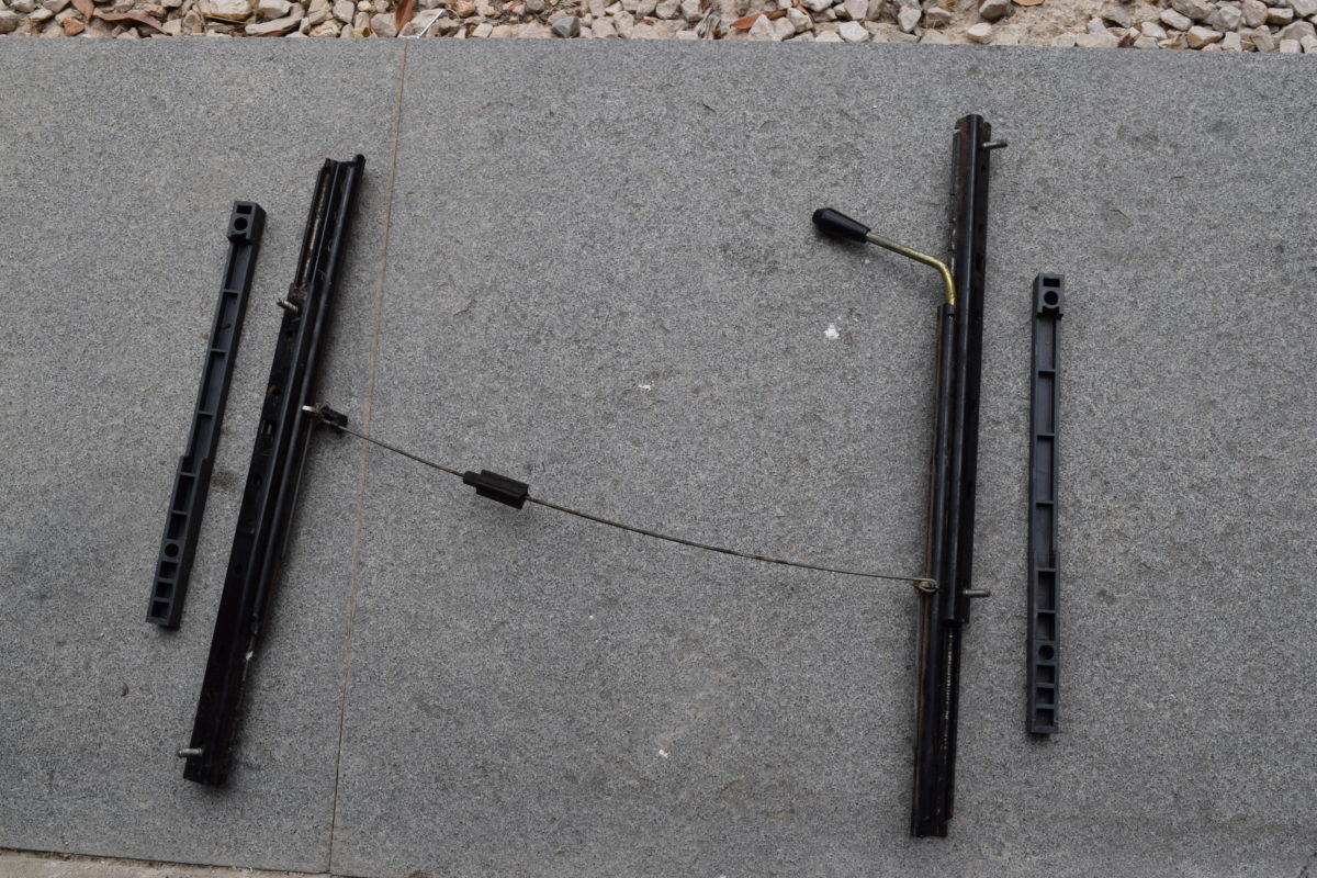 Les glissières étaient plutôt en bon état, mais la peinture a quelques accrocs et le métal a légèrement rouillé par endroit. J’ai donc voulu les rafraichir : brossage, ponçage puis peinture. Voilà un petit avant / après :