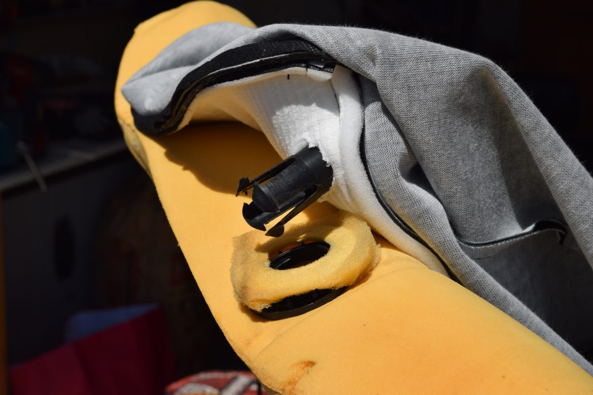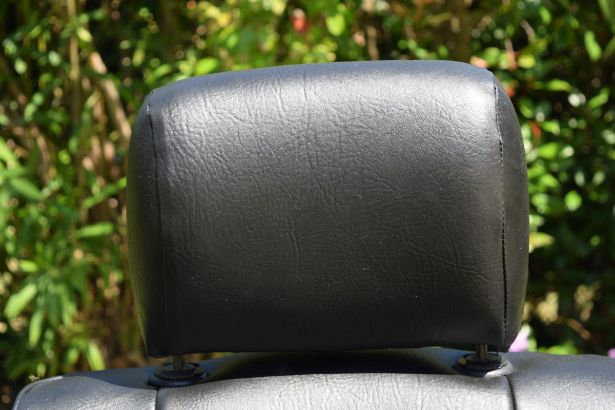 Le simili des appuies-têtes sera également à changer. Bonne nouvelle en revanche, la structure des appuies-tête n’est pas cassée, et les pièces en plastique permettant de les bloquer ne sont pas cassées (ces pièces sont généralement assez fragiles). Les 2 appuies-tête ont néanmoins pas mal de jeu, qu’il va falloir rectifier. Il faudra également recoller la mousse, qui ne tient plus du tout sur la structure !