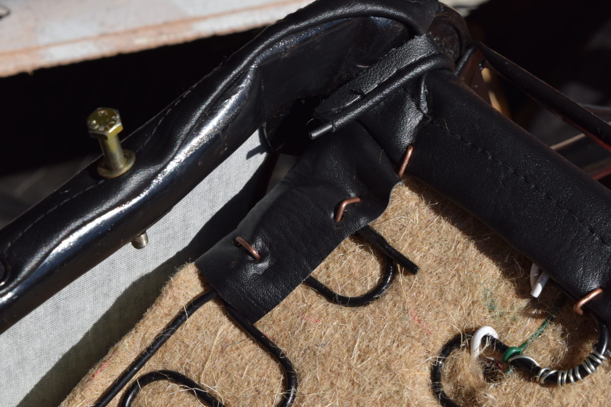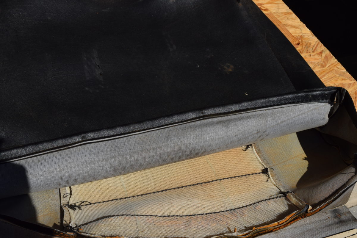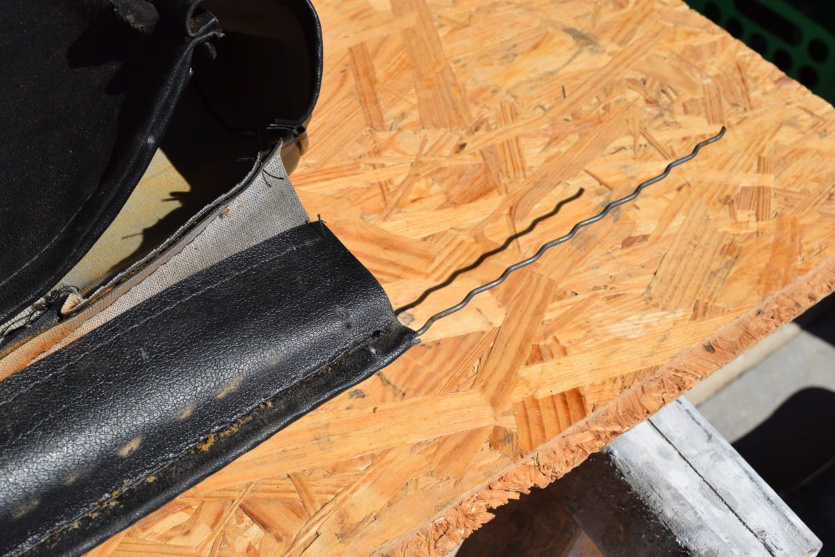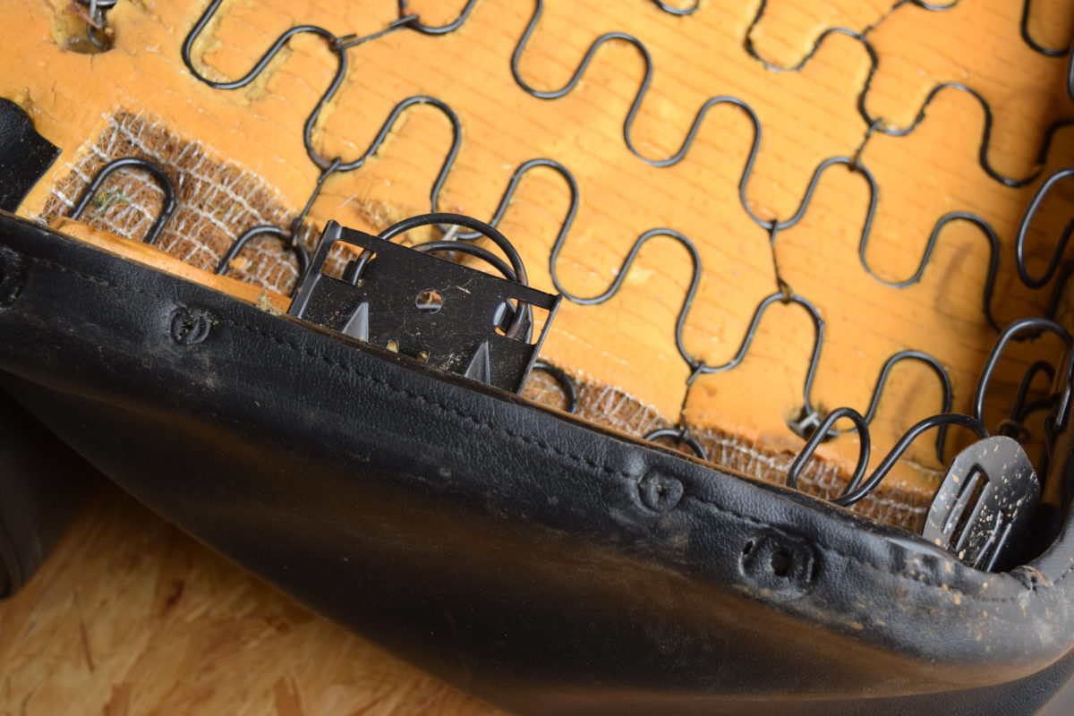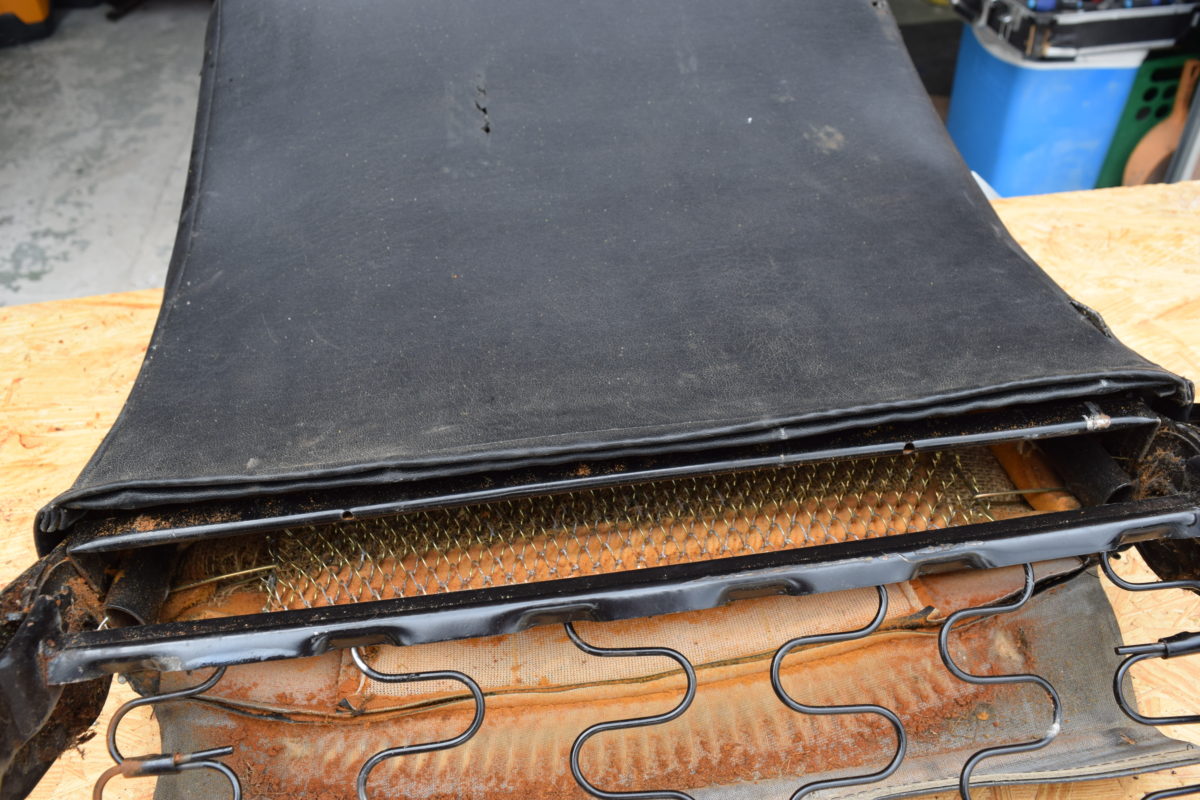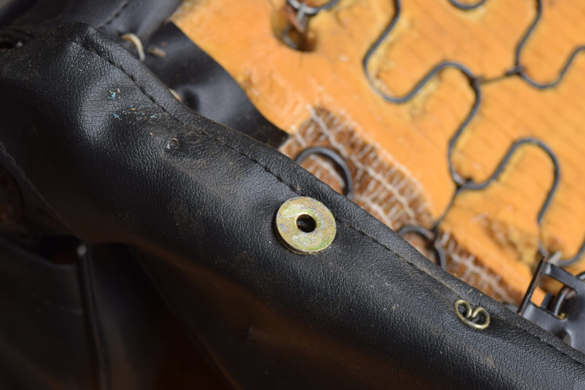 Un petit aperçu de l’état de la garniture. L’extérieur du simili cuir est bien déchiré et à l’intérieur, la mousse de la garniture entoilée s’est complètement désintégrée (mousse orange que l’on peut voir sur la photo). Cette mousse permet de réaliser le côté matelassé de la sellerie, quand elle est neuve. Ici, il n’y a plus de mousse, ce qui fait que l’assise est complètement plate. Vous pouvez également voir la tige métallique dont on a parlé précédemment et qui sert à tendre la garniture en profondeur.