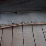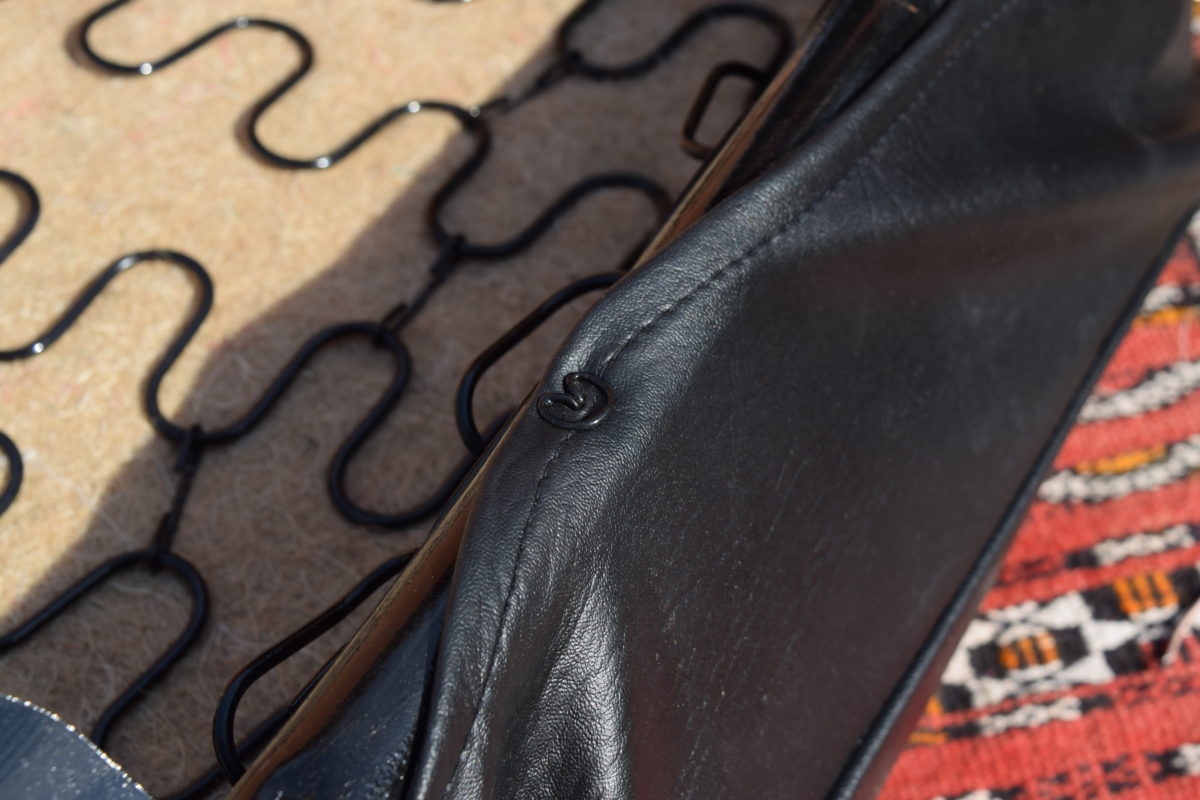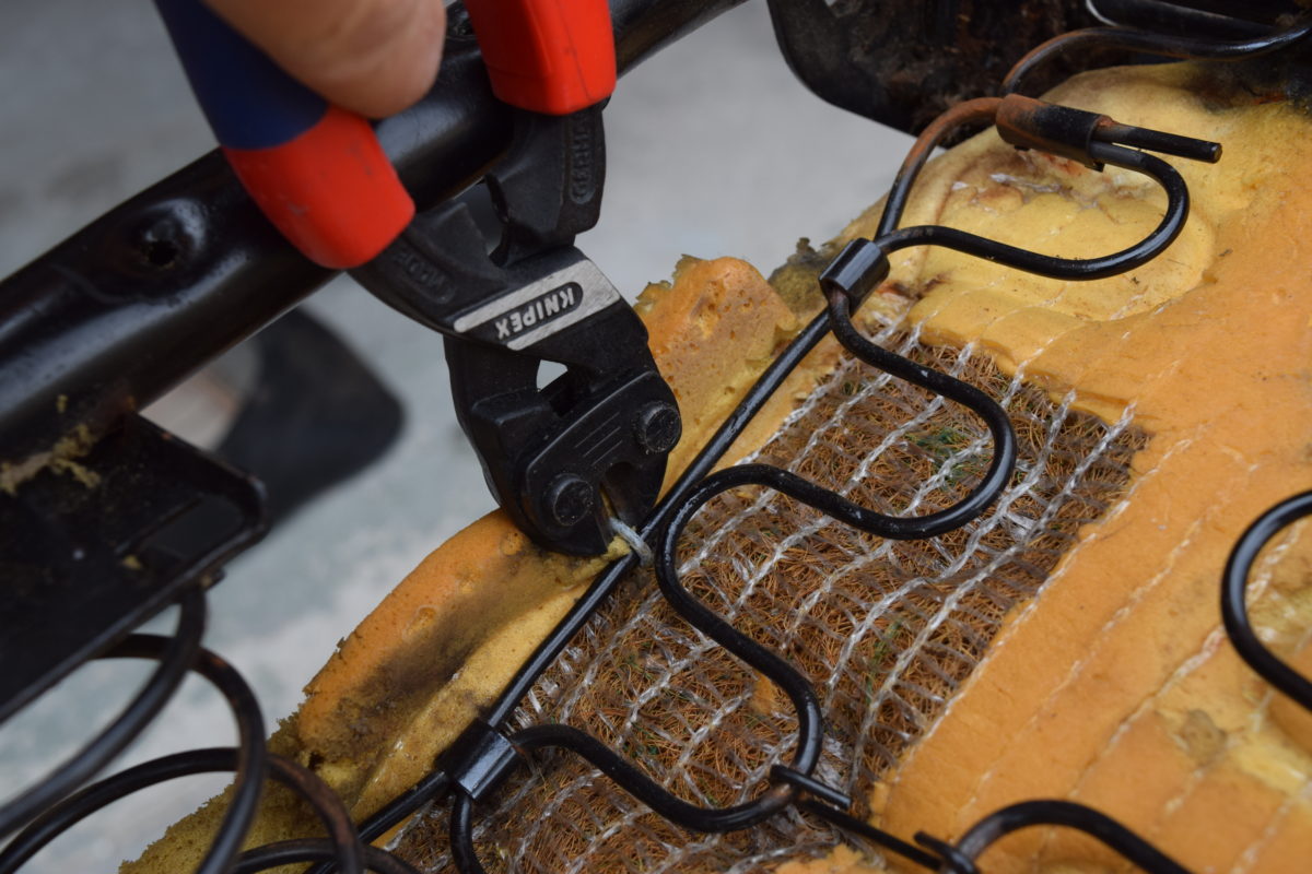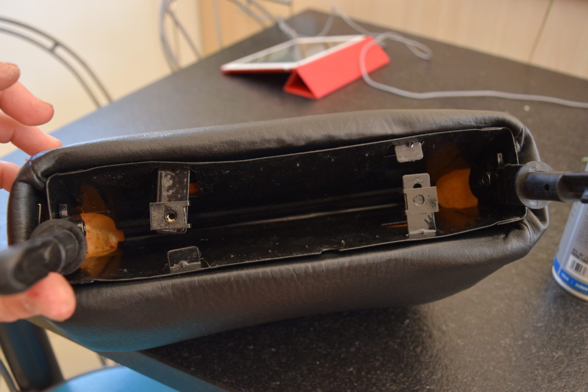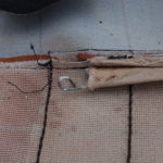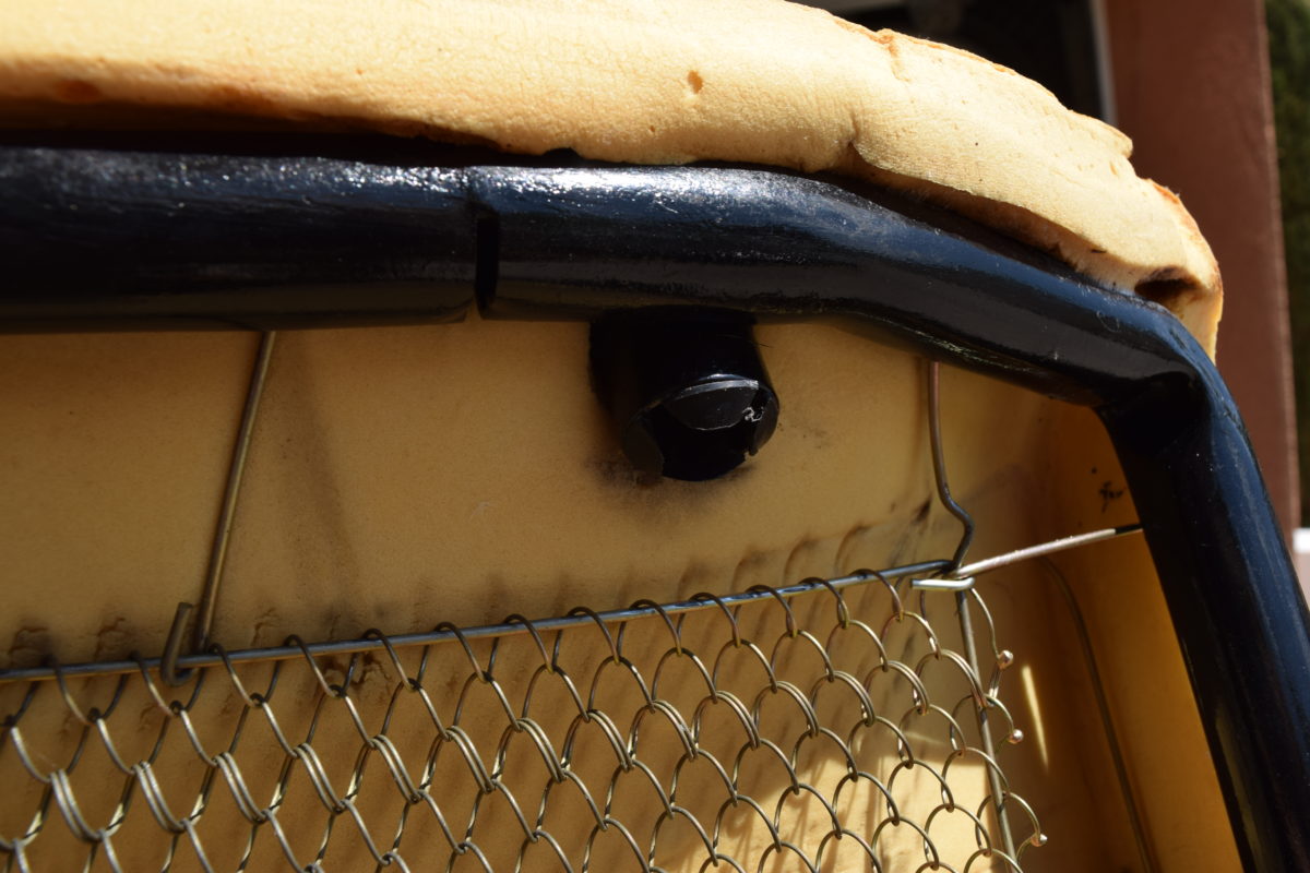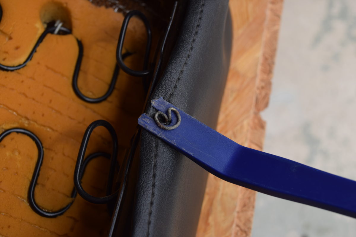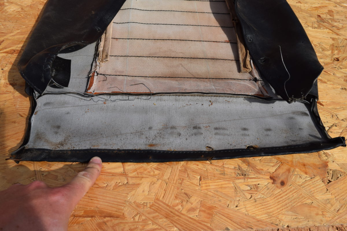 Un petit aperçu de l’état de la garniture. L’extérieur du simili cuir est bien déchiré et à l’intérieur, la mousse de la garniture entoilée s’est complètement désintégrée (mousse orange que l’on peut voir sur la photo). Cette mousse permet de réaliser le côté matelassé de la sellerie, quand elle est neuve. Ici, il n’y a plus de mousse, ce qui fait que l’assise est complètement plate. Vous pouvez également voir la tige métallique dont on a parlé précédemment et qui sert à tendre la garniture en profondeur.