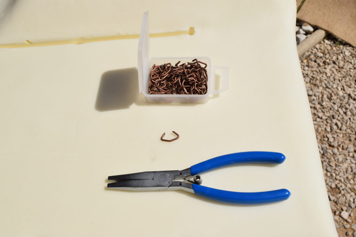 1. Avant de mettre les agrafes nez de cochon avec la pince, je tend d’abord avec du fils de fer de grillage à la place de quelques agrafes (1 sur 2) le temps de mettre quelques agraffes et ceci beaucoup plus facilement. Puis je retire et remplacer le fil de fer par les agrafes suivantes.