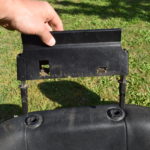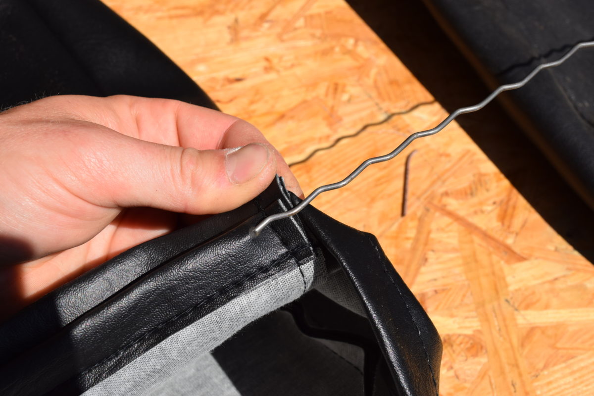 2. Pour tendre la partie assise, comme la mousse est plus haute et plus dense du coup c’est assez compliquer (Avec le risque de déchirer le simili ou tissus sur les premières fixations, malgré le fil de fer). L’astuce consiste a déplier le dossier du siège le mettre avec la housse à l’envers sur une table et a compresser la mousse entre une table ou une planche plus large et la structure du siège grâce à une sangle à cliquet ce qui permettra de fixer très facilement les premières agrafes et clips.