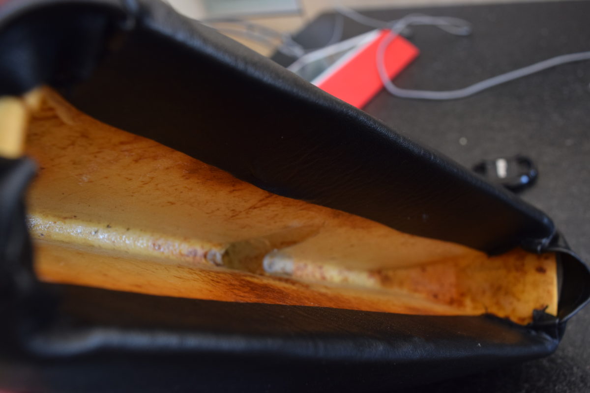 Comme je l’ai dit plus haut, on peut voir que la mousse neuve n’est pas renforcée sur le dessous comme celle d’origine et les rebords sont moins marqués (peut-être que le rebords sont dû à l’usure !).