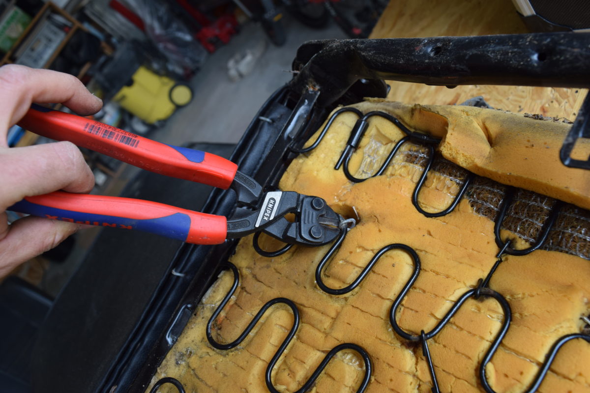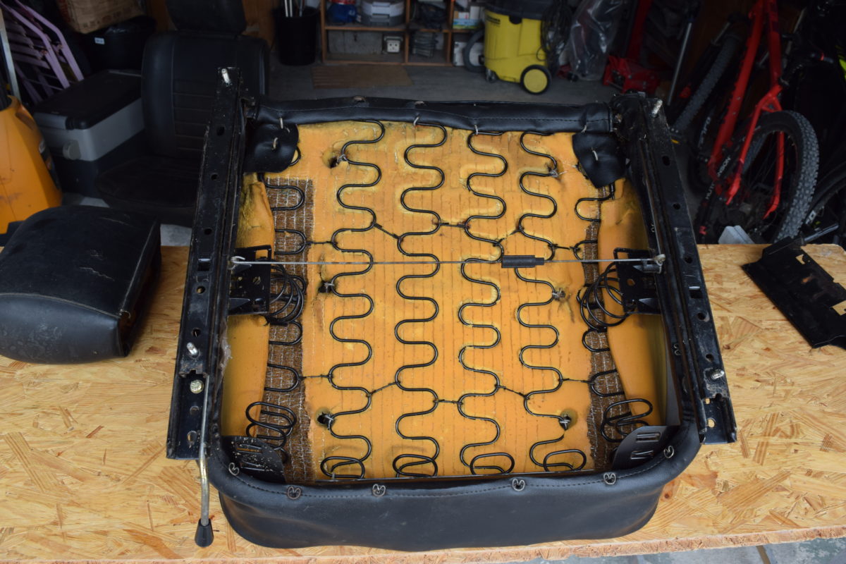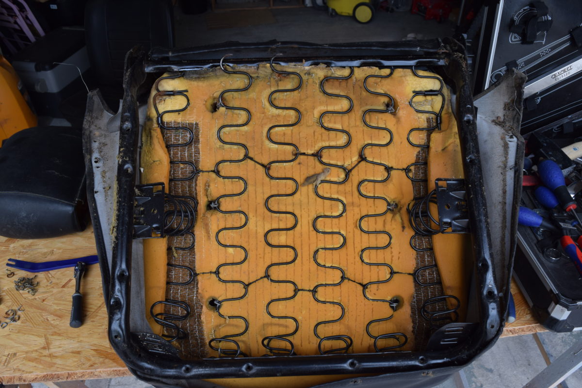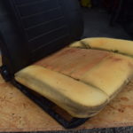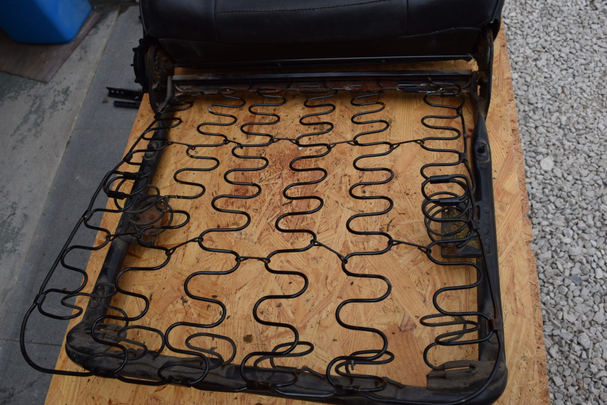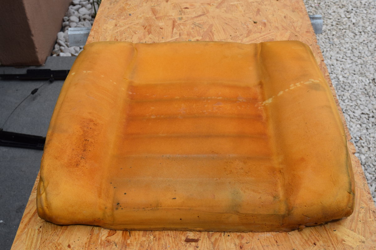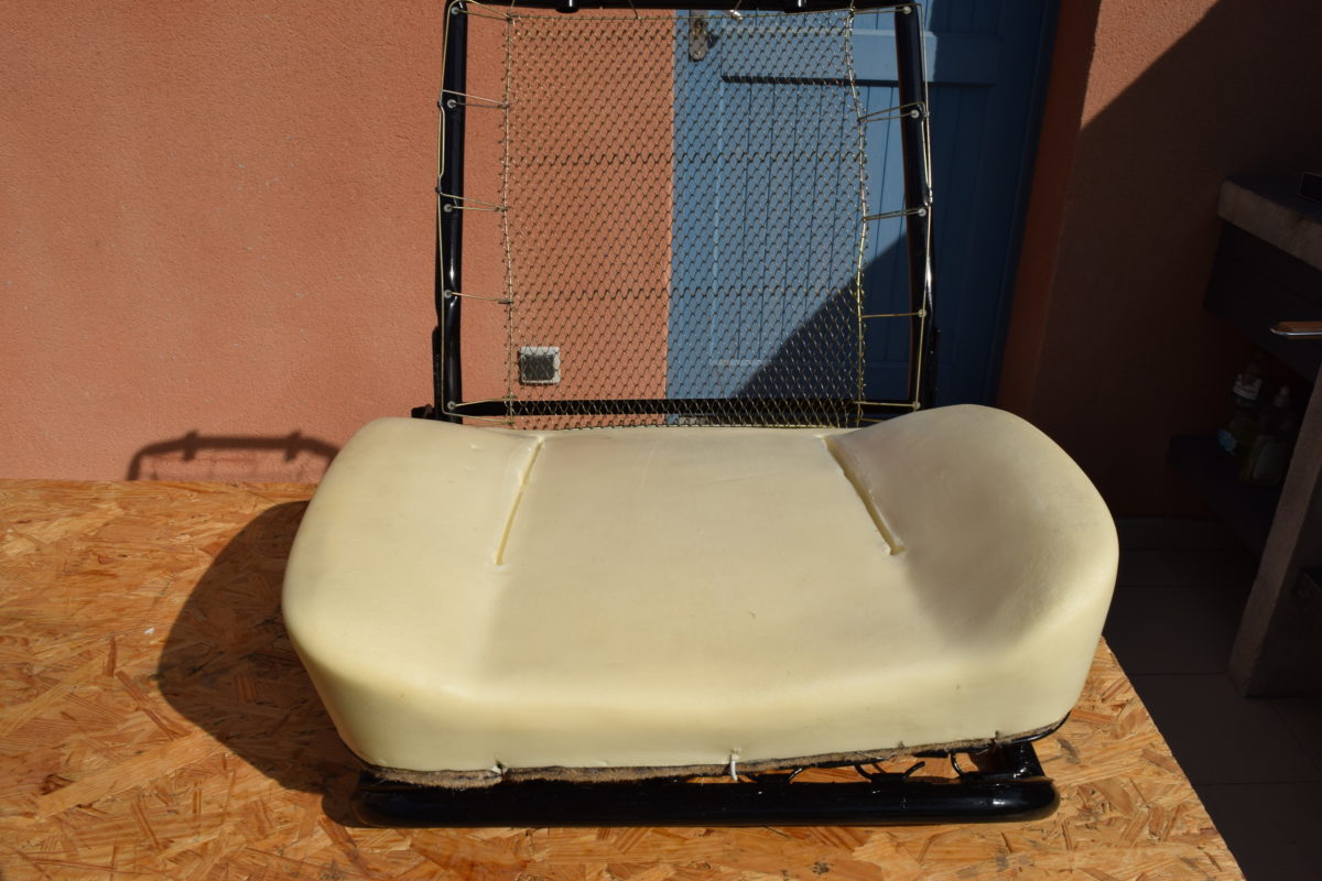 La mousse de l’assise du siège conducteur que l’on voit ici en photo est bien abîmée. Il manque de la matière à plusieurs endroits et surtout, elle s’est vraiment bien affaissée ! Je vais donc devoir la remplacer. La mousse côté passager est logiquement moins abîmée, je peux la conserver.