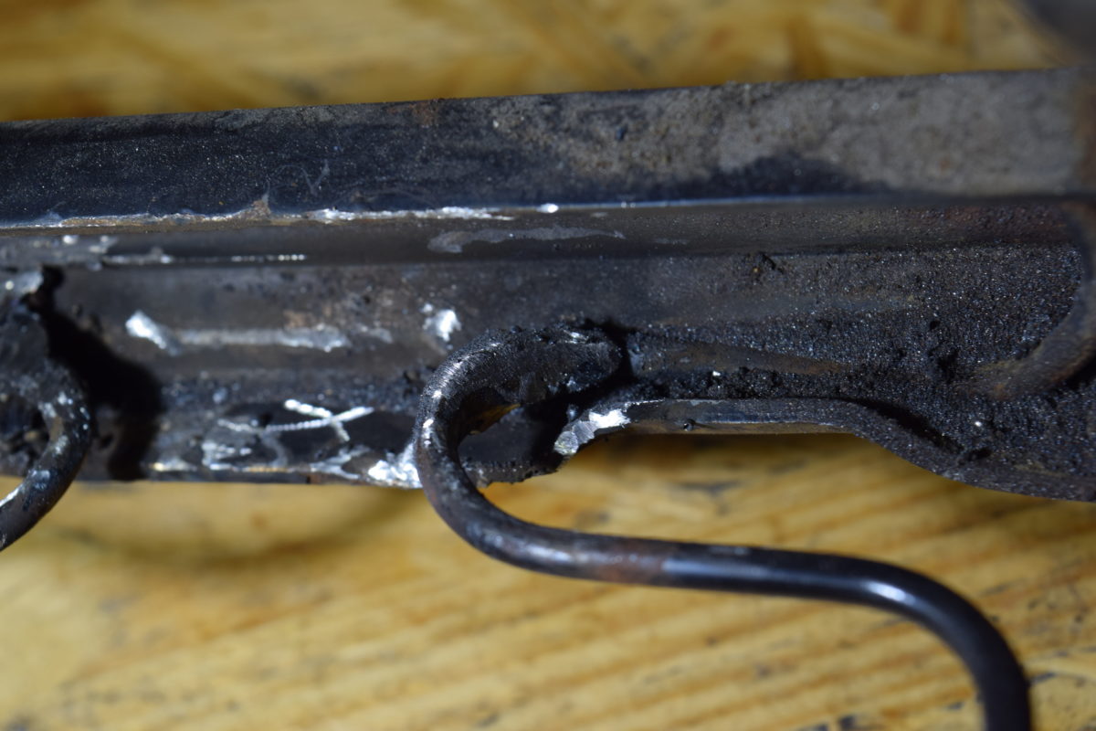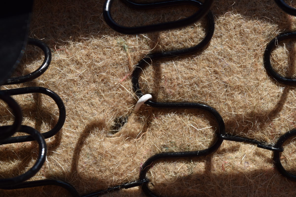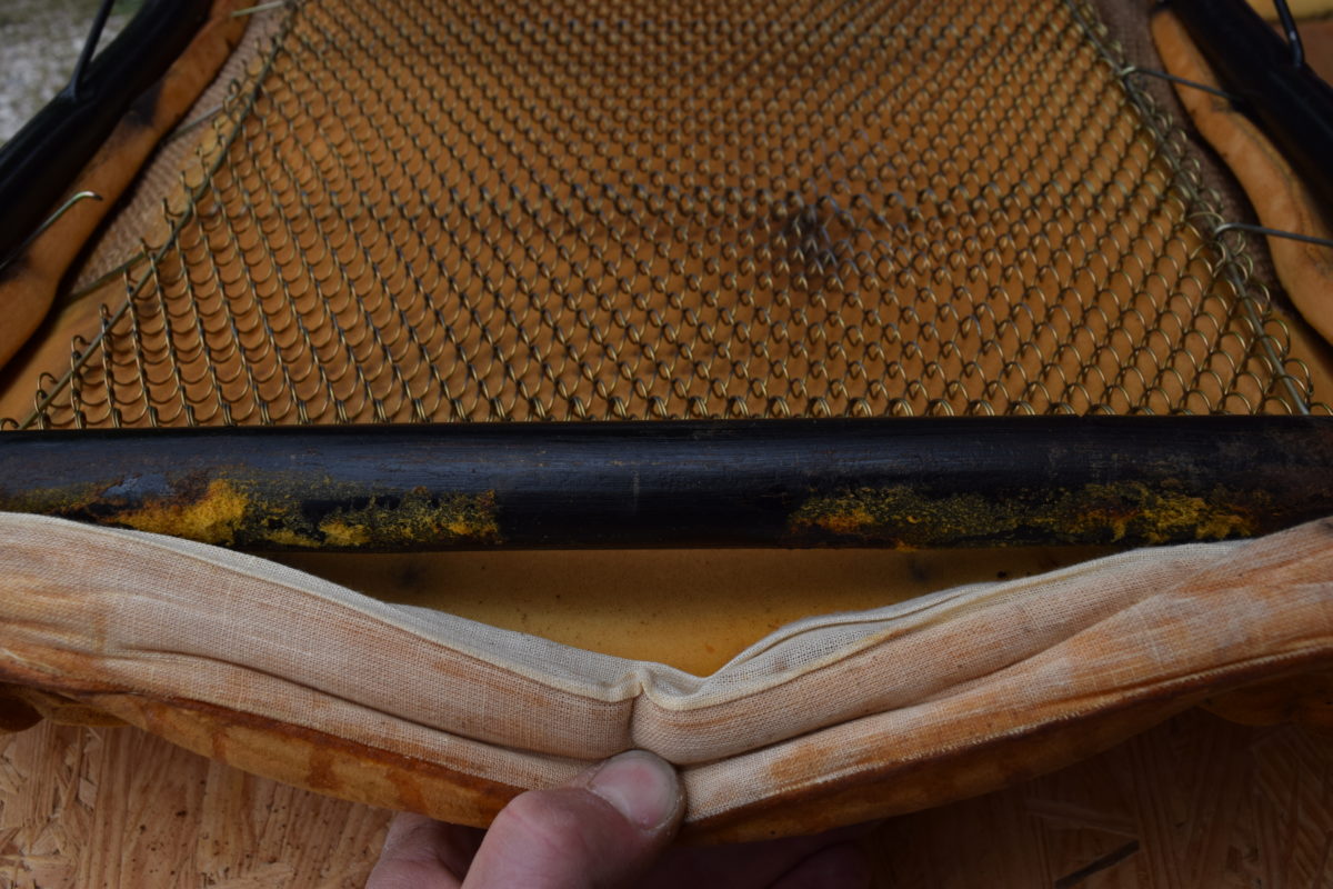 Comme on l’a vu précédemment, certains ressorts de la structure de l’assise se sont cassés avec le temps. Il va falloir les réparer pour rétablir une bonne assise. Mais il y a d’autres éléments de la structure à réparer : une tige à l’arrière du dossier qui permet de tendre la garniture qui a rompu ainsi que la barre horizontale en bas du dossier qui est elle complètement déformée.
