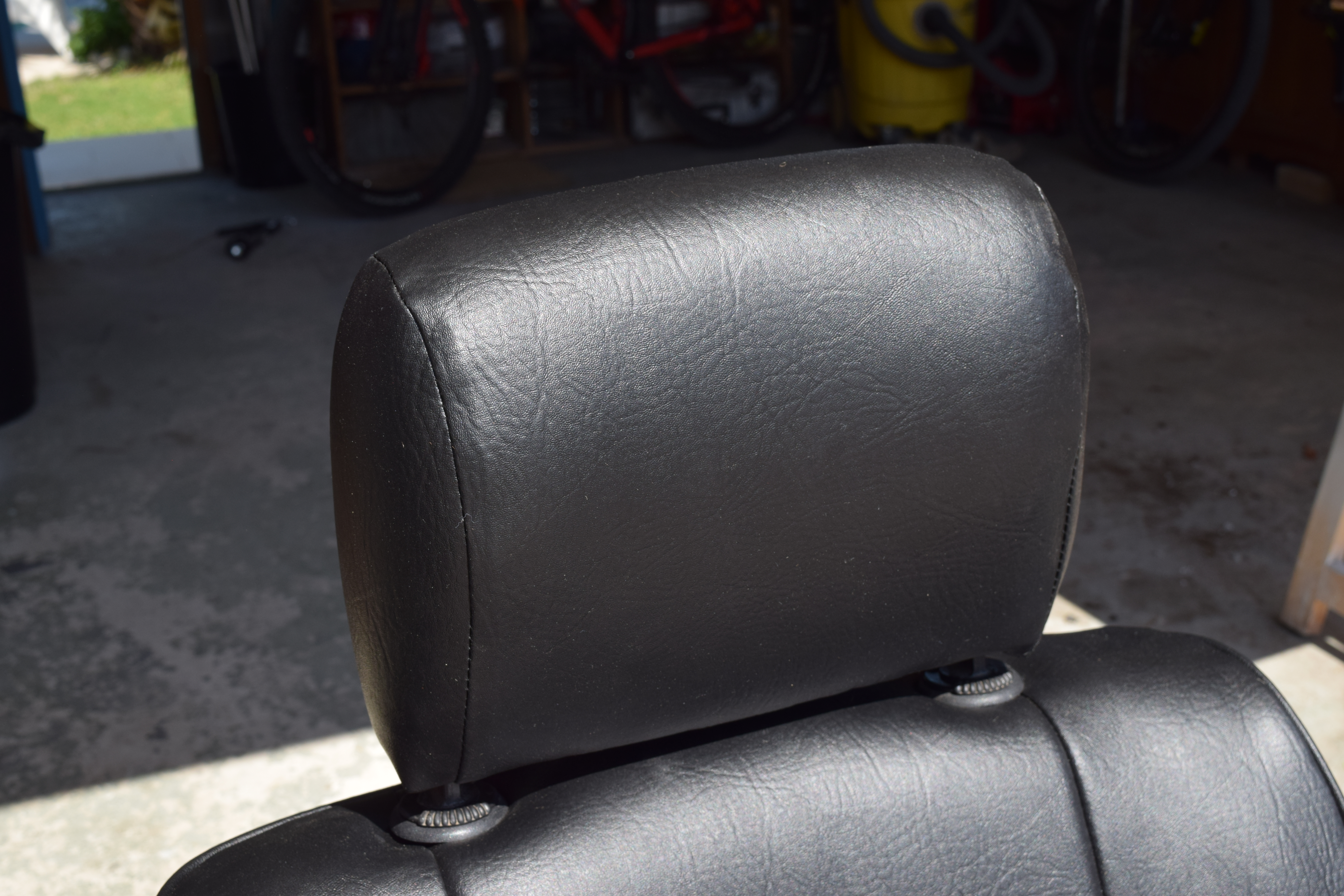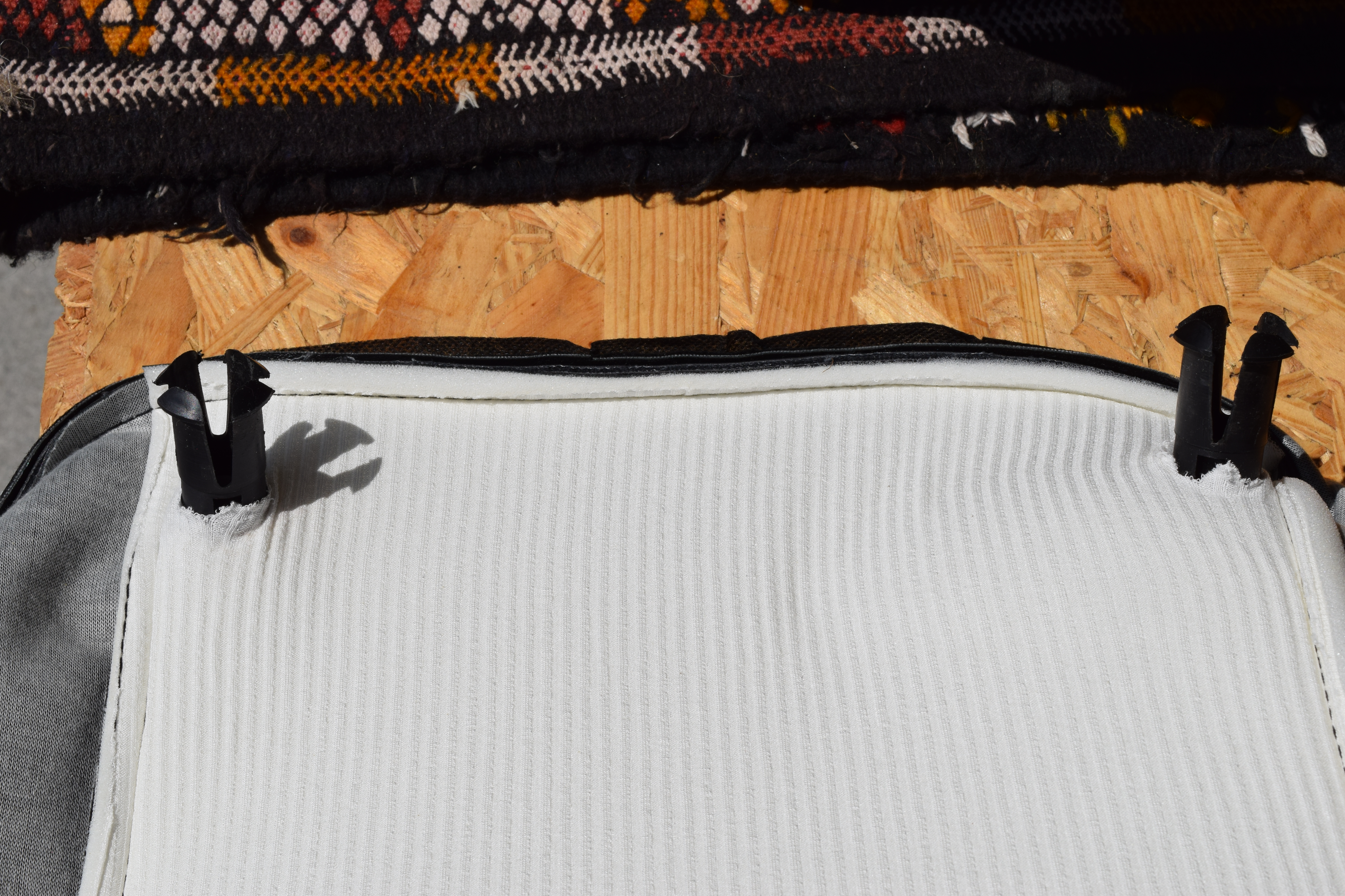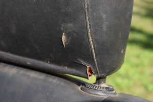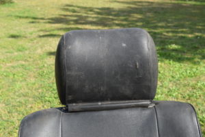 Le simili des appuies-têtes sera également à changer. Bonne nouvelle en revanche, la structure des appuies-tête n’est pas cassée, et les pièces en plastique permettant de les bloquer ne sont pas cassées (ces pièces sont généralement assez fragiles). Les 2 appuies-tête ont néanmoins pas mal de jeu, qu’il va falloir rectifier. Il faudra également recoller la mousse, qui ne tient plus du tout sur la structure !