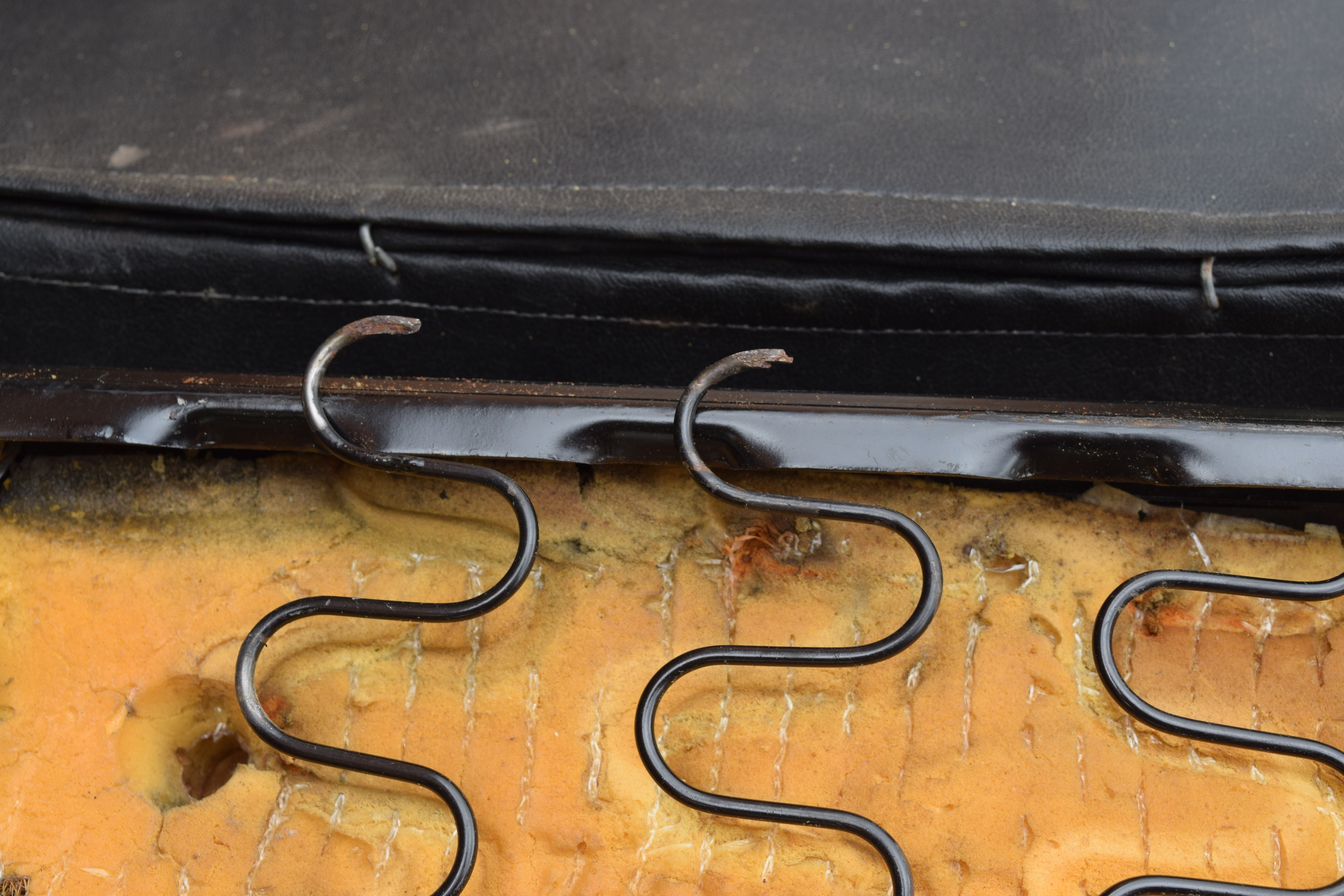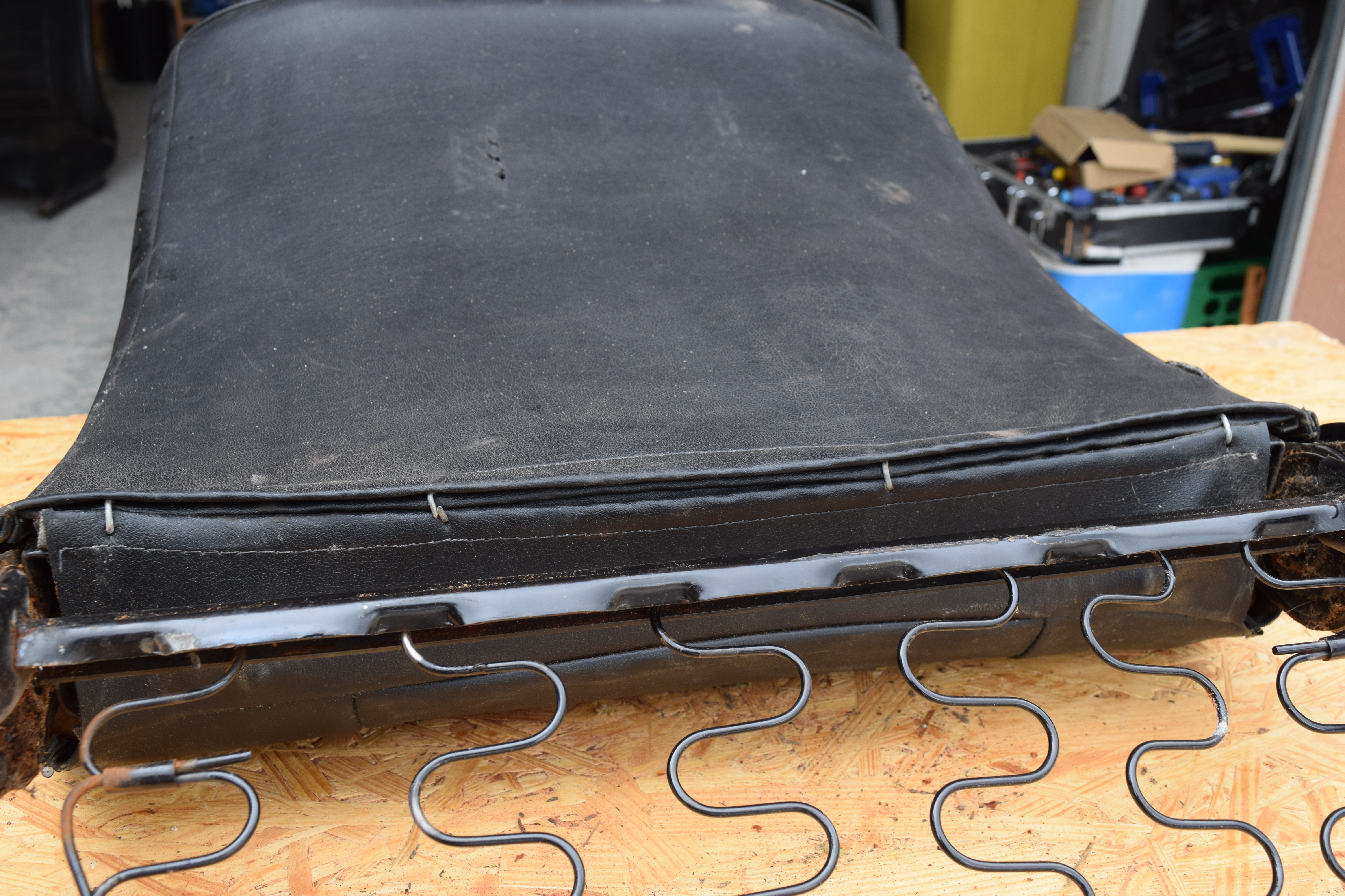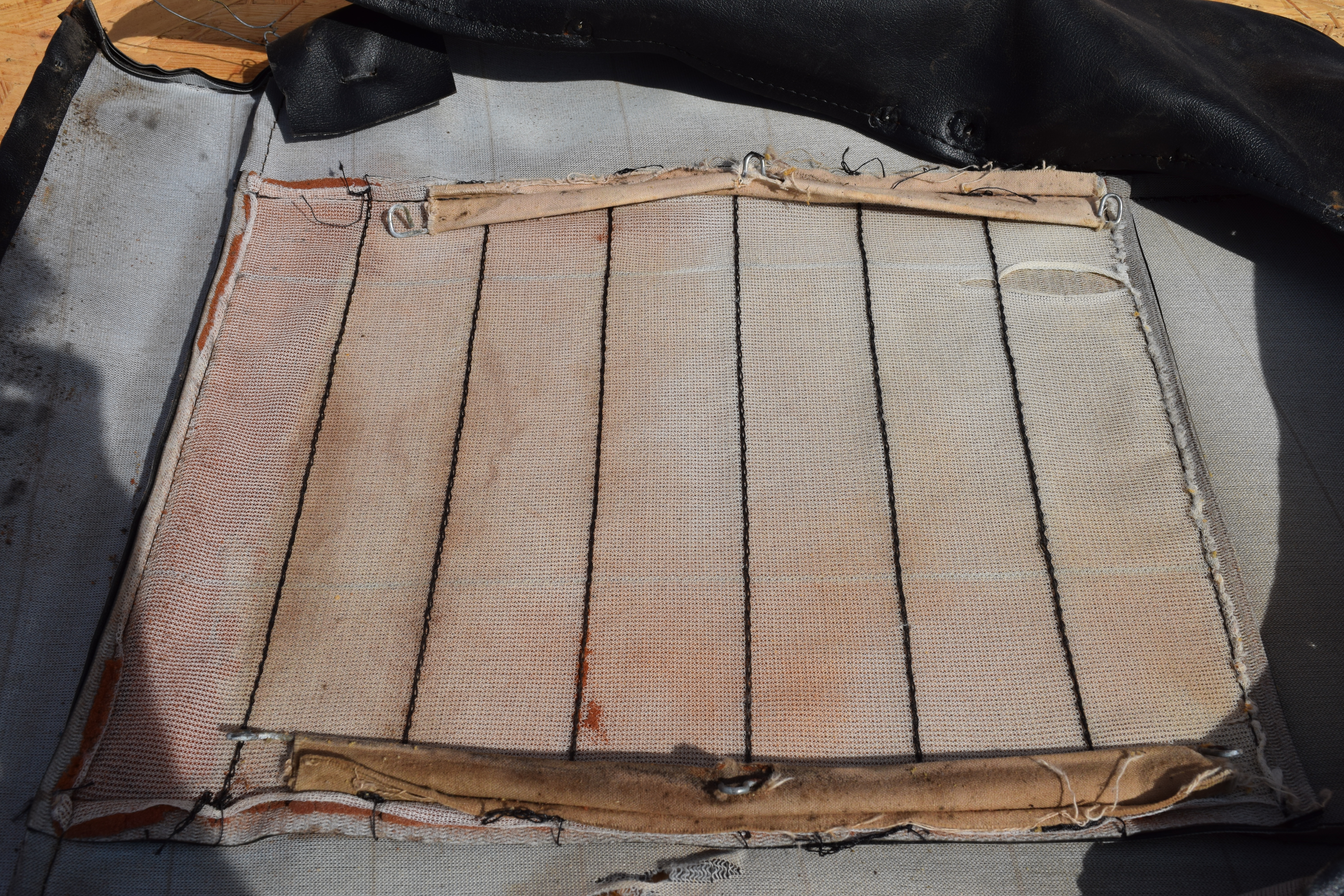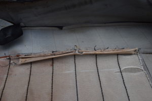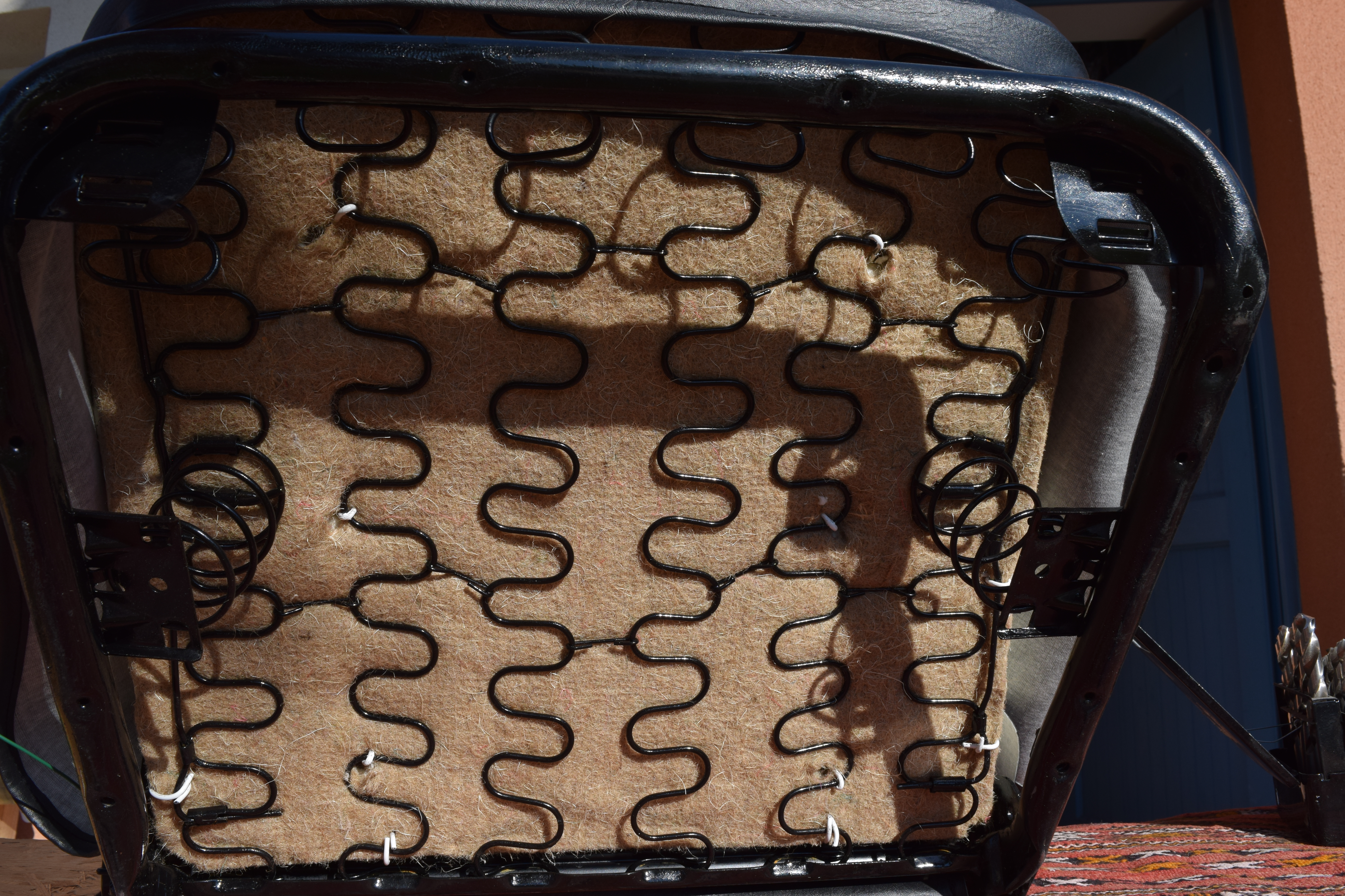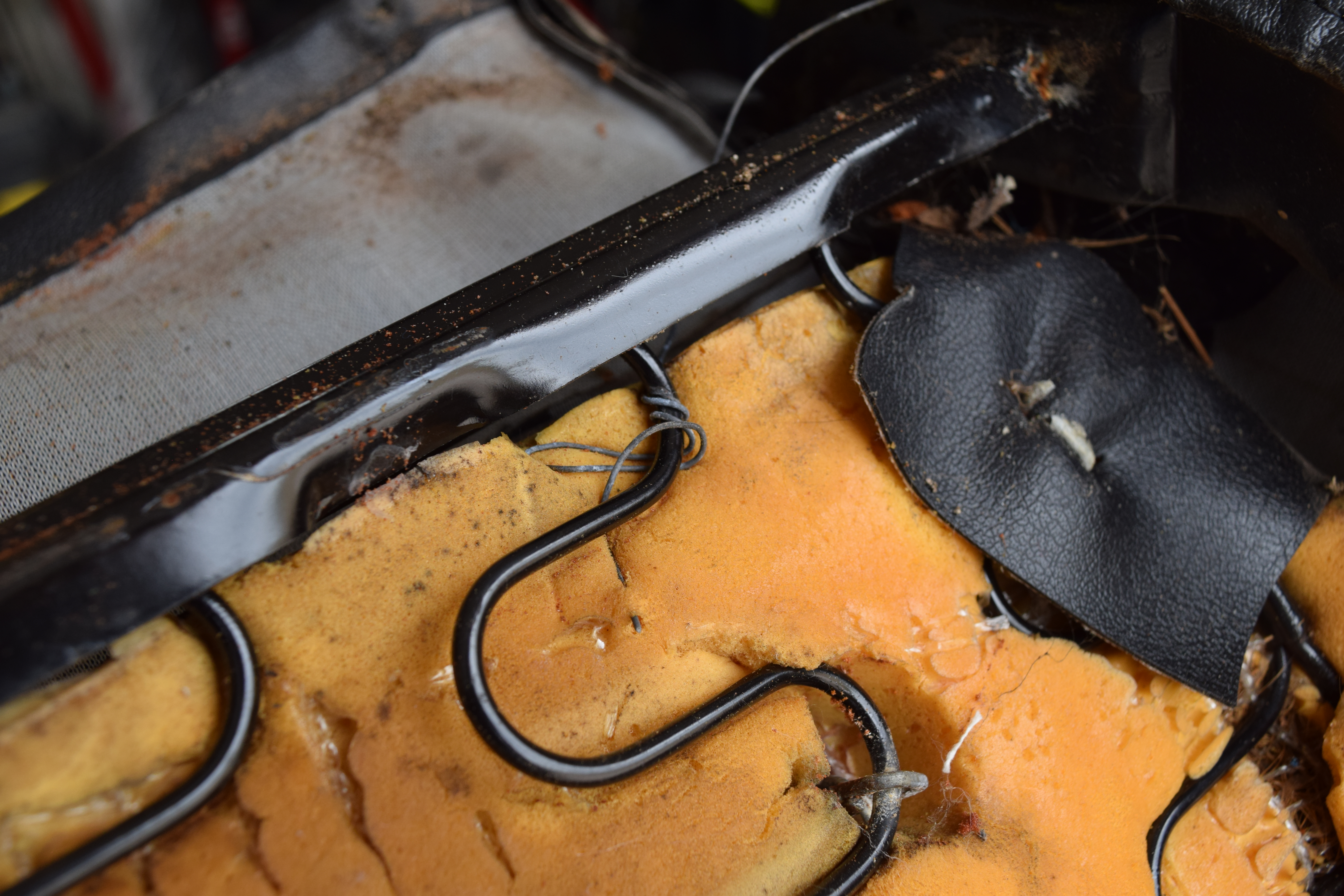 Un petit aperçu de l’état de la garniture. L’extérieur du simili cuir est bien déchiré et à l’intérieur, la mousse de la garniture entoilée s’est complètement désintégrée (mousse orange que l’on peut voir sur la photo). Cette mousse permet de réaliser le côté matelassé de la sellerie, quand elle est neuve. Ici, il n’y a plus de mousse, ce qui fait que l’assise est complètement plate. Vous pouvez également voir la tige métallique dont on a parlé précédemment et qui sert à tendre la garniture en profondeur.