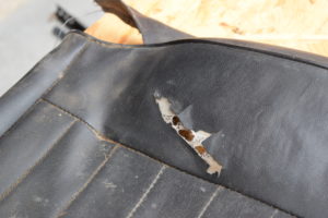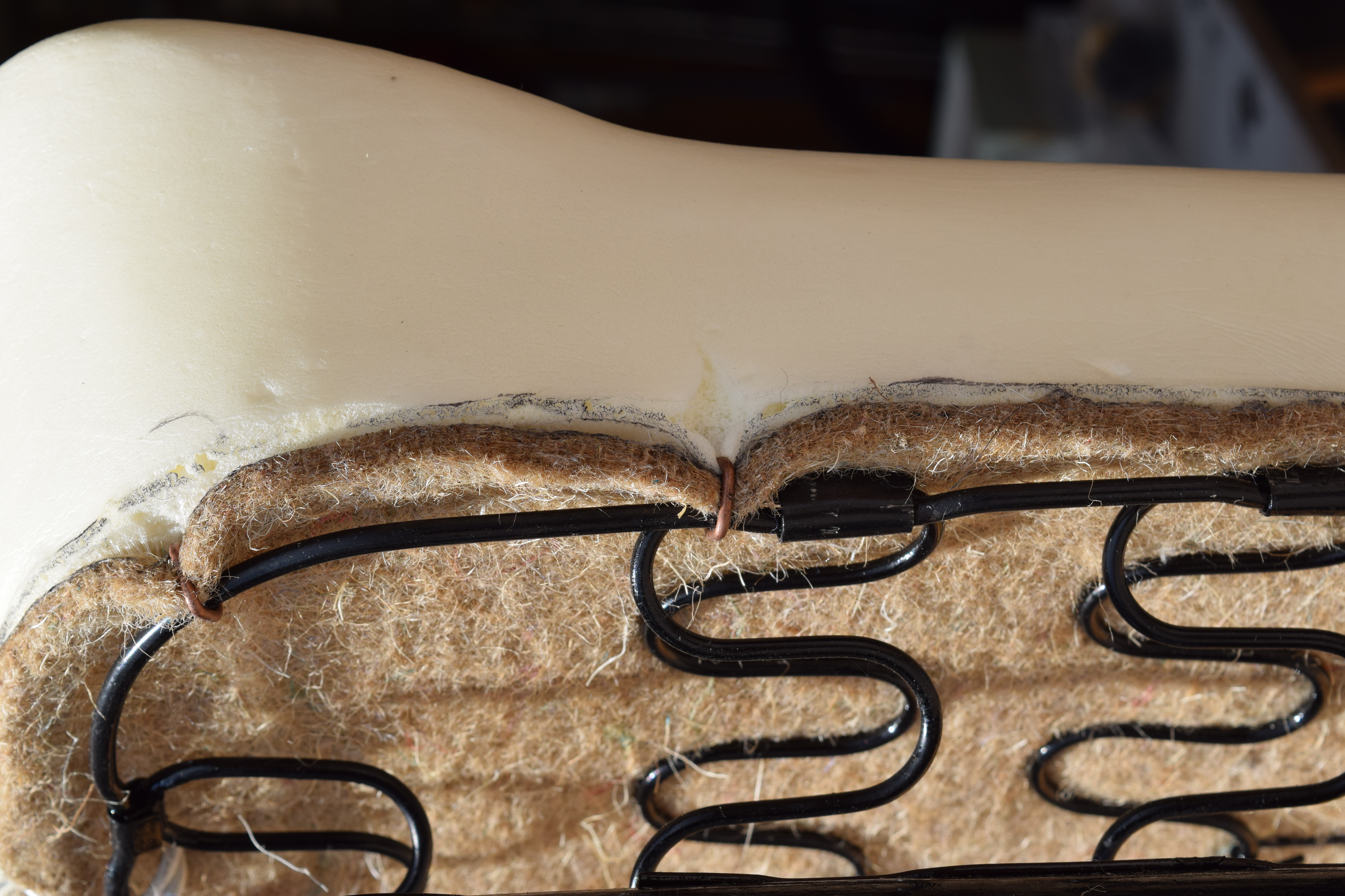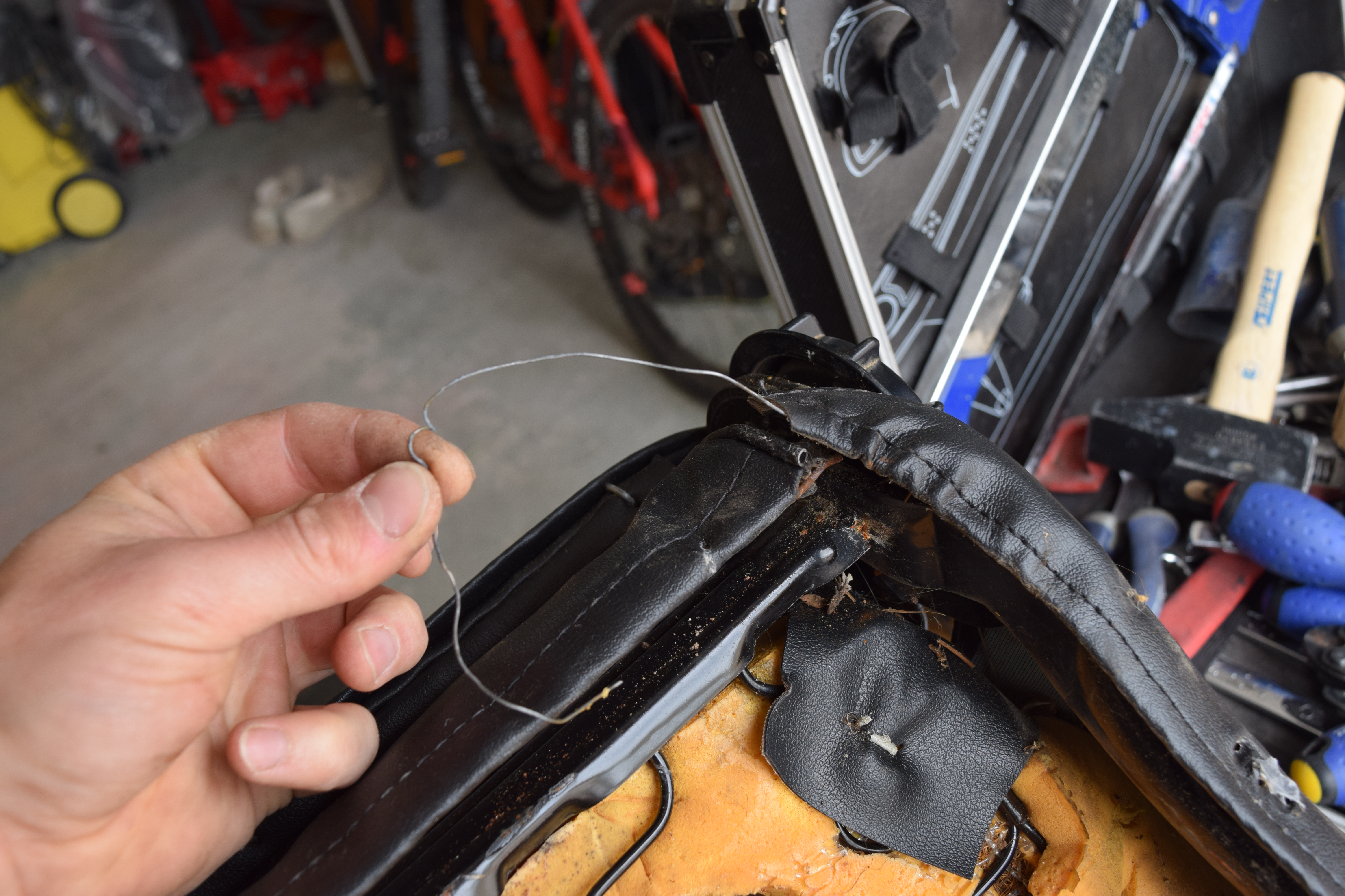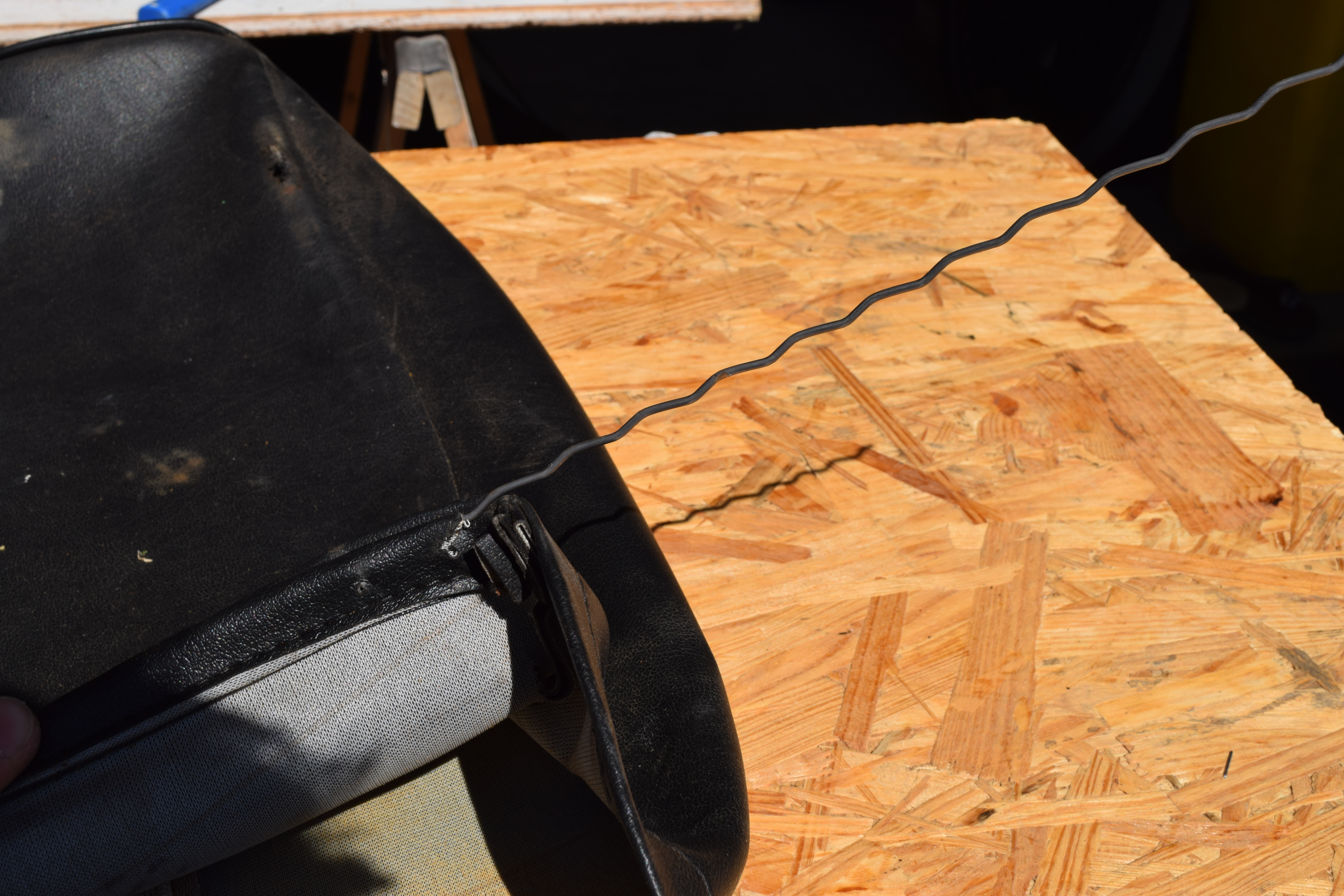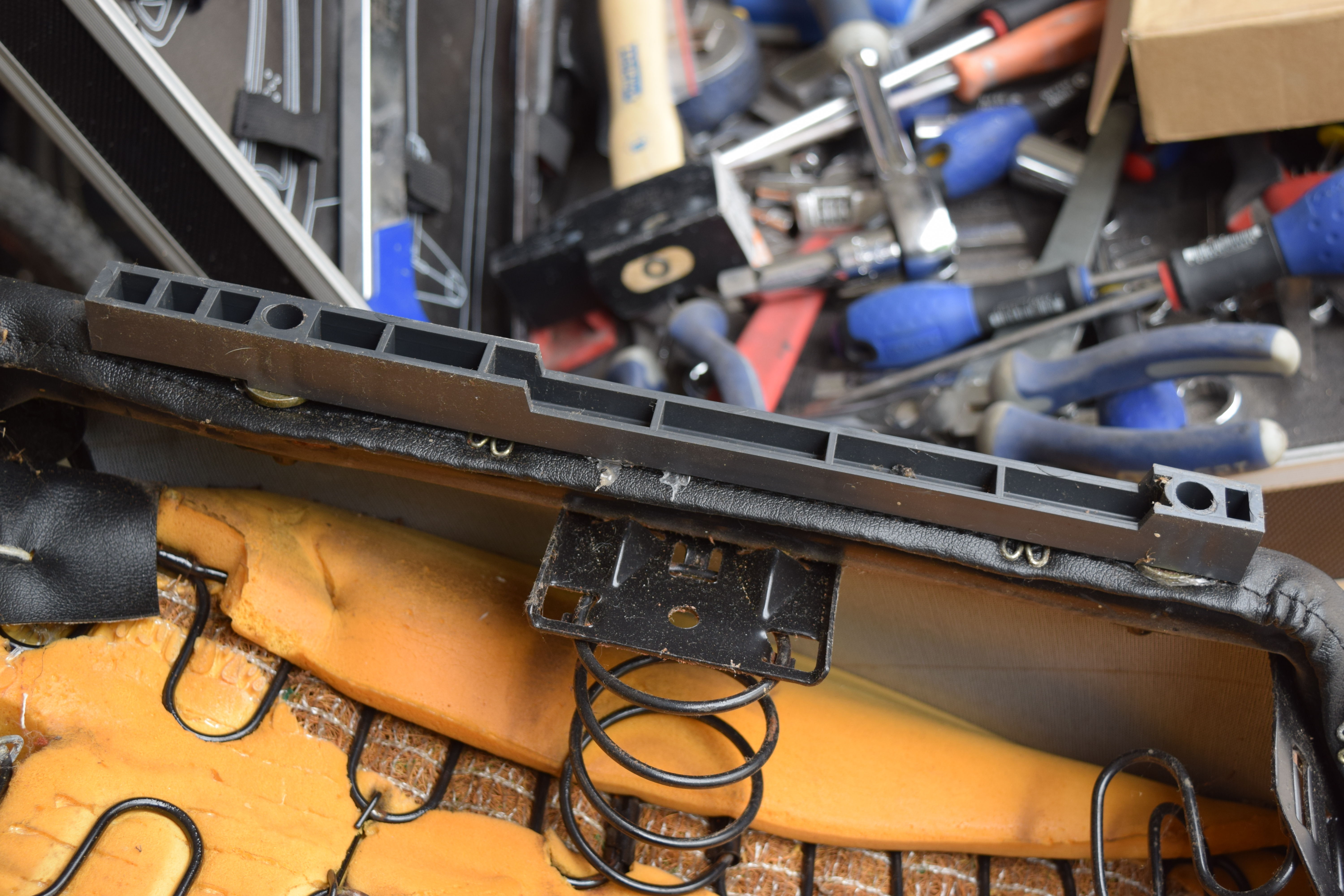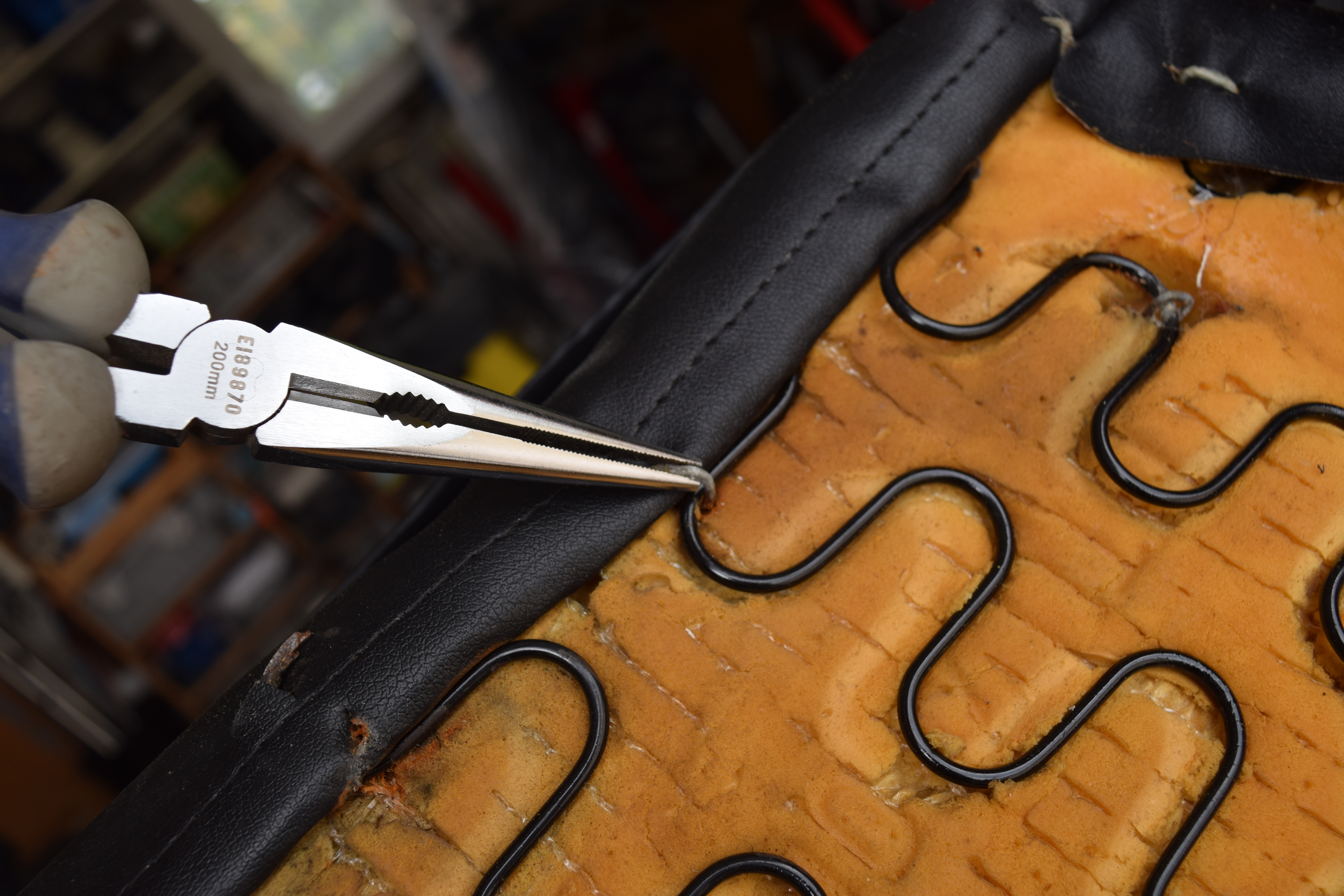 Un petit aperçu de l’état de la garniture. L’extérieur du simili cuir est bien déchiré et à l’intérieur, la mousse de la garniture entoilée s’est complètement désintégrée (mousse orange que l’on peut voir sur la photo). Cette mousse permet de réaliser le côté matelassé de la sellerie, quand elle est neuve. Ici, il n’y a plus de mousse, ce qui fait que l’assise est complètement plate. Vous pouvez également voir la tige métallique dont on a parlé précédemment et qui sert à tendre la garniture en profondeur.