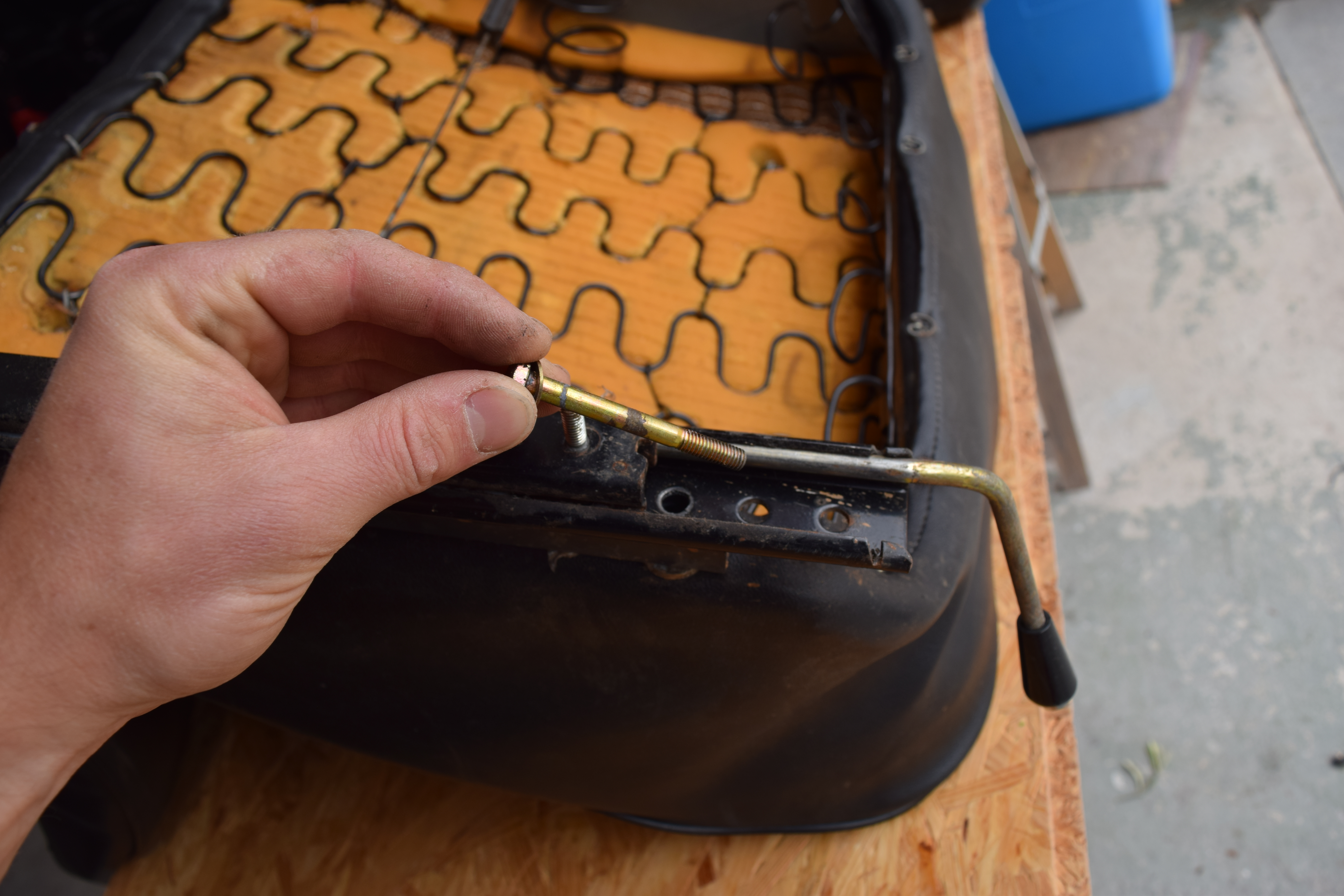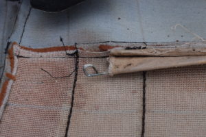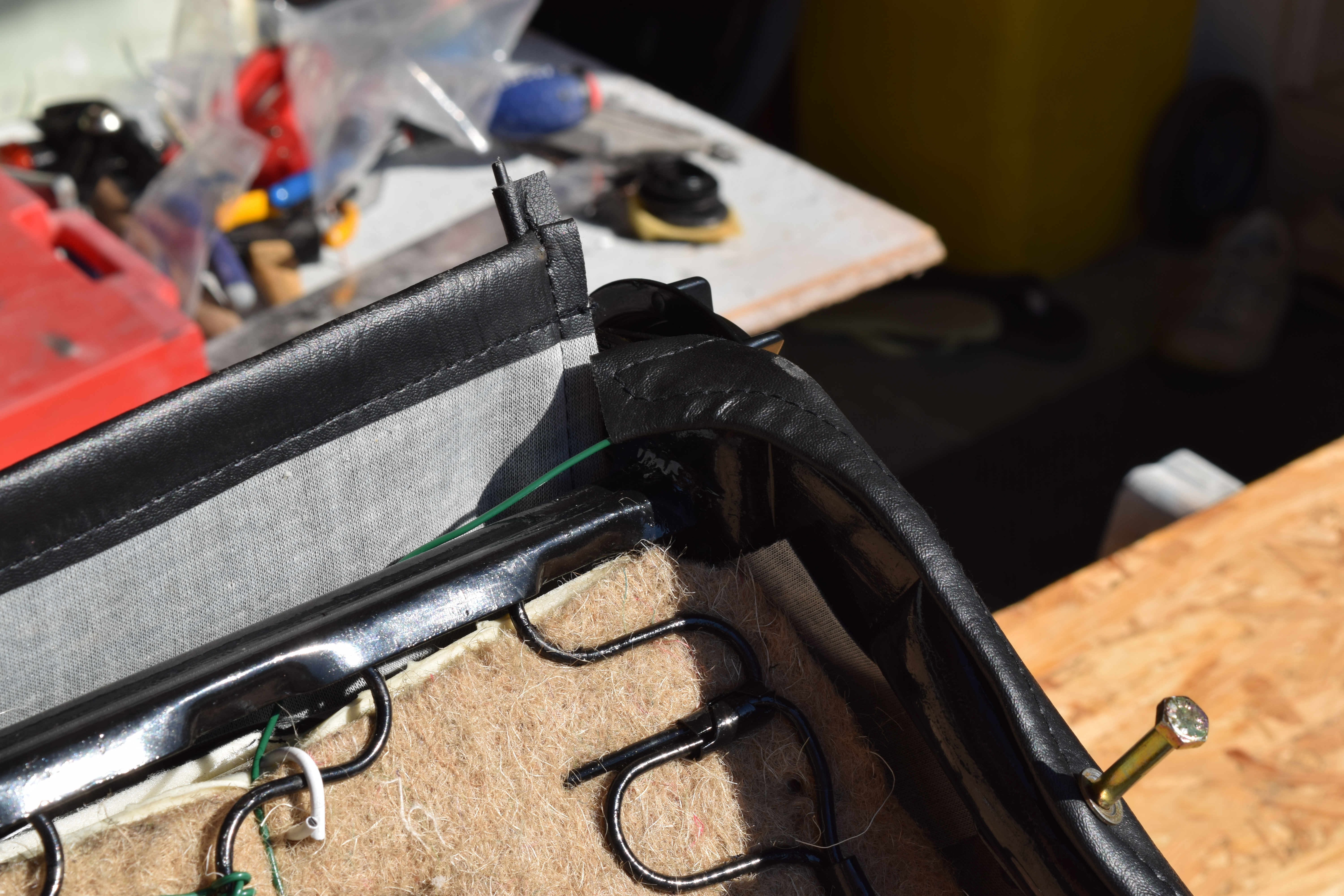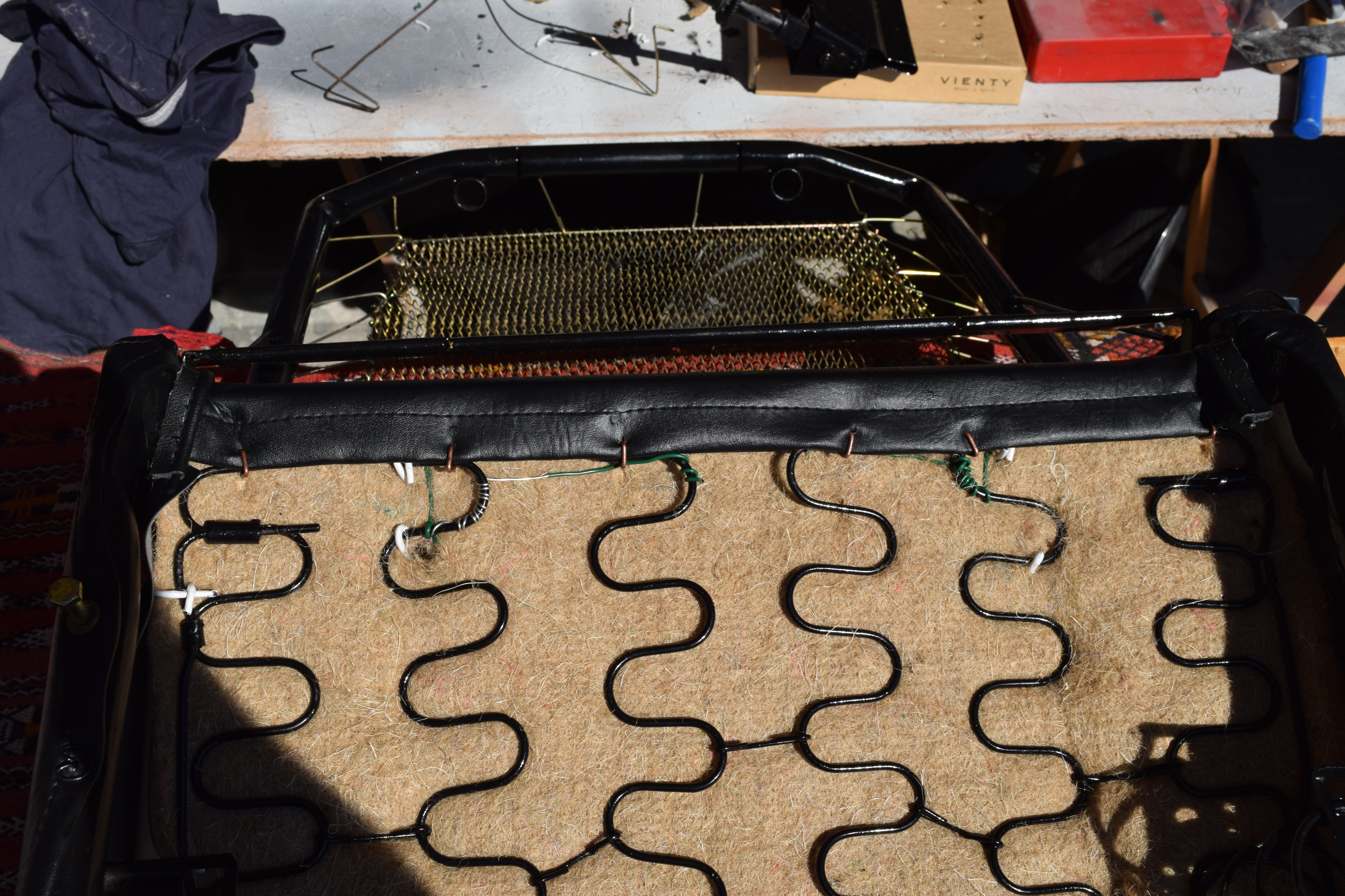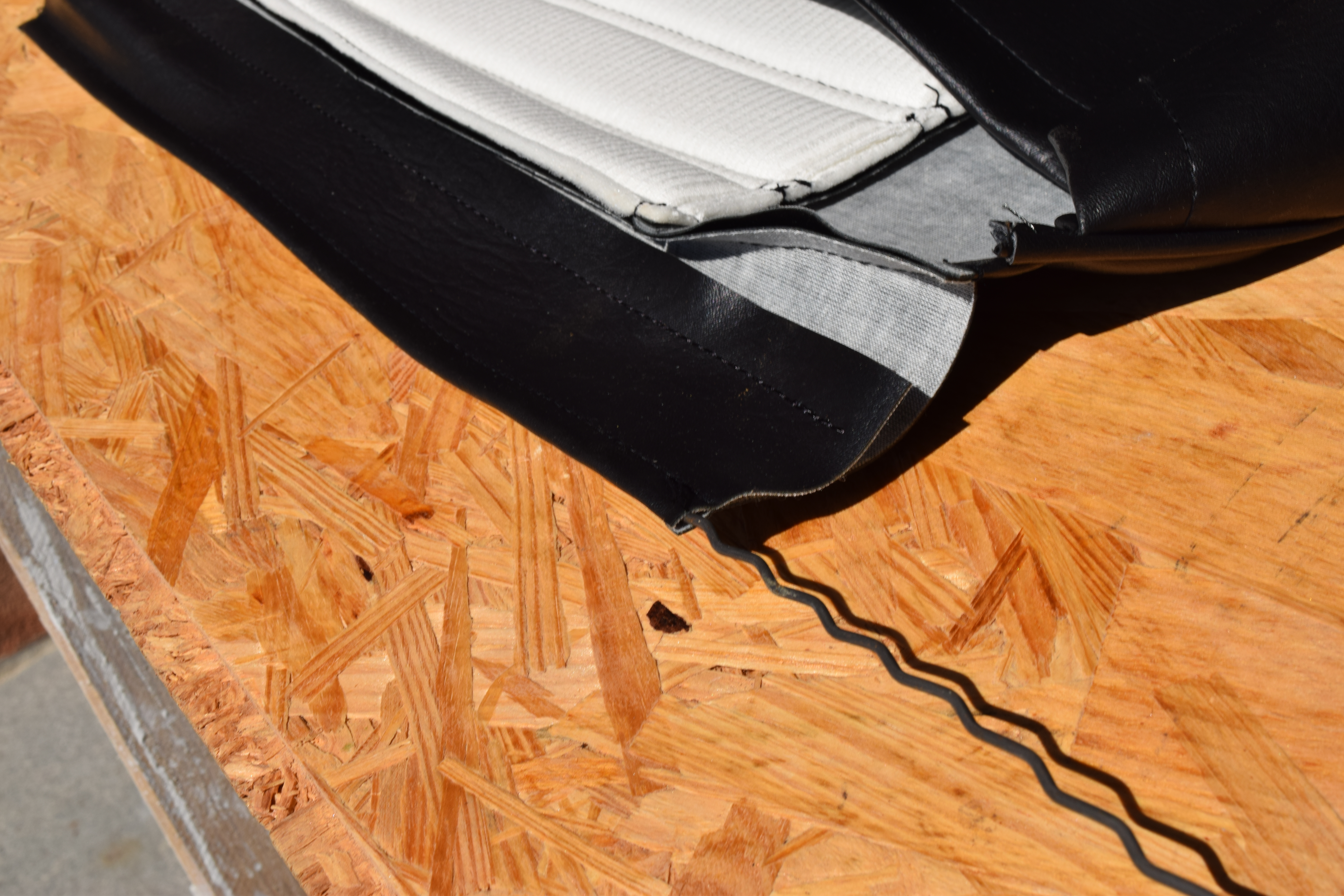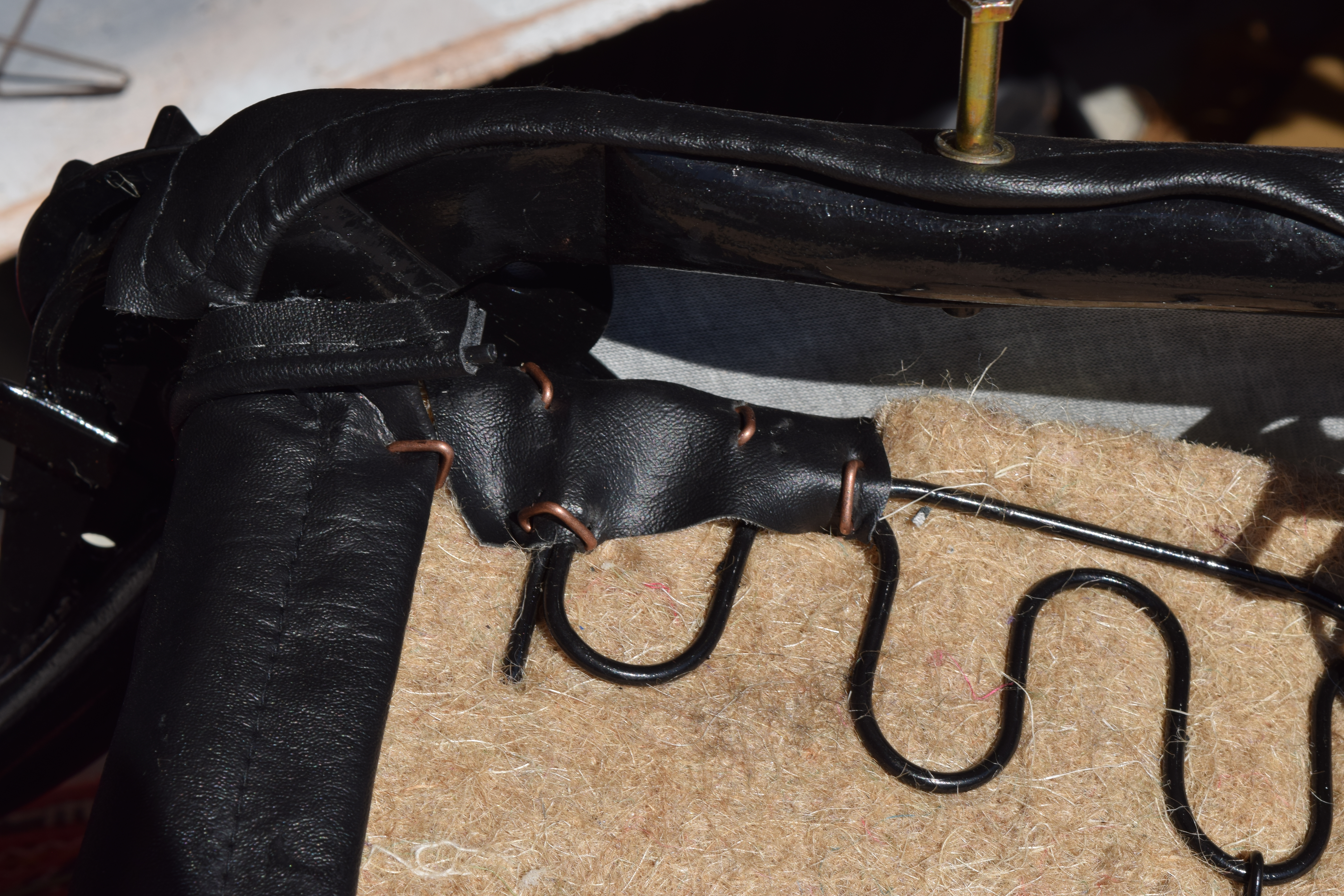 Un petit aperçu de l’état de la garniture. L’extérieur du simili cuir est bien déchiré et à l’intérieur, la mousse de la garniture entoilée s’est complètement désintégrée (mousse orange que l’on peut voir sur la photo). Cette mousse permet de réaliser le côté matelassé de la sellerie, quand elle est neuve. Ici, il n’y a plus de mousse, ce qui fait que l’assise est complètement plate. Vous pouvez également voir la tige métallique dont on a parlé précédemment et qui sert à tendre la garniture en profondeur.