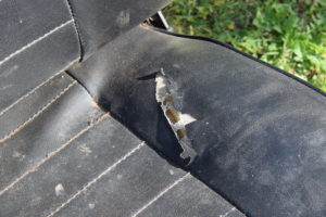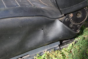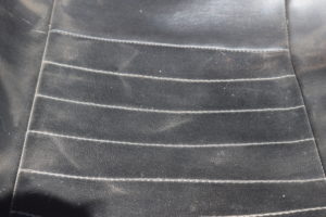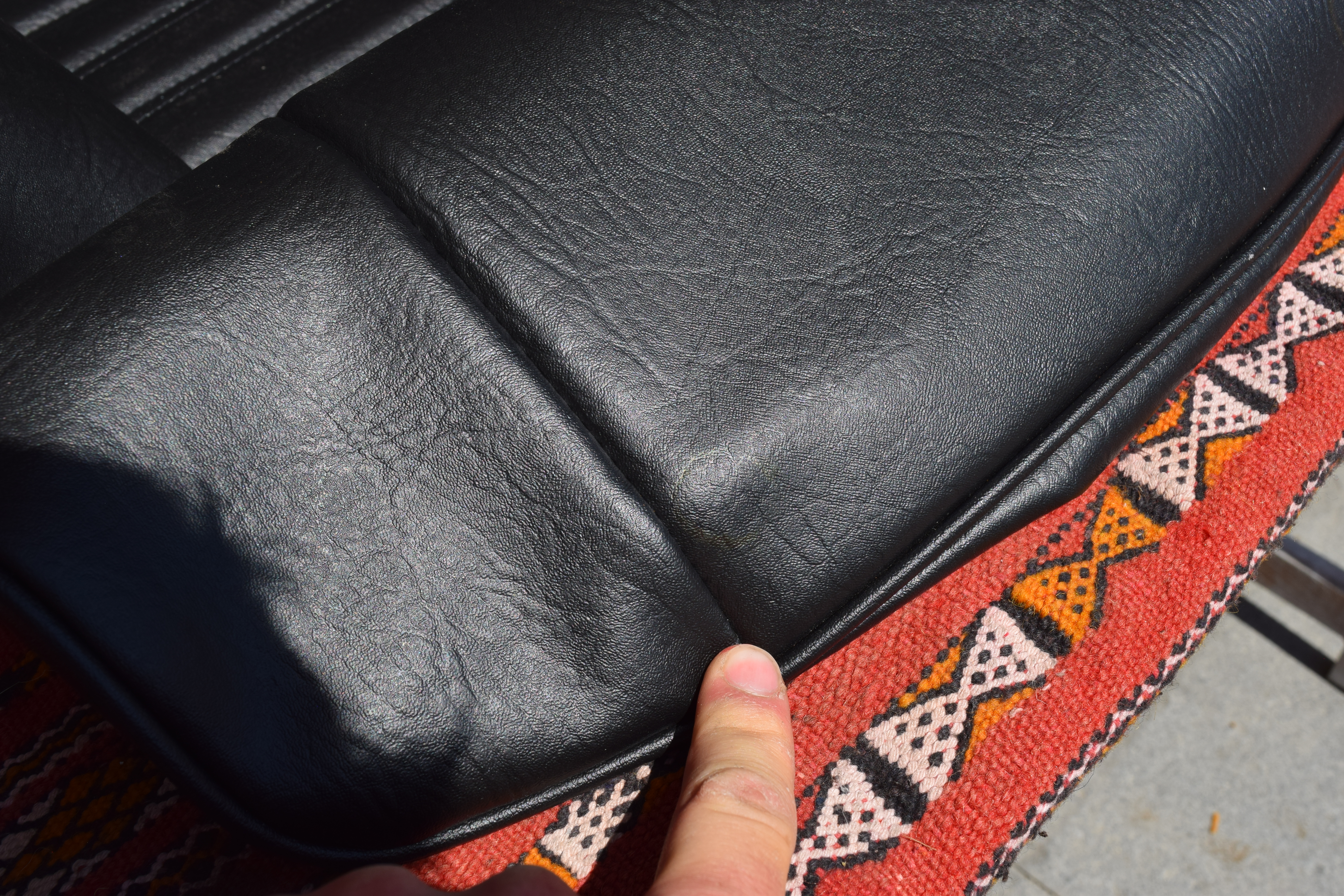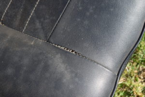 De loin, on pourrait se dire qu’ils ont simplement besoin d’un bon nettoyage… mais comme vous pouvez le constater en détails, il y a de multiples trous et déchirures sur le simili cuir. On va remplacer tout ça !