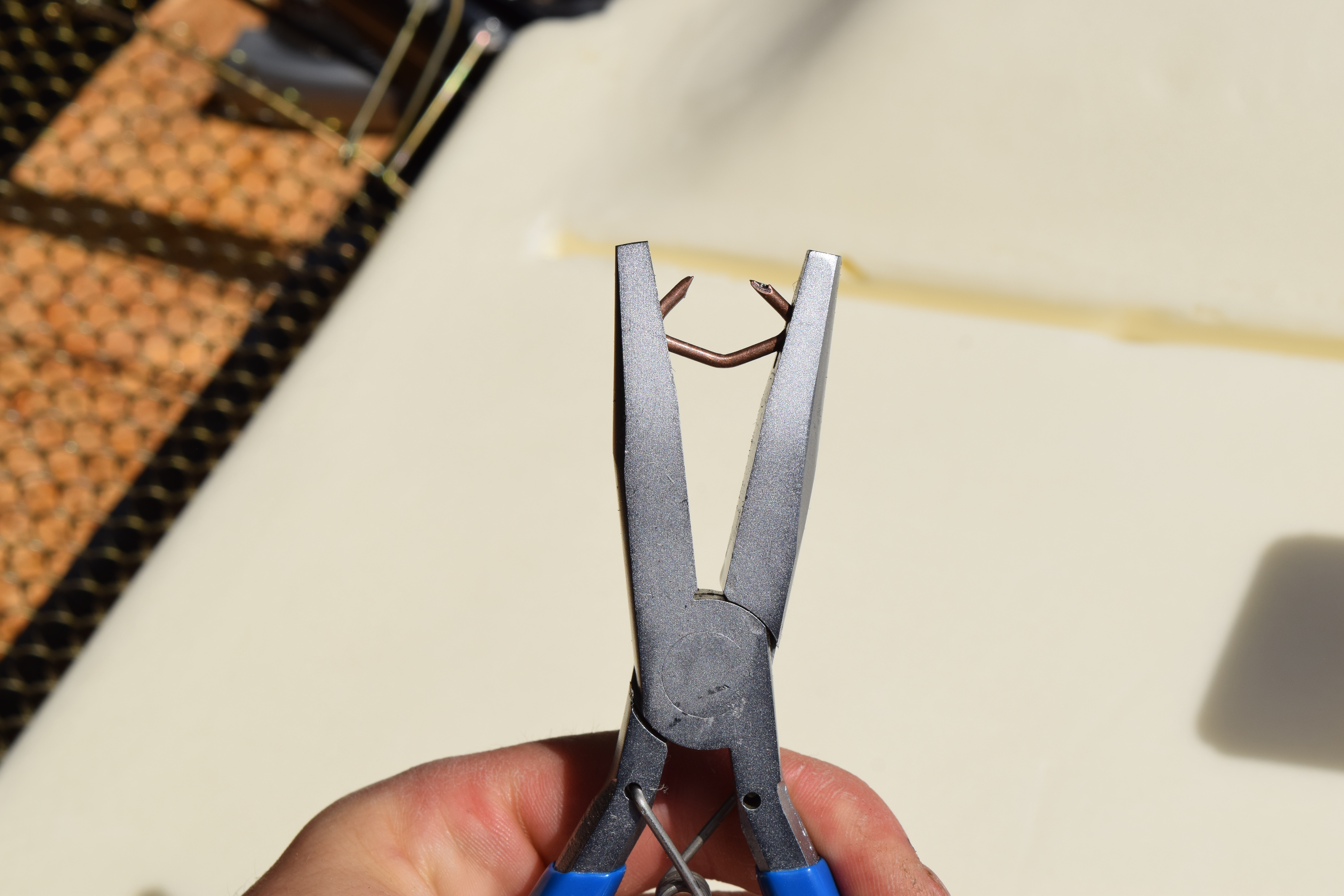 1. Avant de mettre les agrafes nez de cochon avec la pince, je tend d’abord avec du fils de fer de grillage à la place de quelques agrafes (1 sur 2) le temps de mettre quelques agraffes et ceci beaucoup plus facilement. Puis je retire et remplacer le fil de fer par les agrafes suivantes.