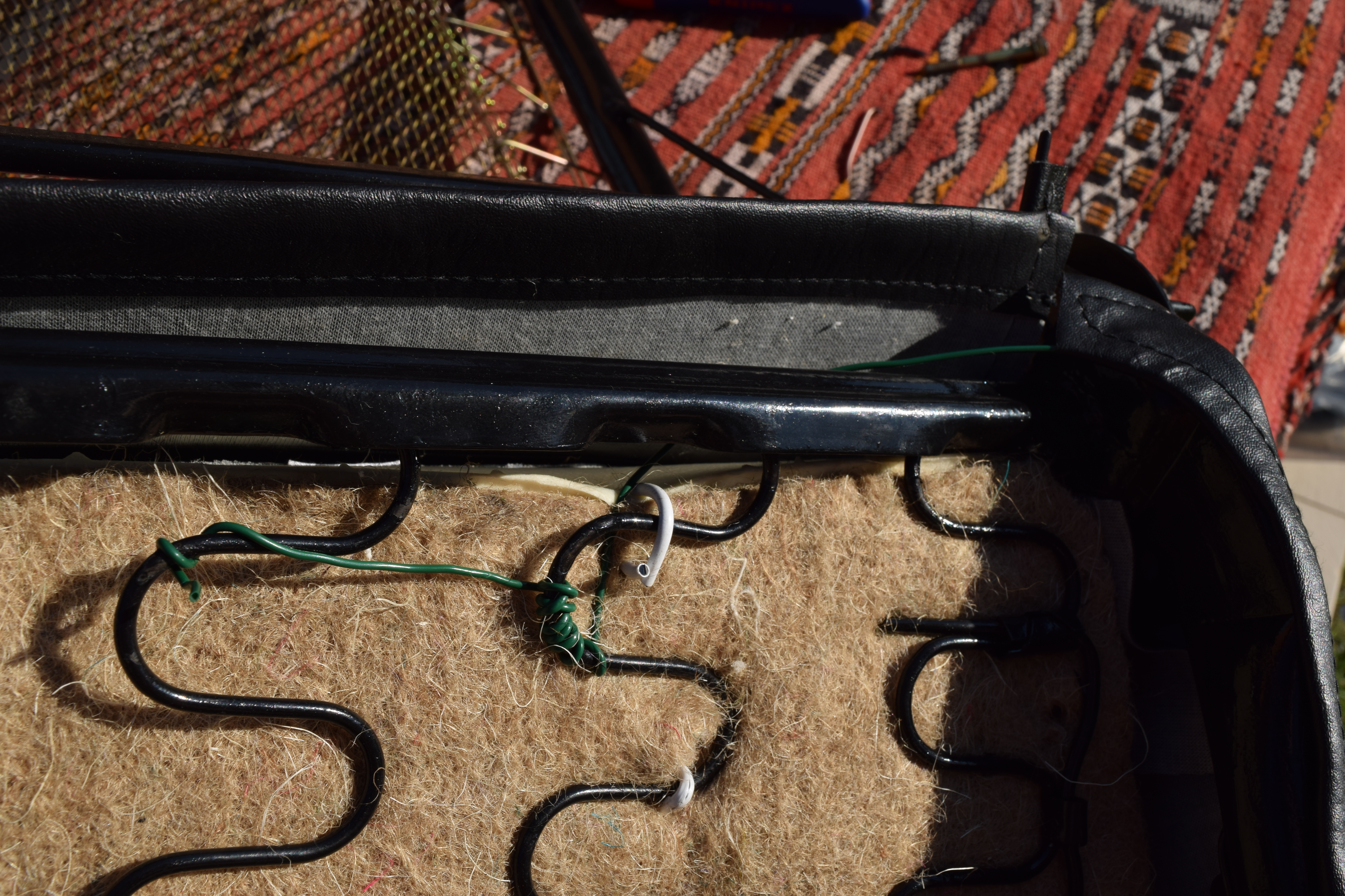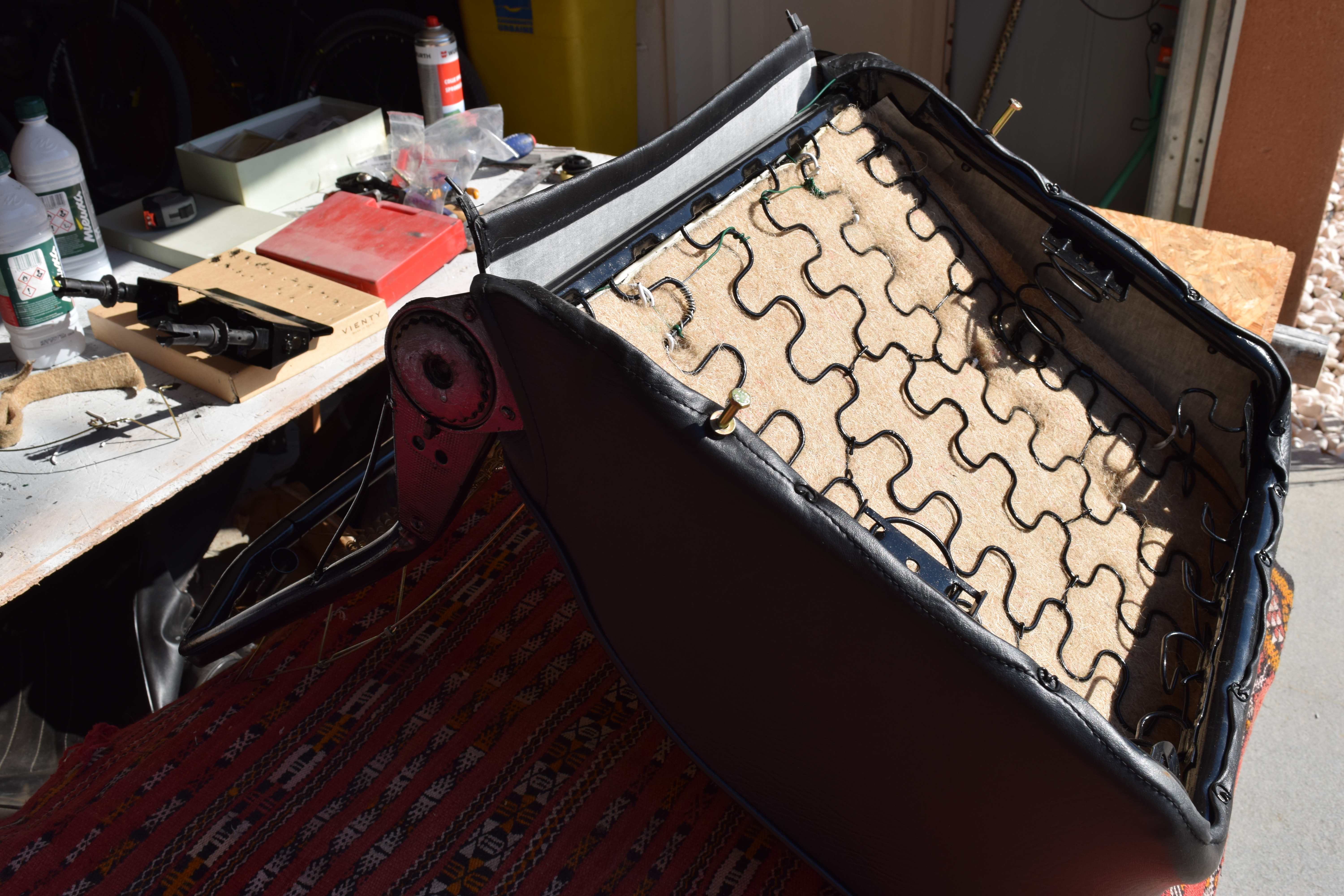 On passe maintenant à l’étape du remontage ! Dossier, mousses, garnitures neuves en simili… au boulot ! 🙂