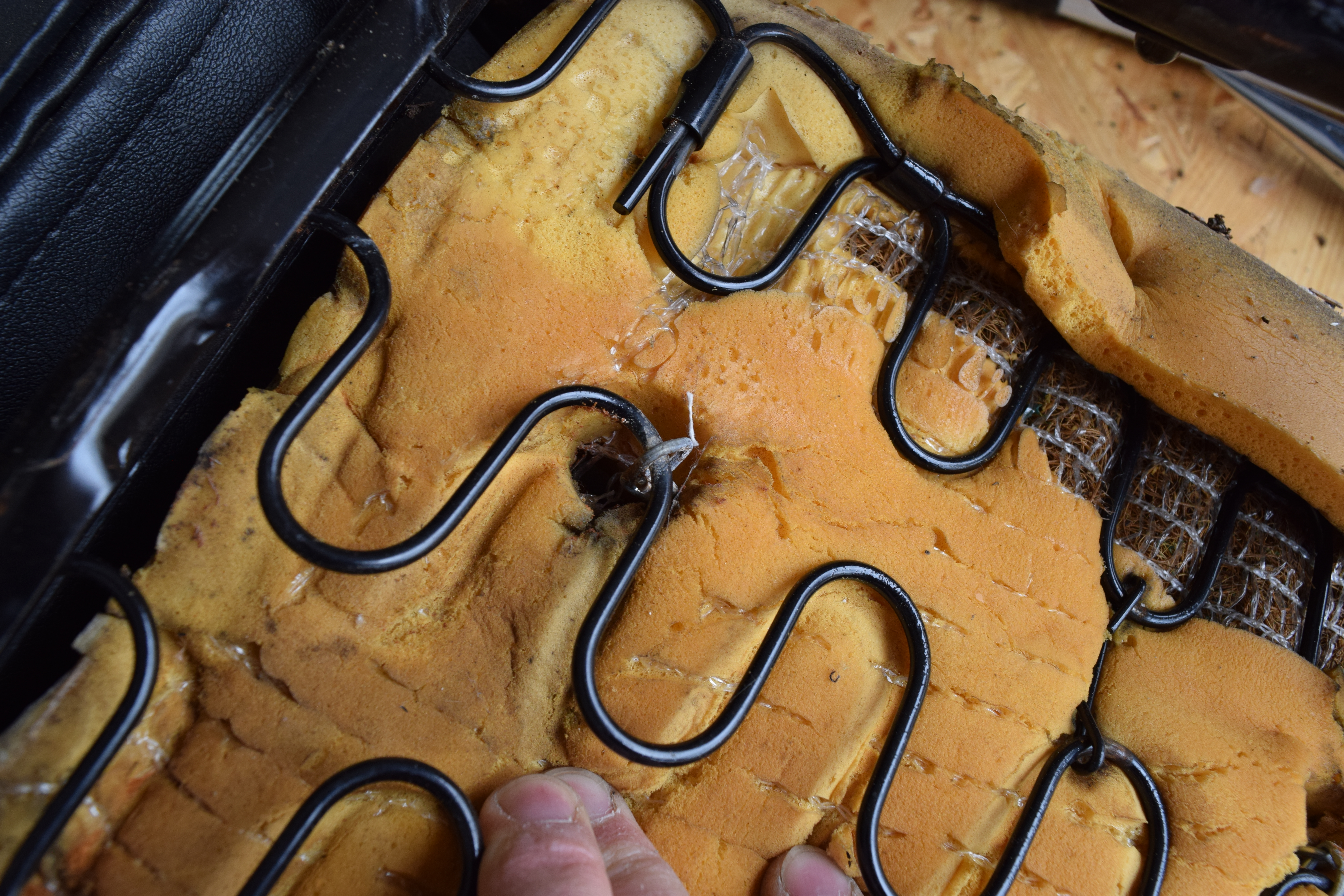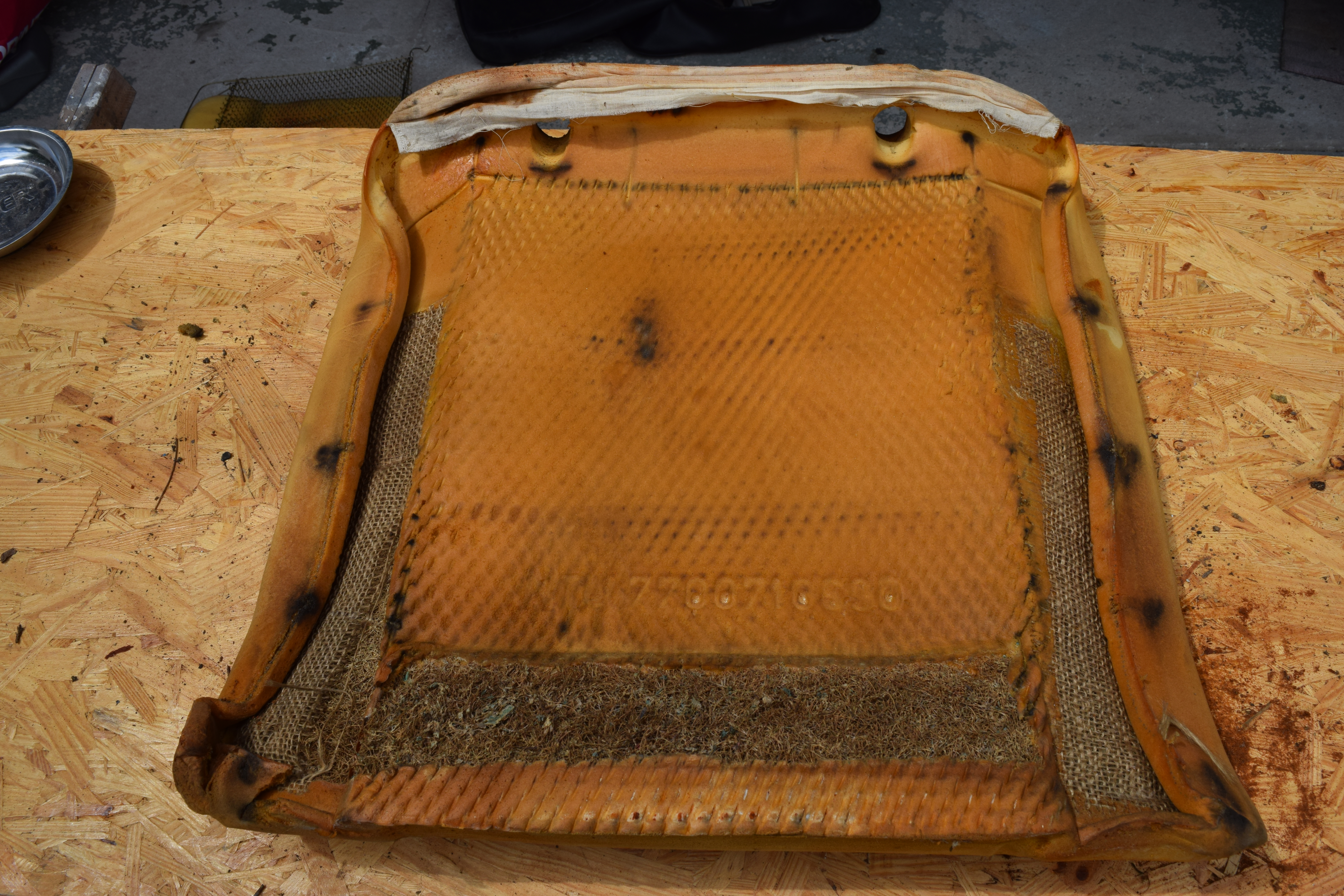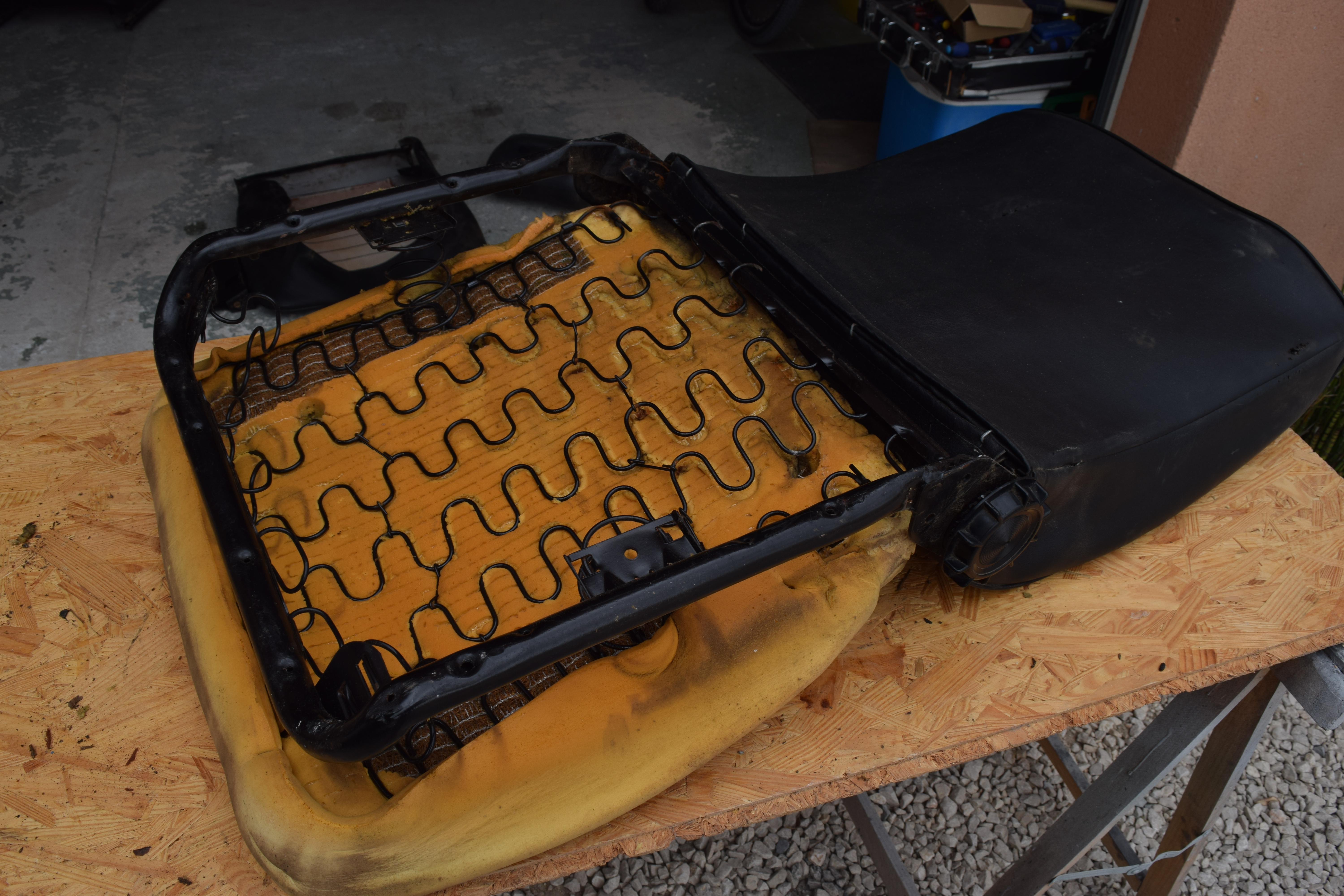 La mousse de l’assise du siège conducteur que l’on voit ici en photo est bien abîmée. Il manque de la matière à plusieurs endroits et surtout, elle s’est vraiment bien affaissée ! Je vais donc devoir la remplacer. La mousse côté passager est logiquement moins abîmée, je peux la conserver.