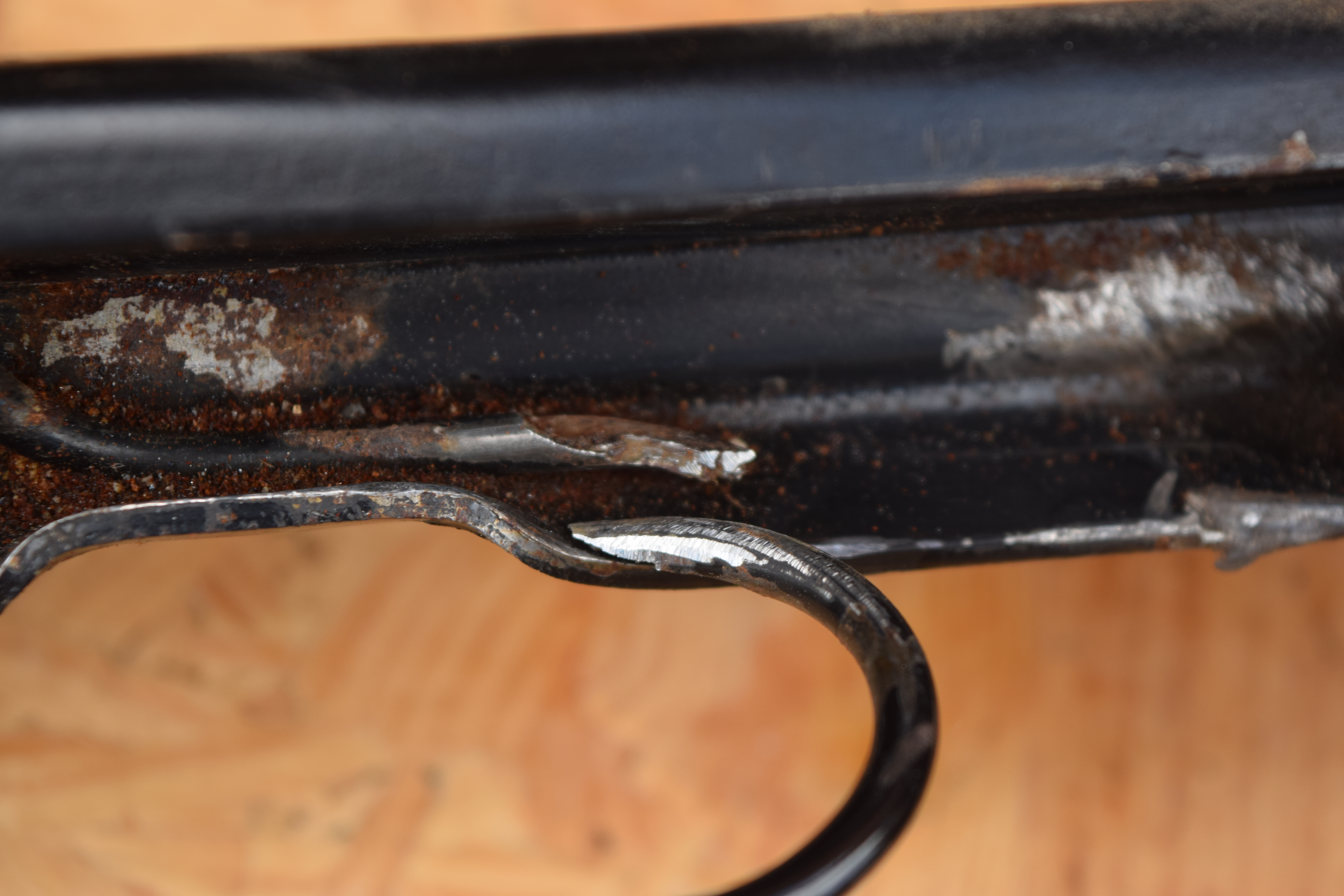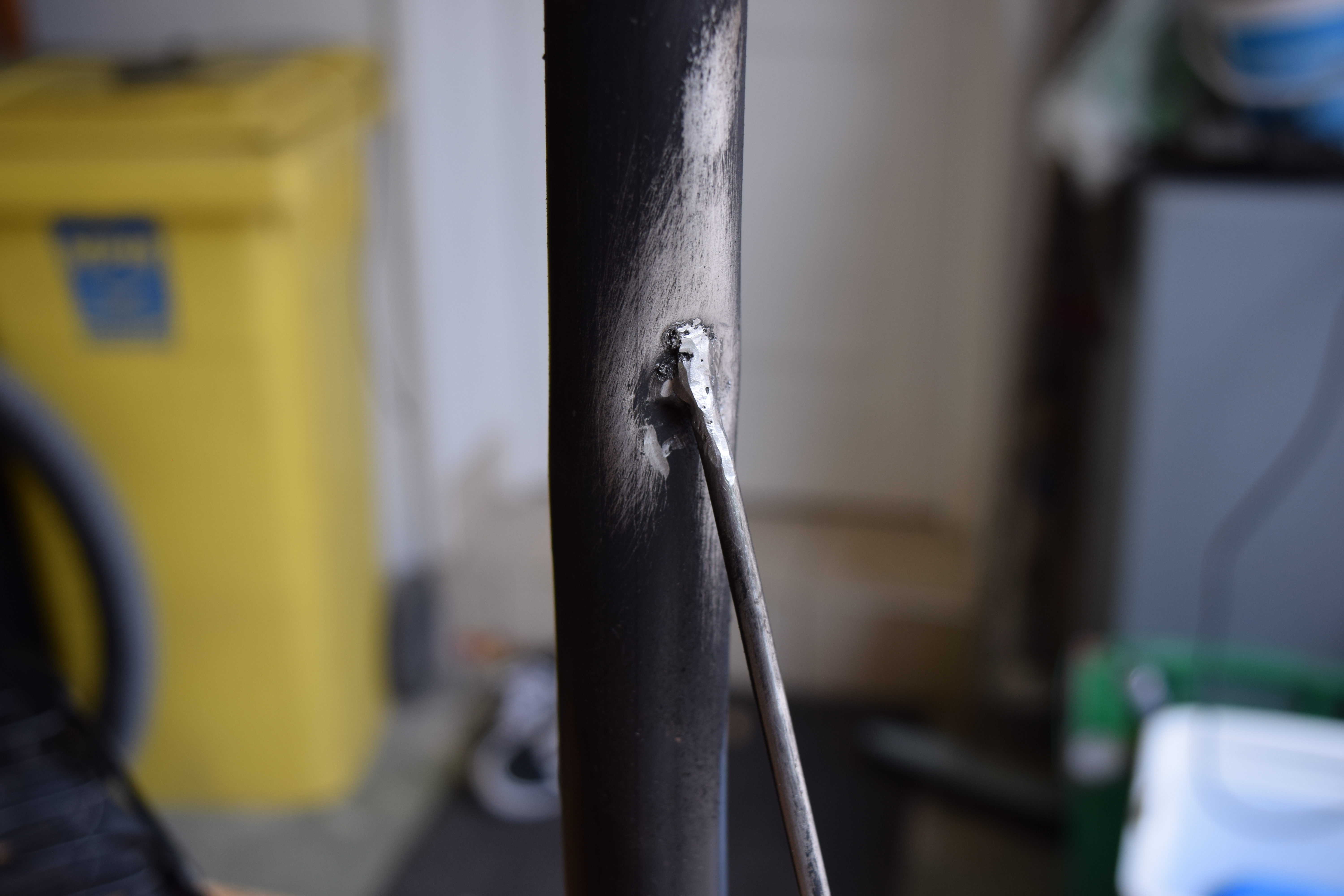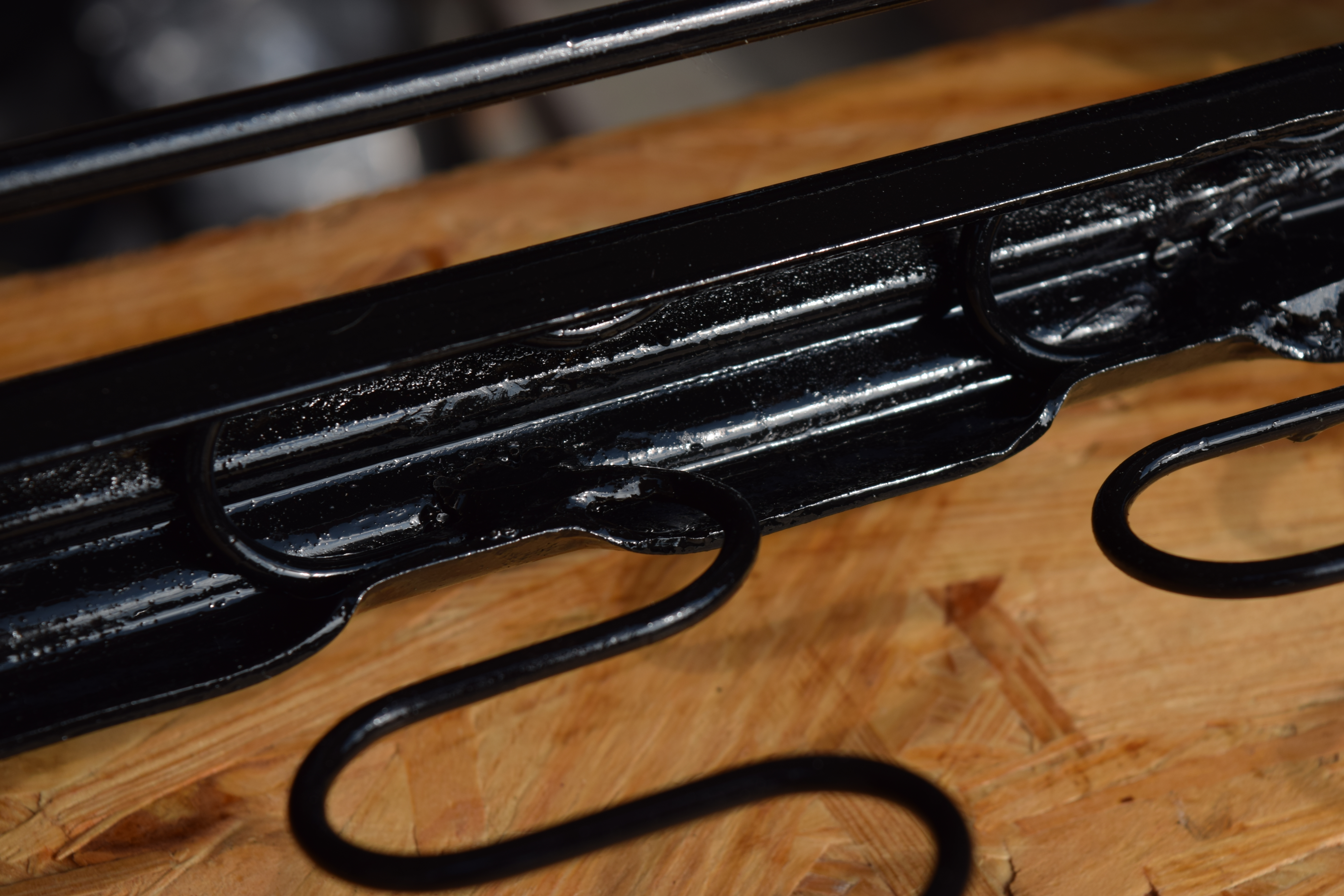 La peinture était bien défraichie et le métal attaqué à certains endroits. J’ai donc légèrement brossé les zones corrodées puis j’ai appliqué de la peinture anti-corrosion noir brillant.
