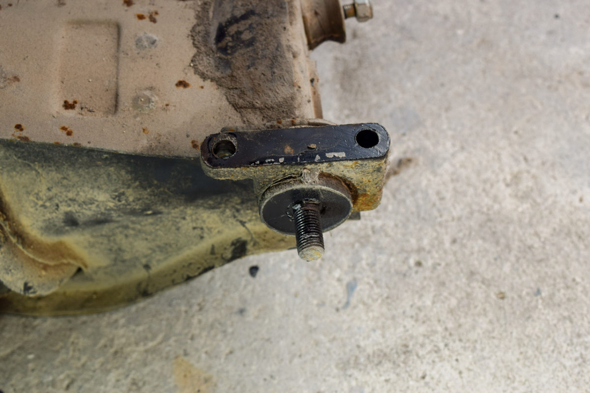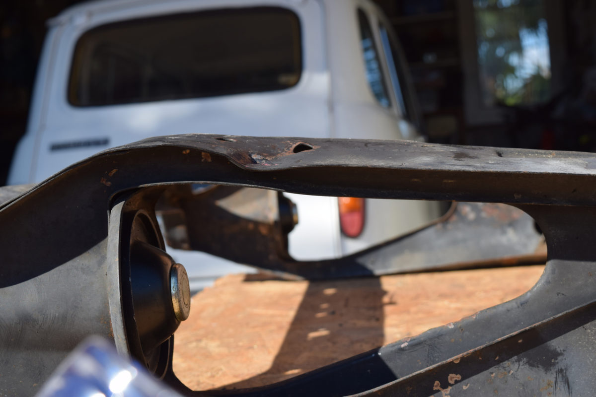Je remplace ici les anciens silentblocs par des neufs. Ceux d’origine pouvaient encore paraître en bon état à l’extérieur, mais en réalité ils étaient complètement ovalisés à l’intérieur. Cela provoque du jeu dans la fixation du berceau, ce dernier risquant de bouger démesurément.