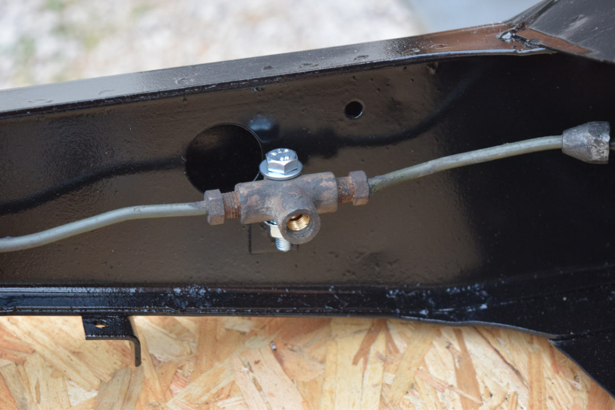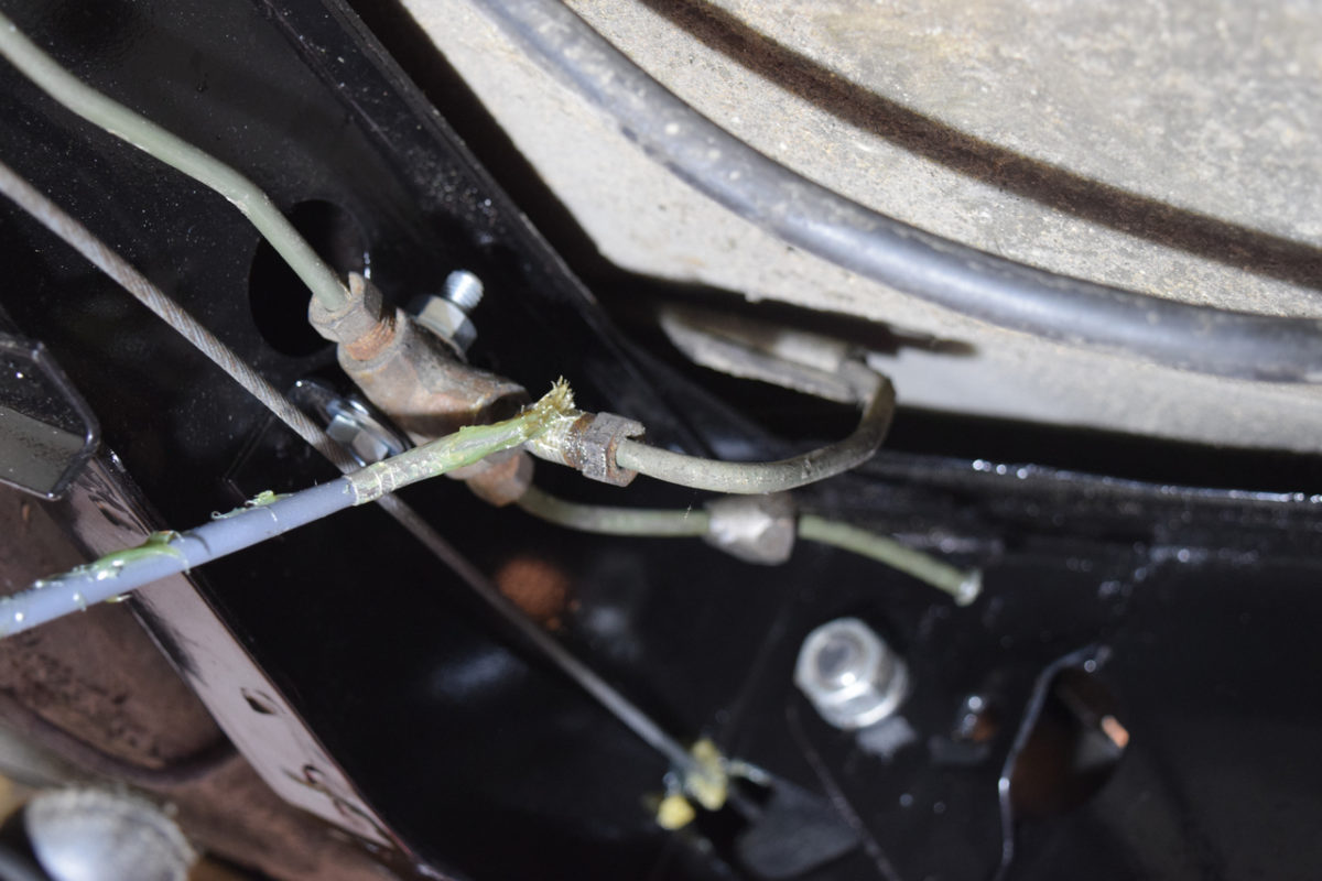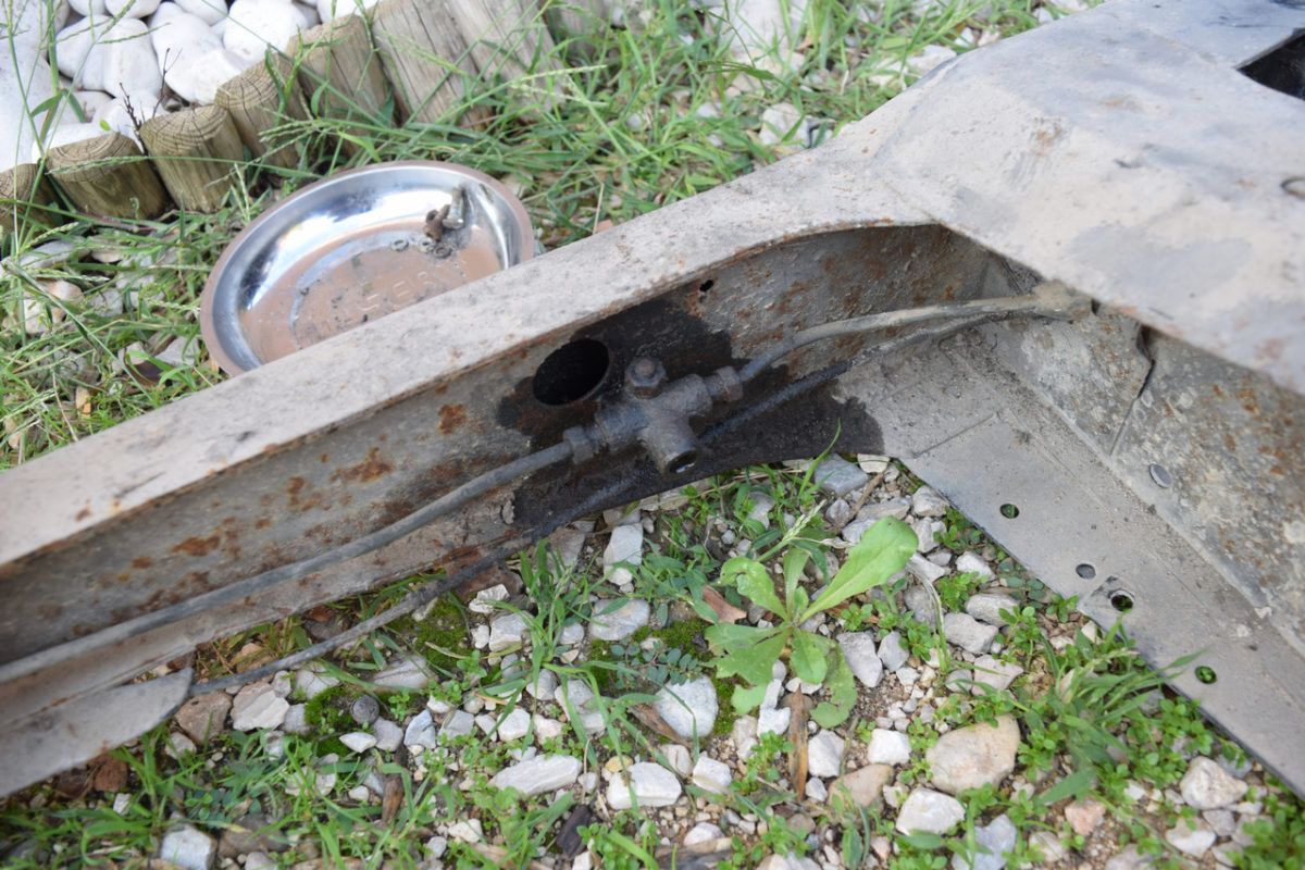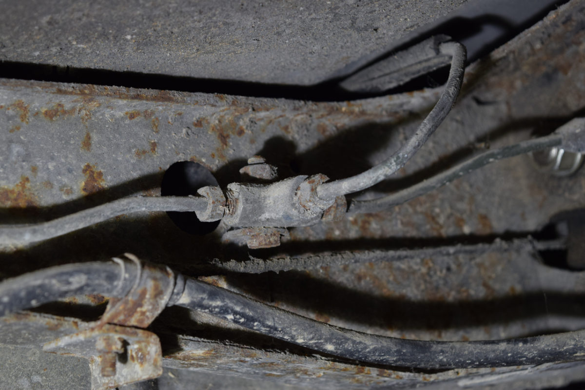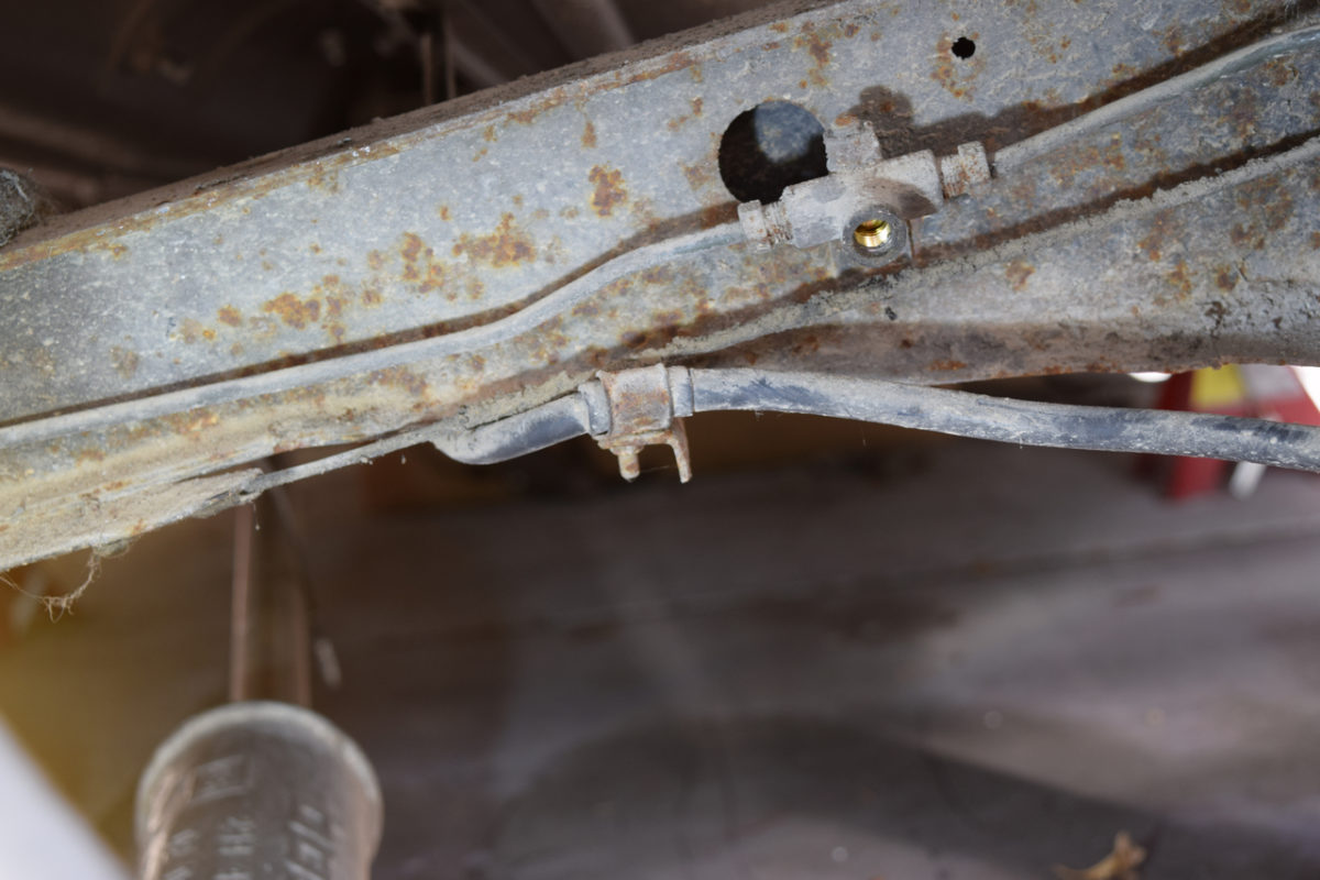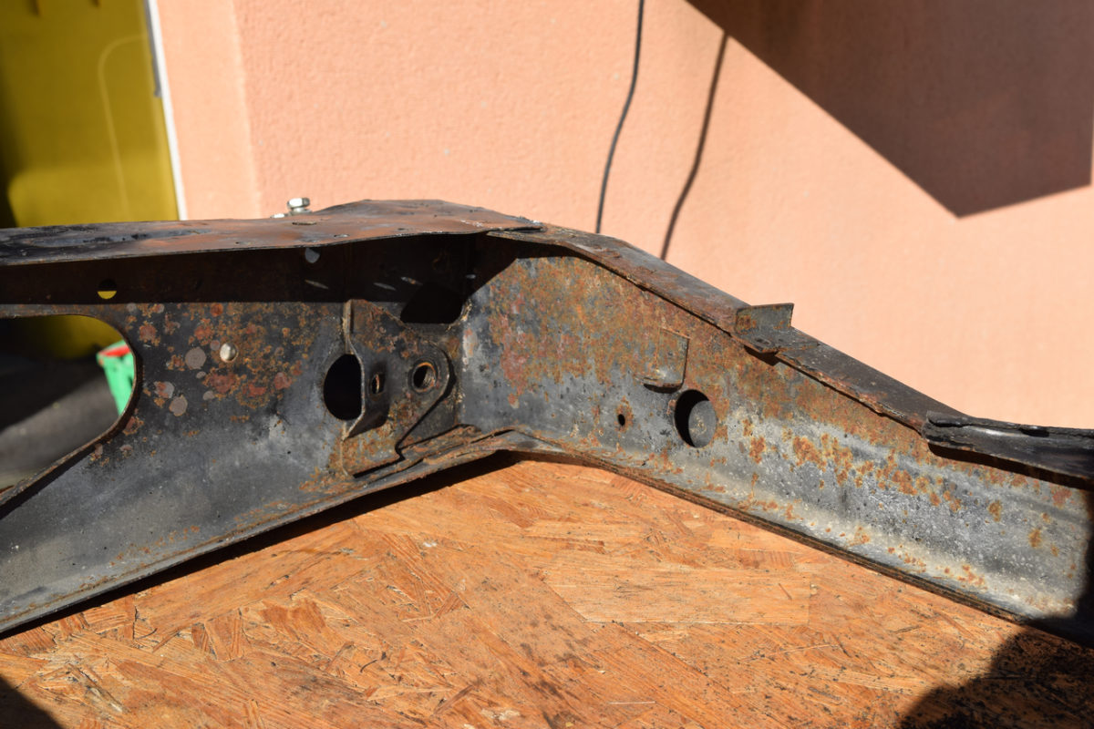 Voici la zone la plus attaquée du berceau (autour du répartiteur de frein). La corrosion commence sérieusement à attaquer le métal.