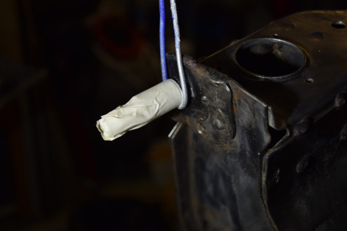 Le berceau est bientôt prêt à passer à la peinture. Il reste à masquer les éléments qui ne doivent pas être peints, de dégraisser l’ensemble du berceau et de le suspendre dans la “cabine de peinture” maison.