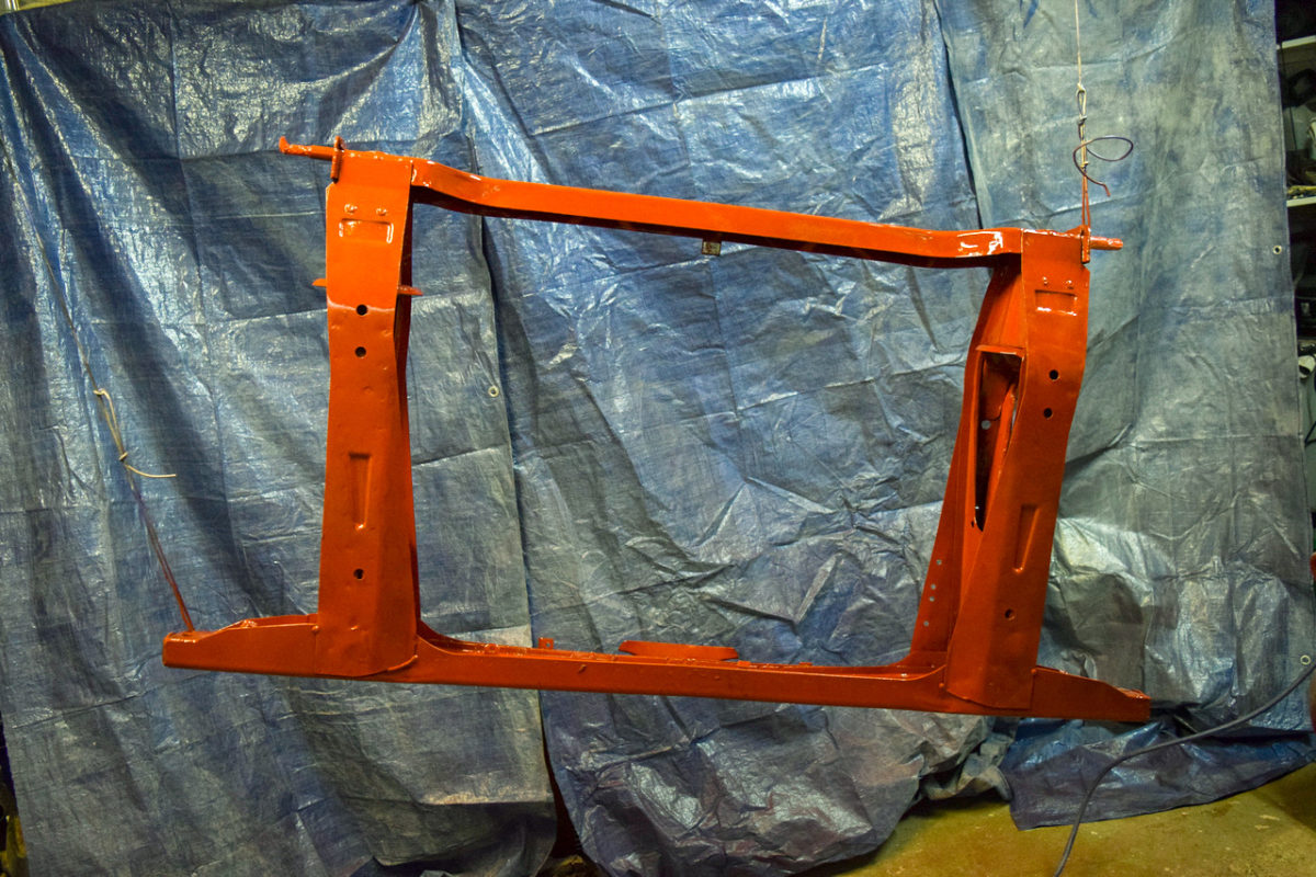 On peut maintenant passer à la peinture ! Étant donné que le support n’est pas parfait (il n’a pas été sablé mais seulement décapé) et qu’il subsiste des traces de corrosion, j’utilise comme bien souvent du Rustol CIP. C’est le meilleur apprêt antirouille que je connaisse. Il permet d’isoler le métal sain tout en stoppant le développement de la rouille lorsque le support est légèrement corrodé.