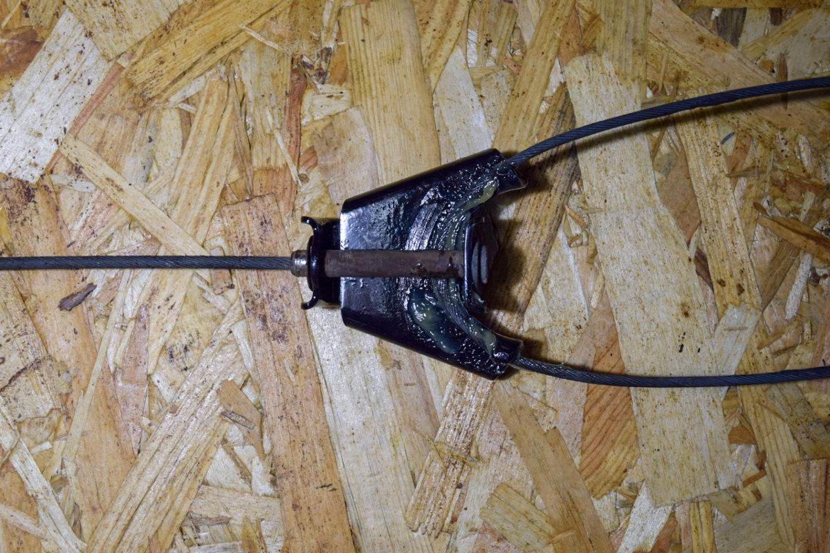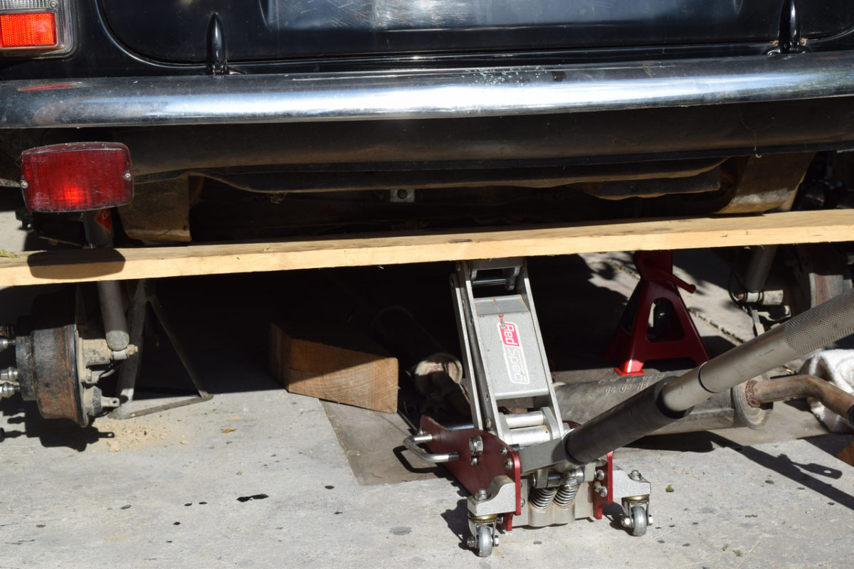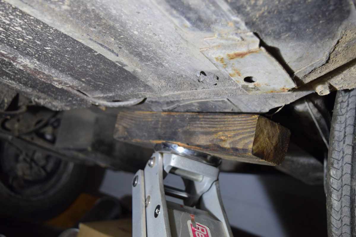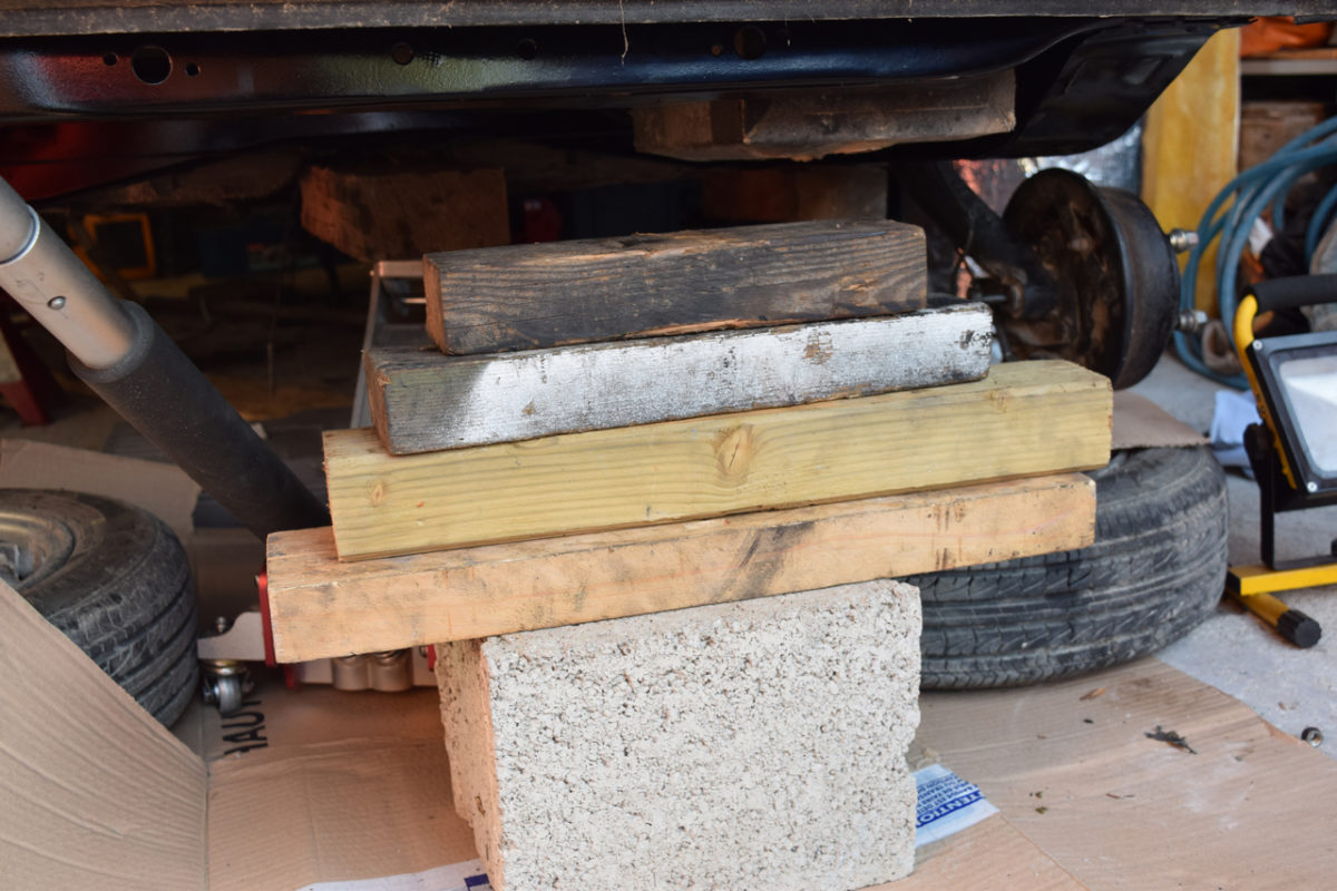 Le berceau n’étant plus maintenu, il faut le soutenir pour le descendre. Étant donné que je suis seul pour cette opération, j’utilise un cric et une planche en bois pour le descendre tout en douceur.