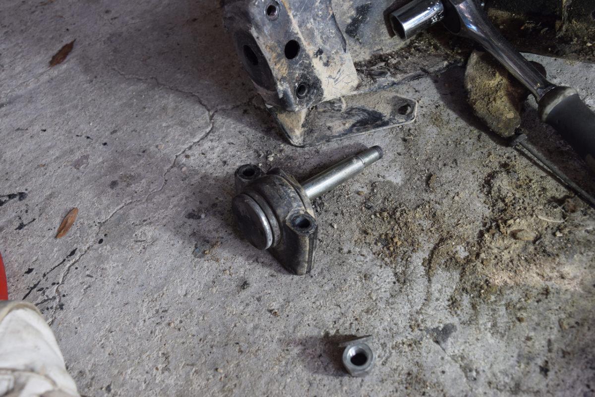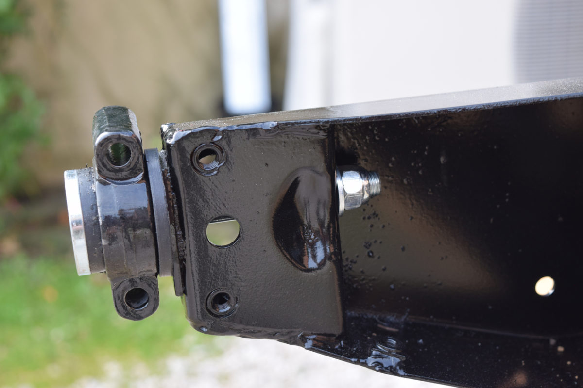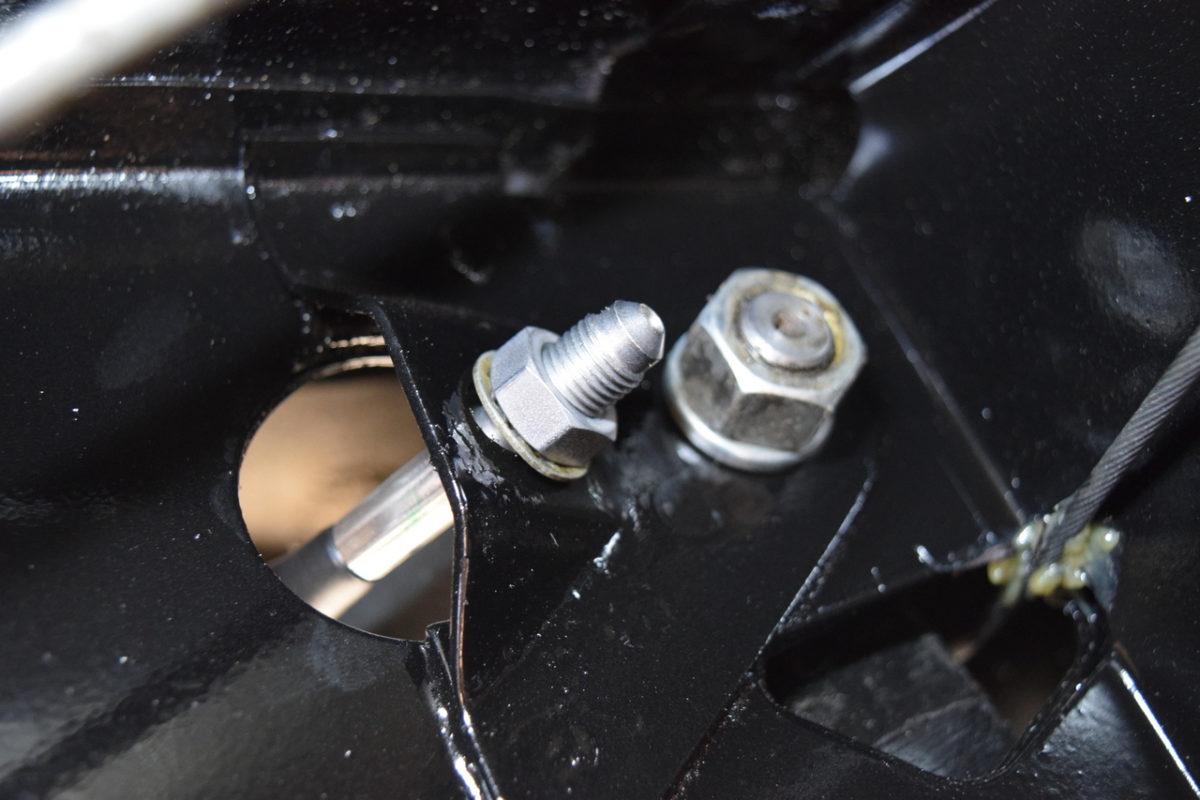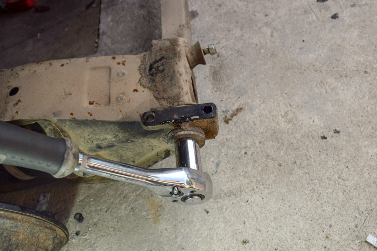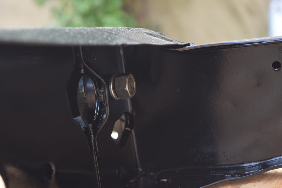L’axe du bras de suspension est fixé à son extrémité extérieure sur son support et à son extrémité intérieure sur l’intérieur du berceau. Il nous faut donc desserrer simultanément les écrous de part et d’autre du bras.