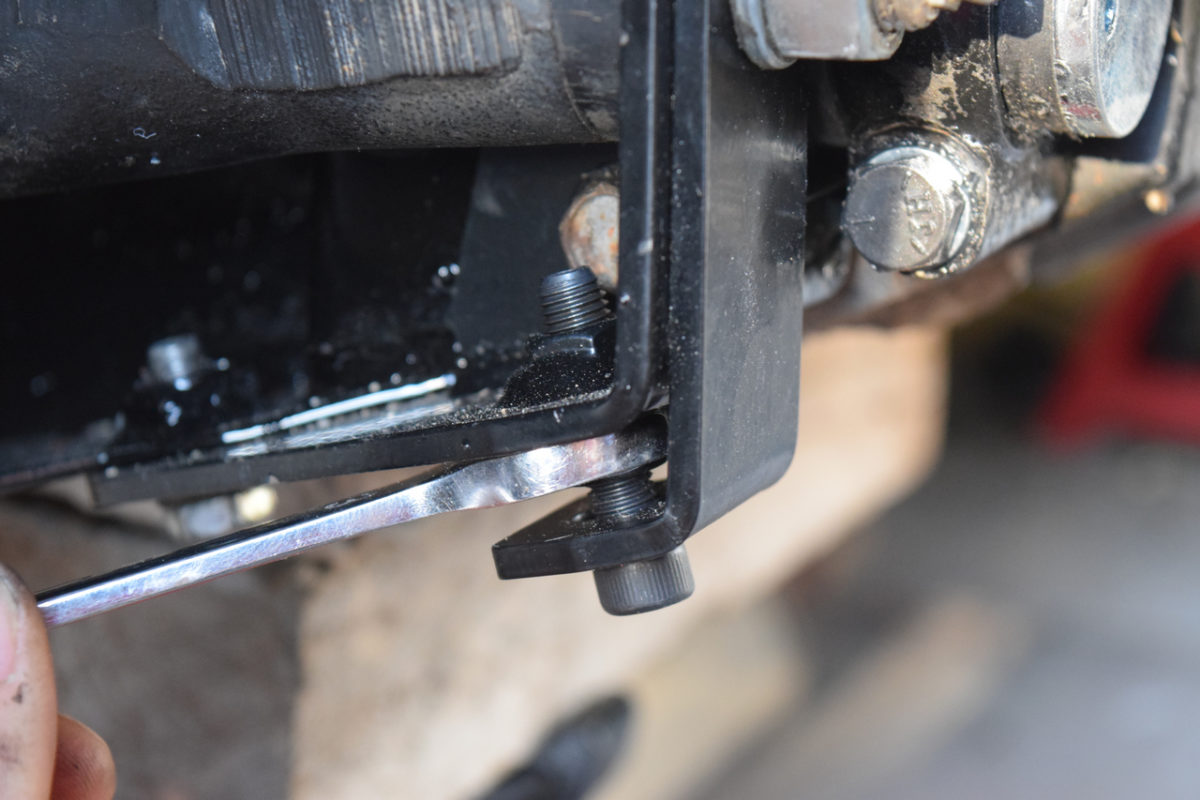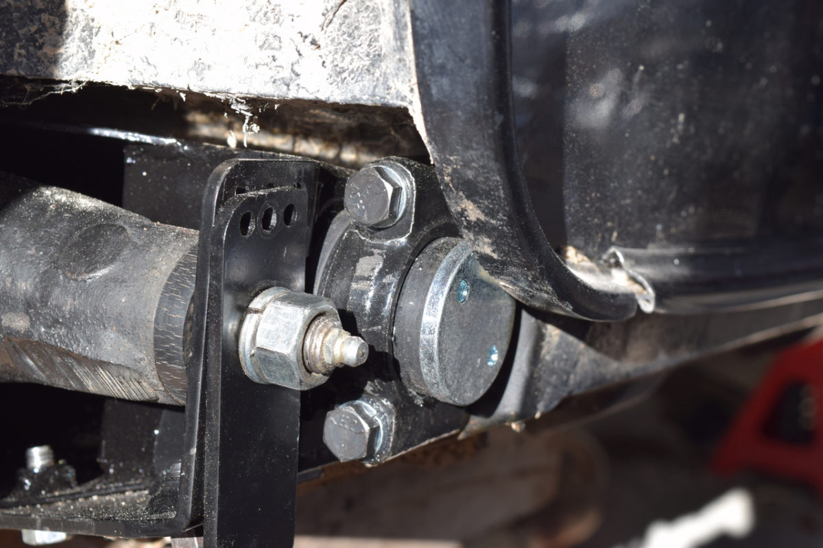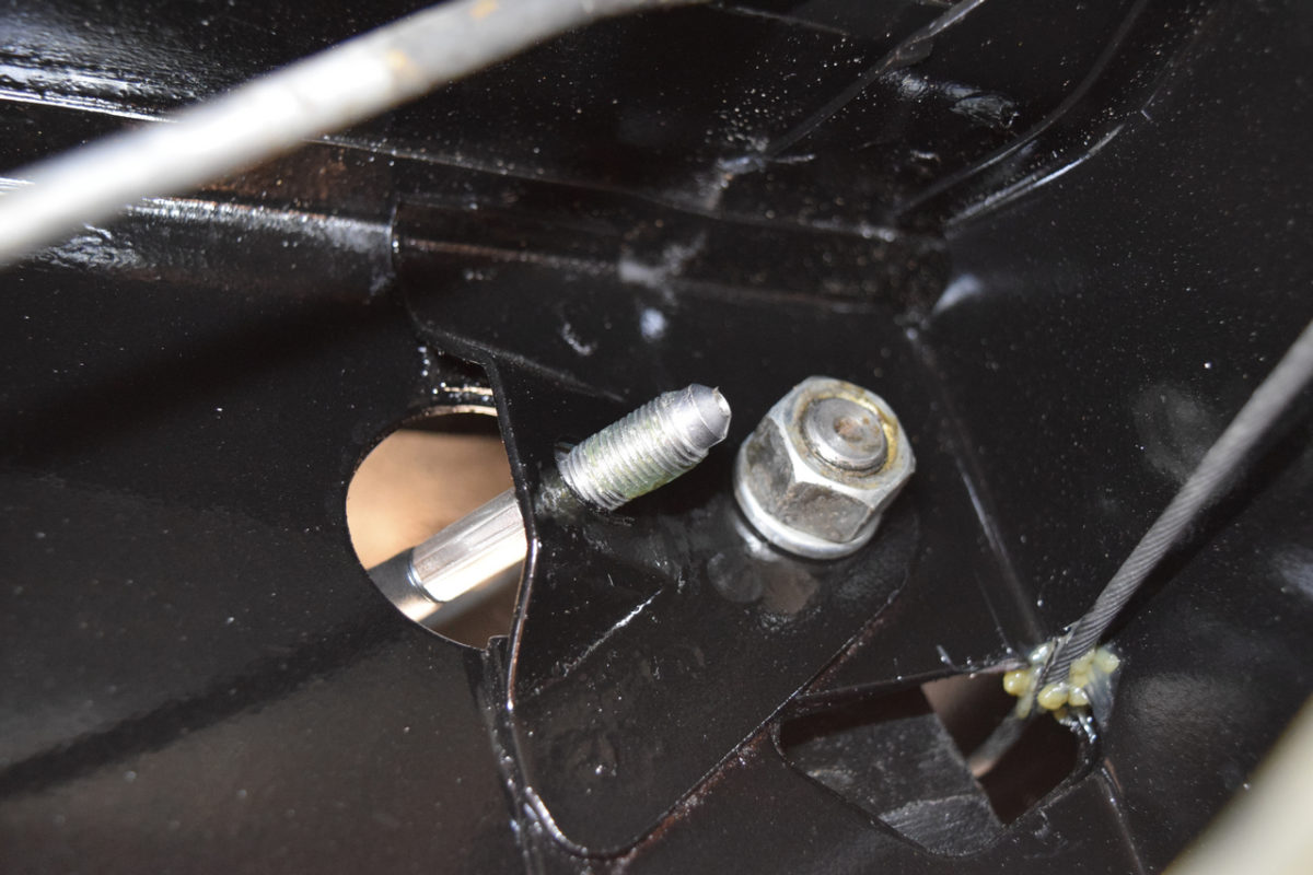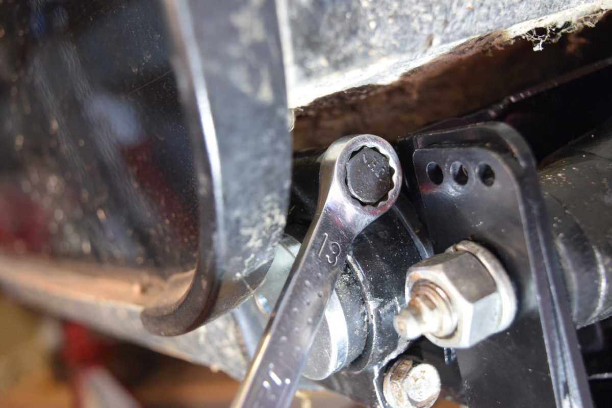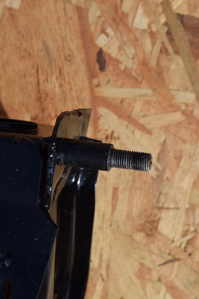 L’axe du bras de suspension est fixé à son extrémité extérieure sur son support et à son extrémité intérieure sur l’intérieur du berceau. Il nous faut donc desserrer simultanément les écrous de part et d’autre du bras.