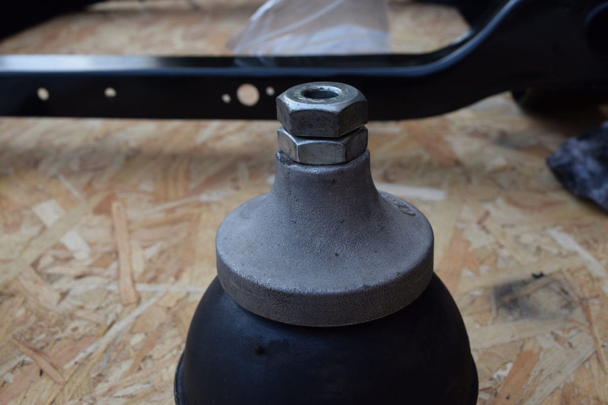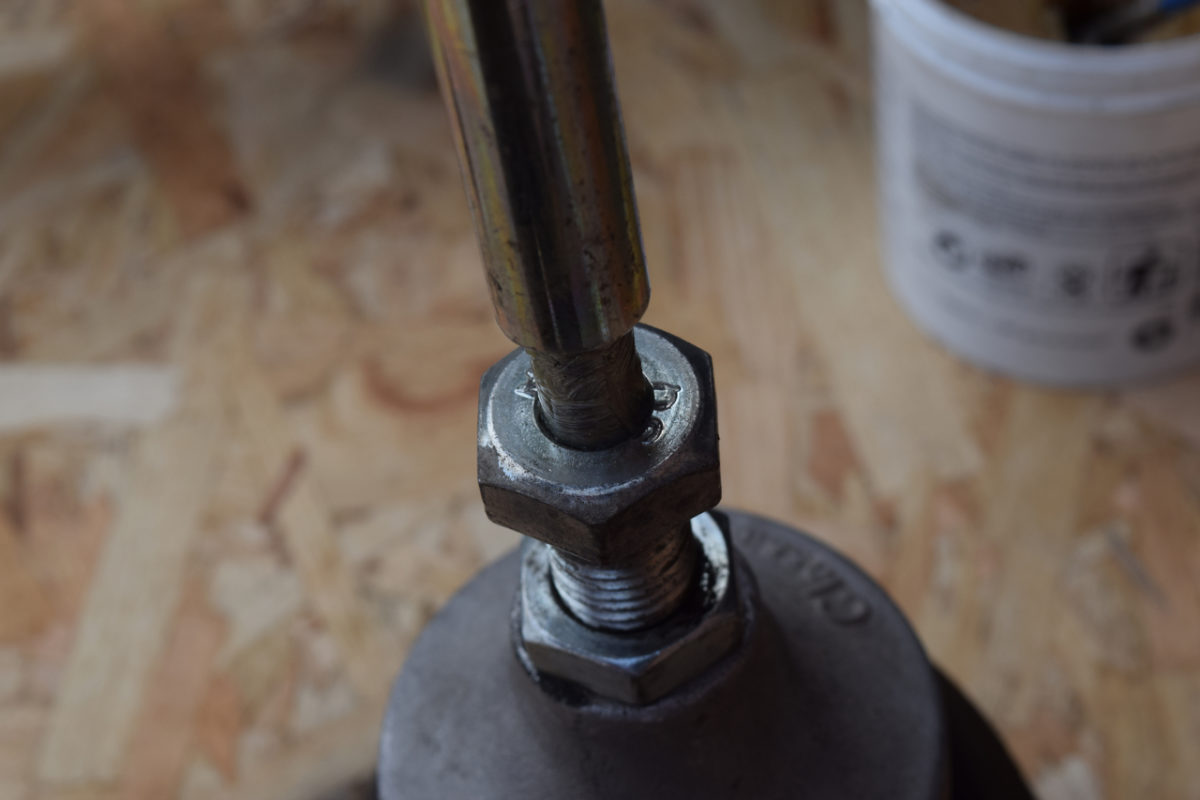 Mise en place du silentbloc, de la rondelle, de l’écrou puis serrage. Blocage avec le contre-écrou.