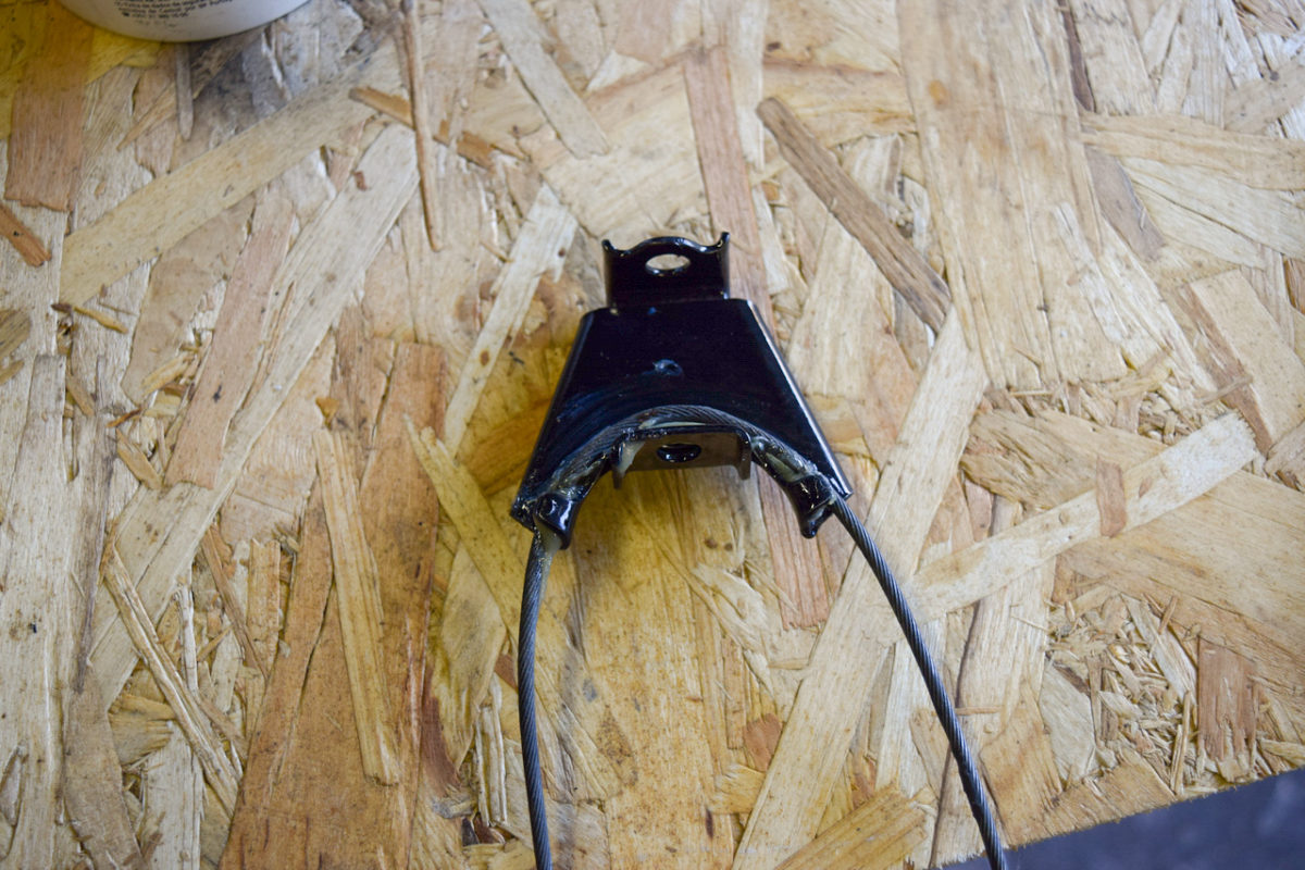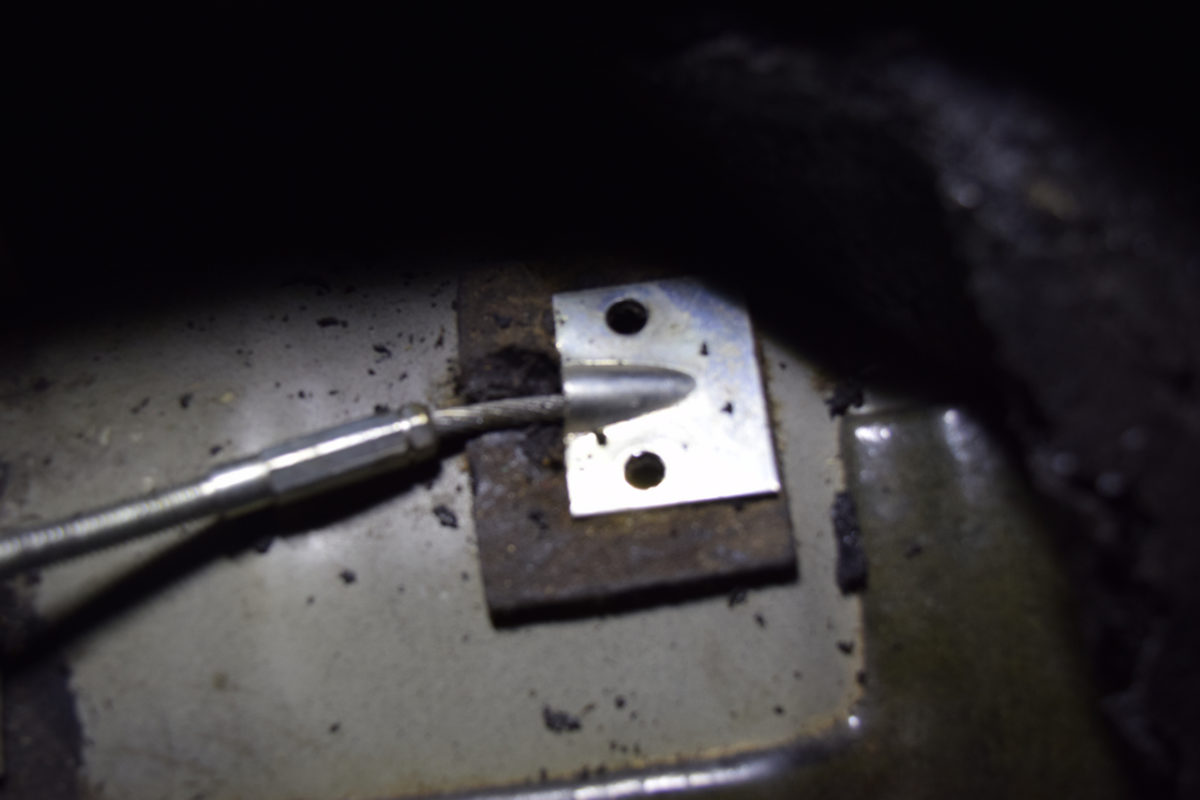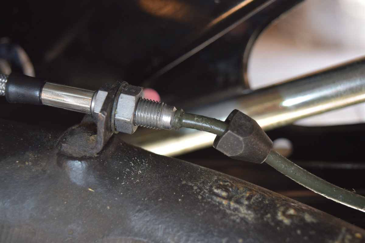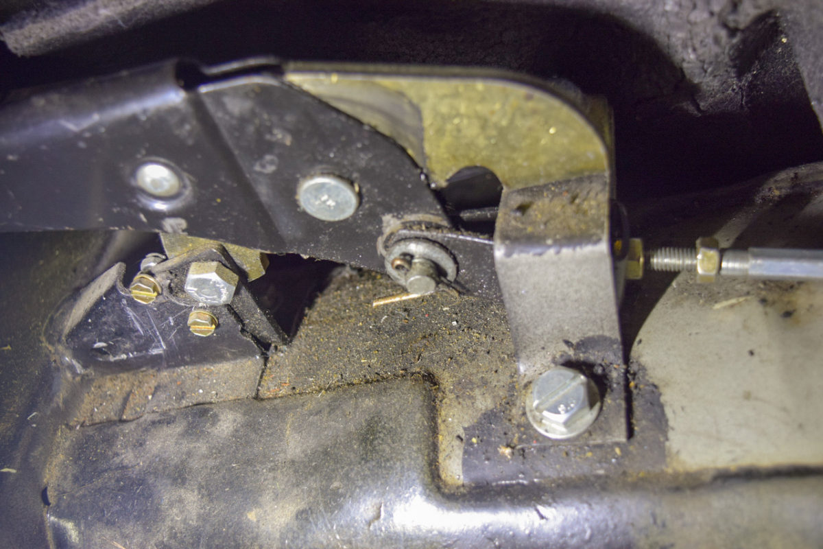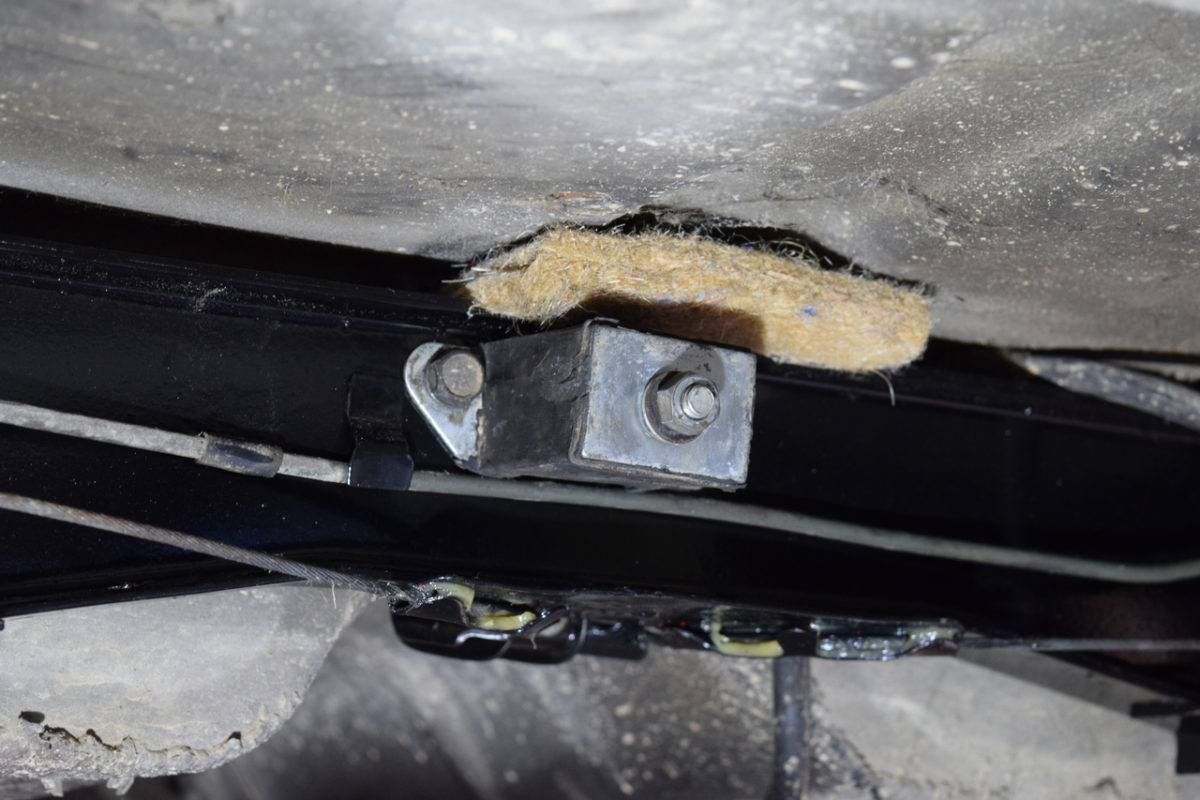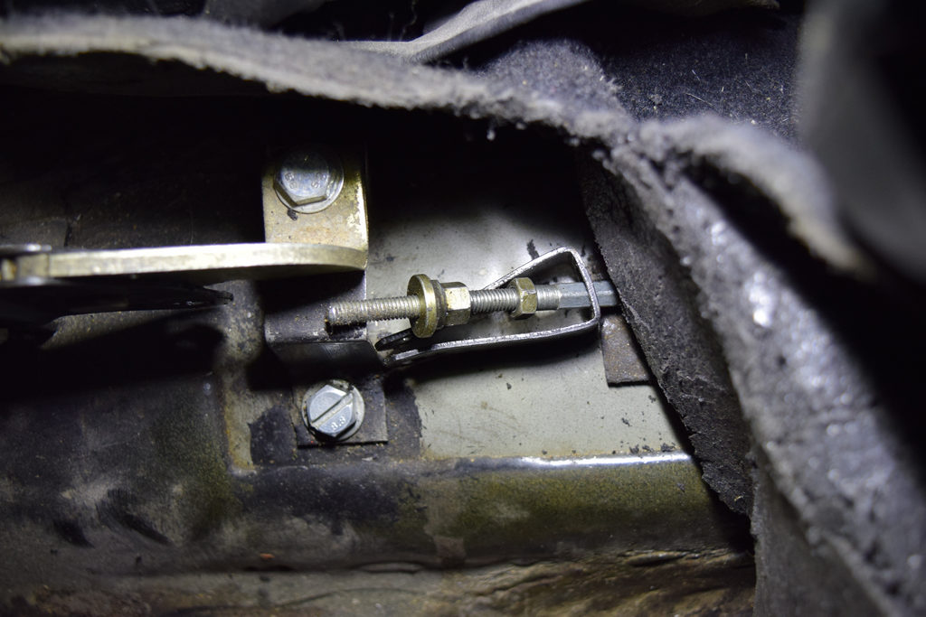 Il nous faut libérer le câble de frein à main pour pouvoir sortir le berceau. Pour cela, on passe dans l’habitacle et on va déconnecter le câble au niveau du levier de frein à main.