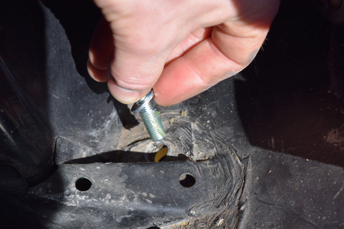 Insertion de la vis longue dans le trou positionné le plus en arrière (dans le coffre).