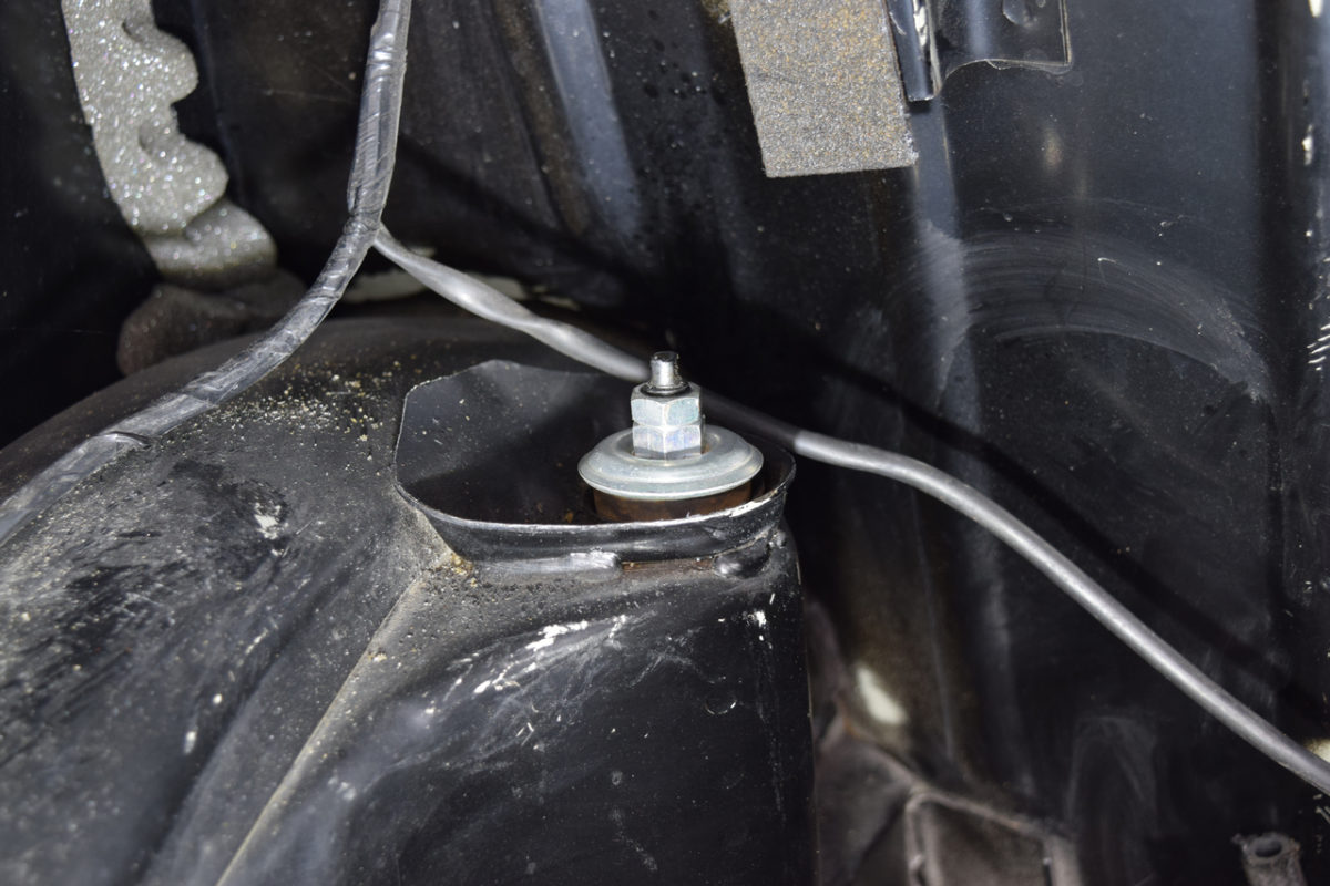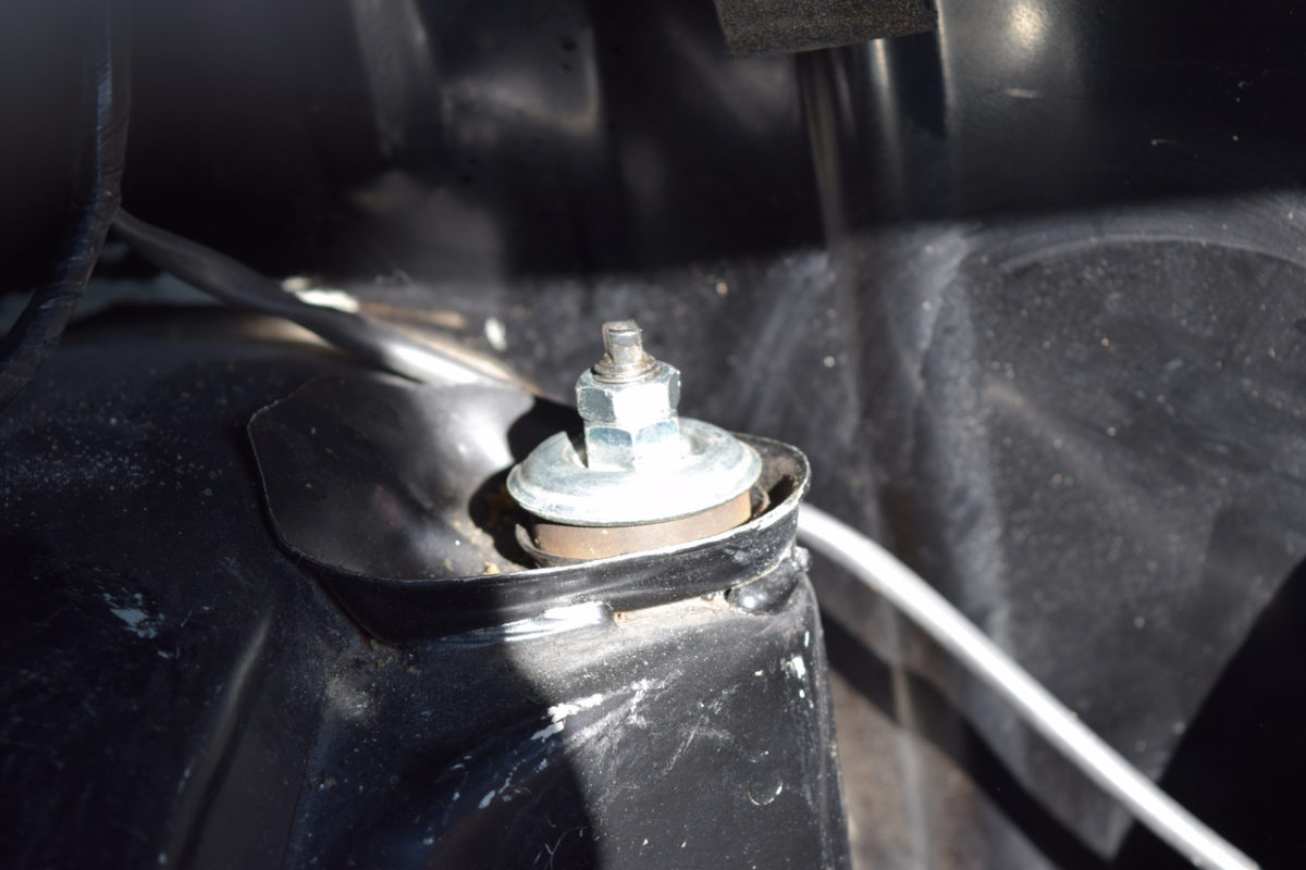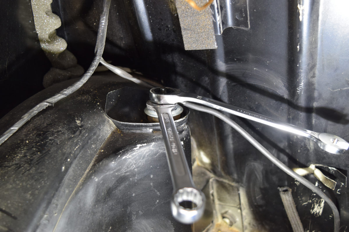 Il suffit simplement de déposer la fixation supérieure des amortisseurs se trouvant dans le coffre. Pour accéder à la fixation de l’amortisseur gauche, il nous faut d’abord déposer le réservoir d’essence.